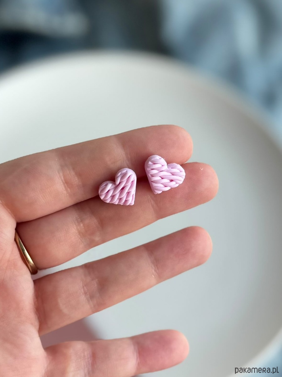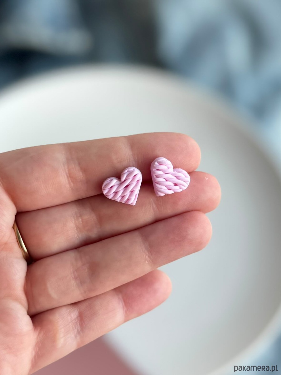 Kolczyki sztyfty różowe dziergane serduszka
