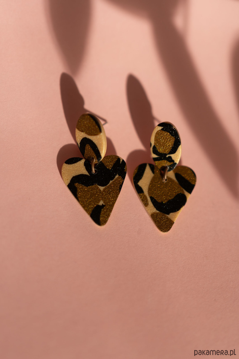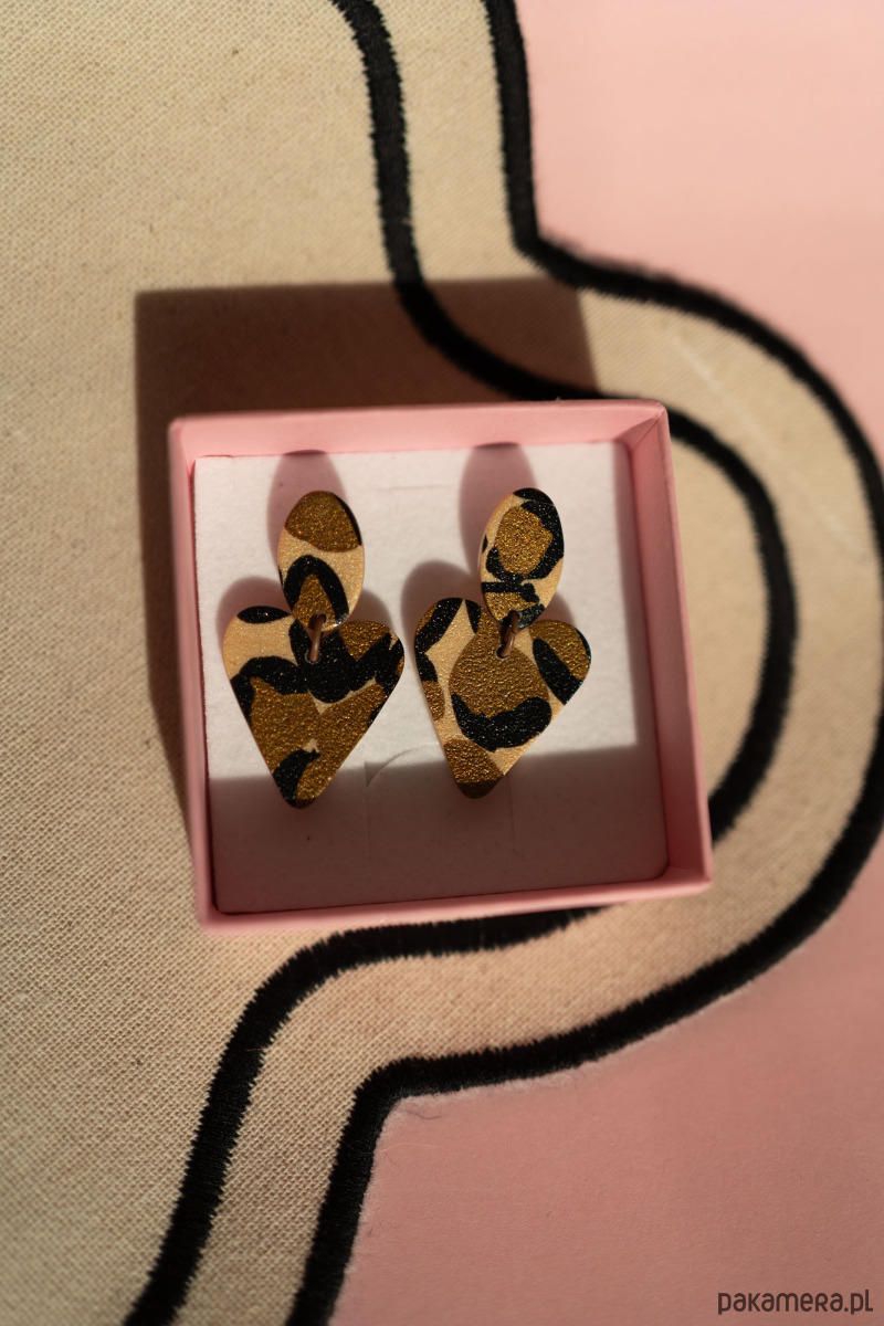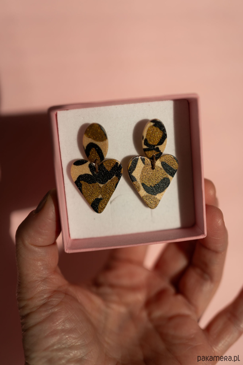Wiszące kolczyki SERCA w panterkowy wzór. Każdy element jest wykonany, wycinany i szlifowany ręcznie z dbałością o każdy szczegół.Wzór ze zdjęcia jest wzorem poglądowym. Każda para różni się nieznacznie od siebie - magia rękodzieła :)
