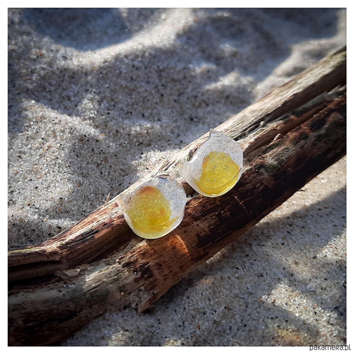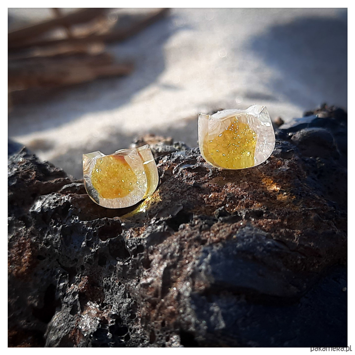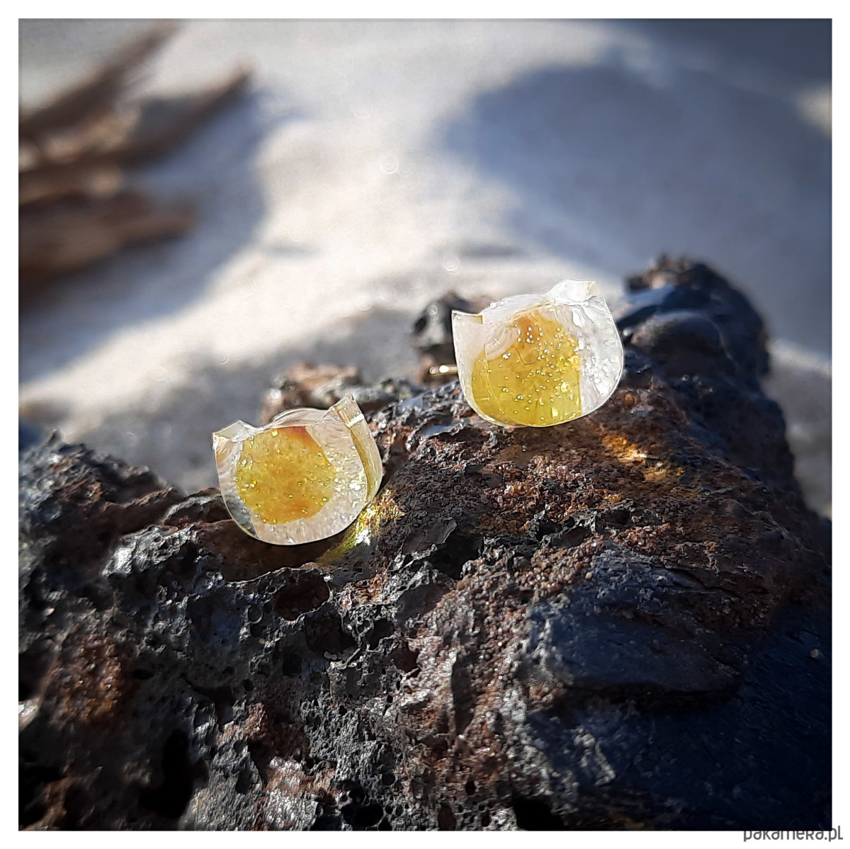 Kolczyki sztyfty z żywicy epoksydowej z bursztynem na perłowym tle.