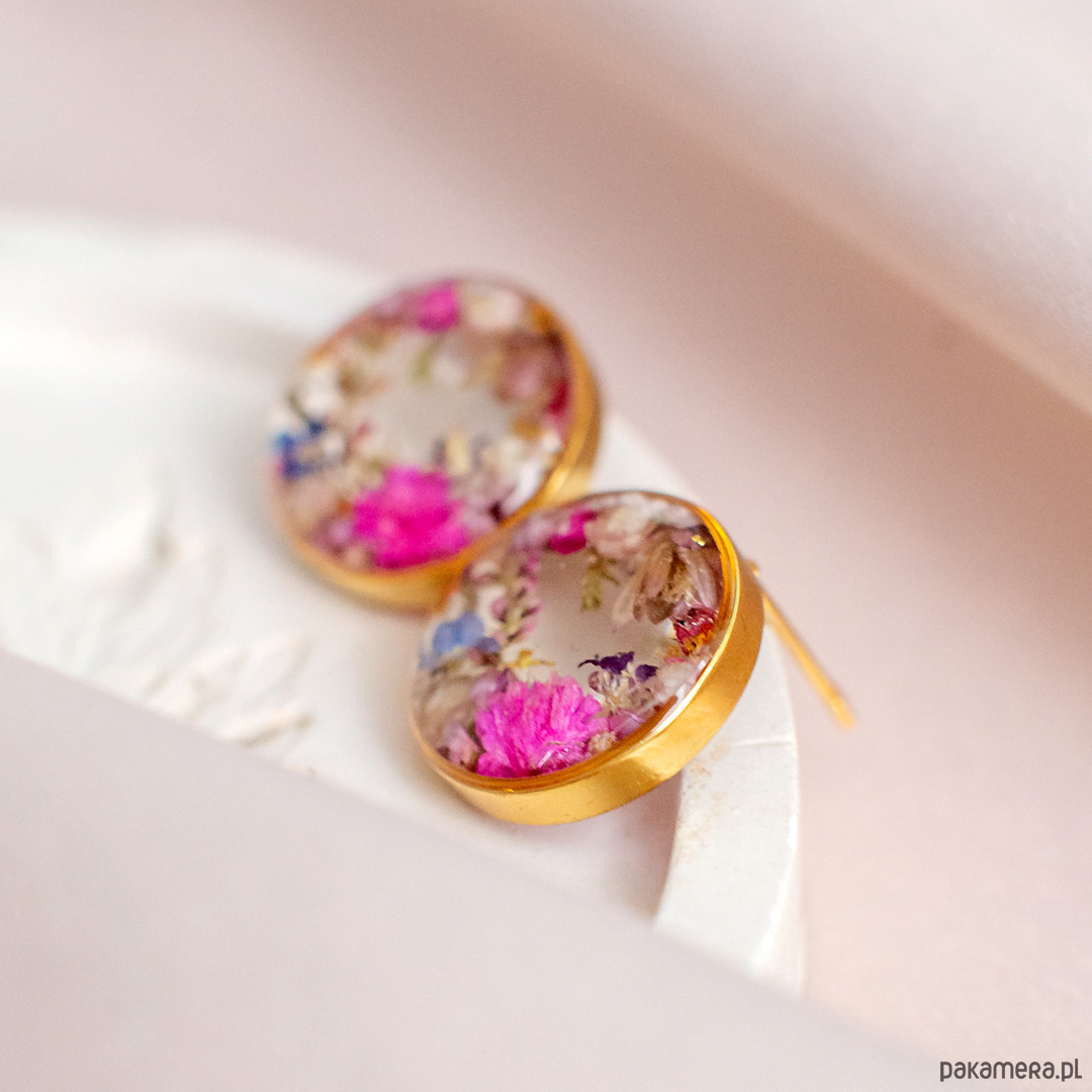 Kolczyki wykonany jest z żywicy epoksydowej z wykorzystaniem suszonych kwiatów. Metalowe elementy to stal nierdzewna szlachetna chirurgiczna.