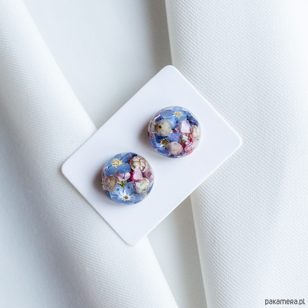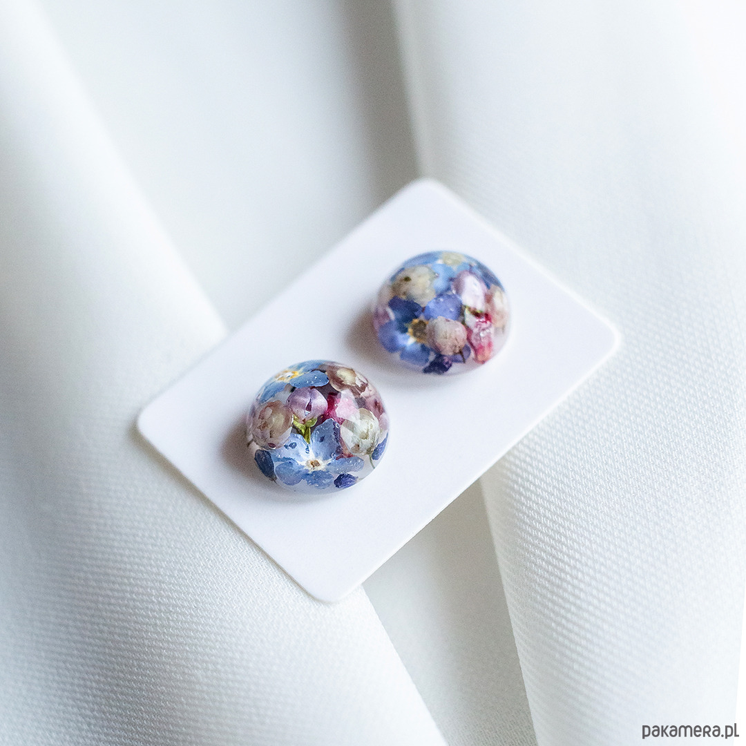 Kolczyki wykonany jest z żywicy epoksydowej z wykorzystaniem suszonych kwiatów. Metalowe elementy to stal nierdzewna szlachetna chirurgiczna.