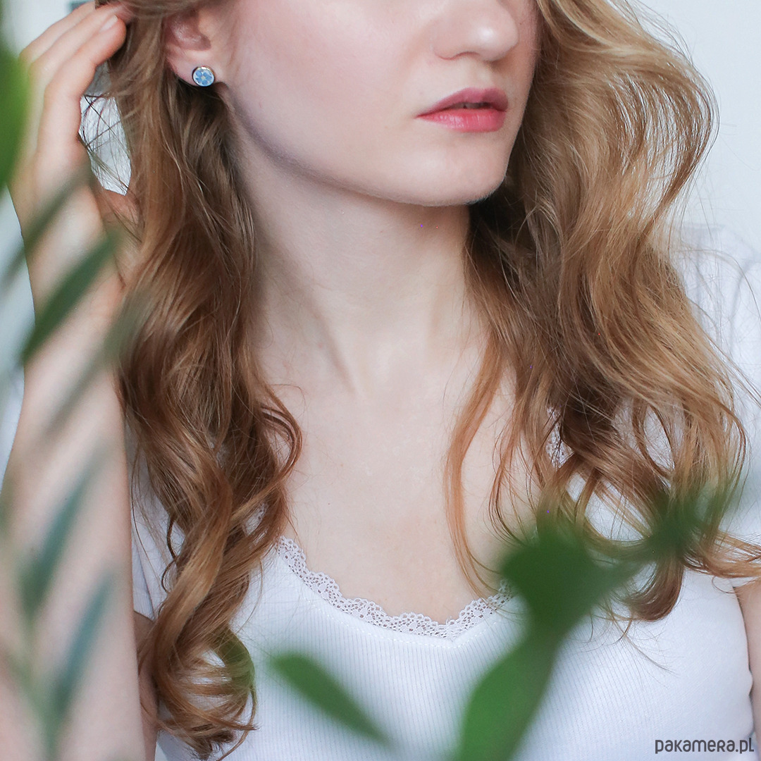 Kolczyki wykonany jest z żywicy epoksydowej z wykorzystaniem suszonych kwiatów. Metalowe elementy to stal.