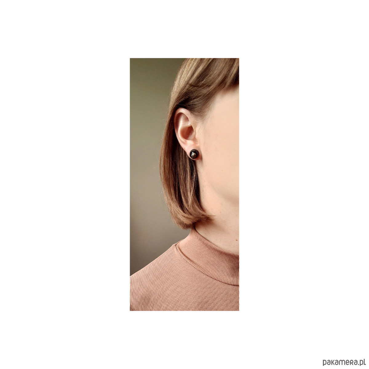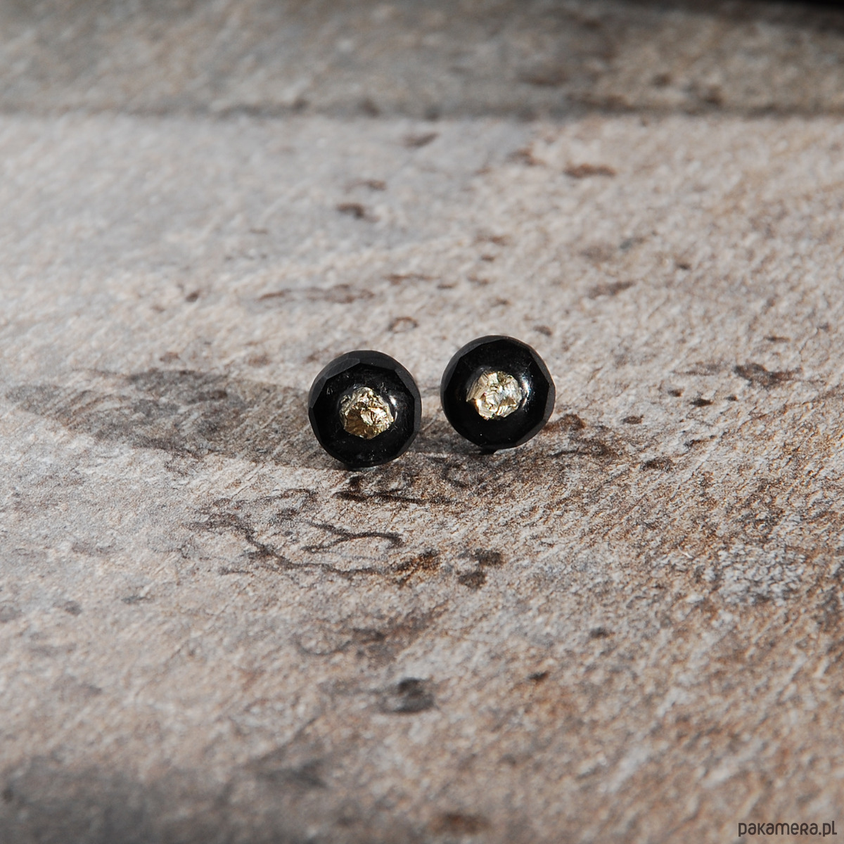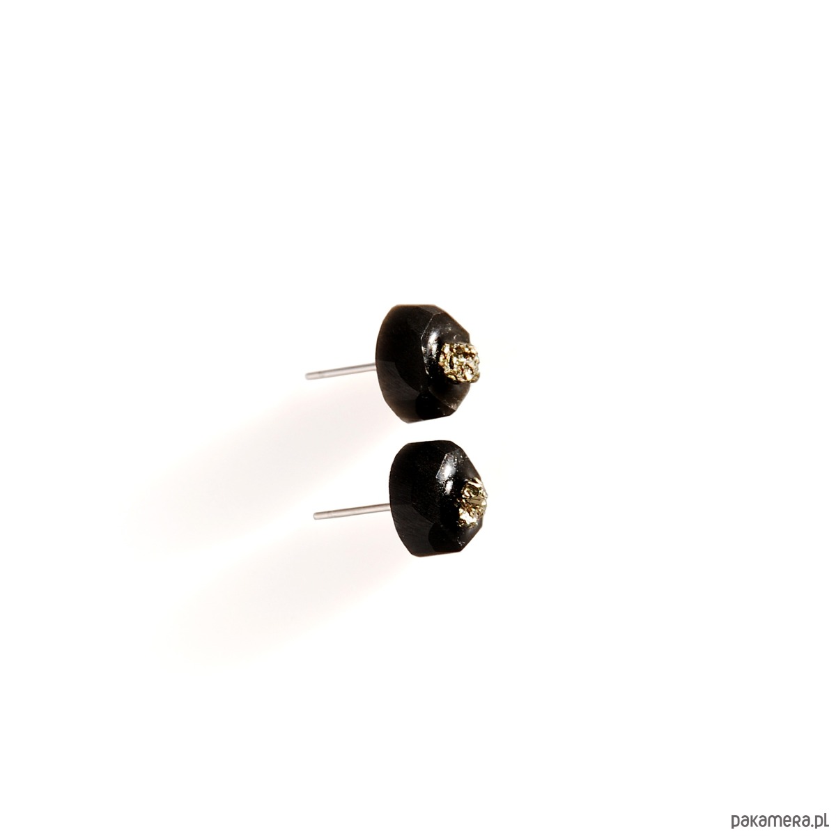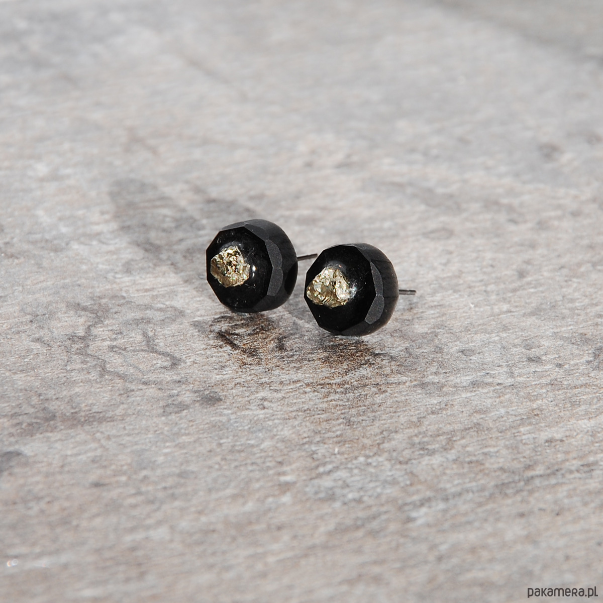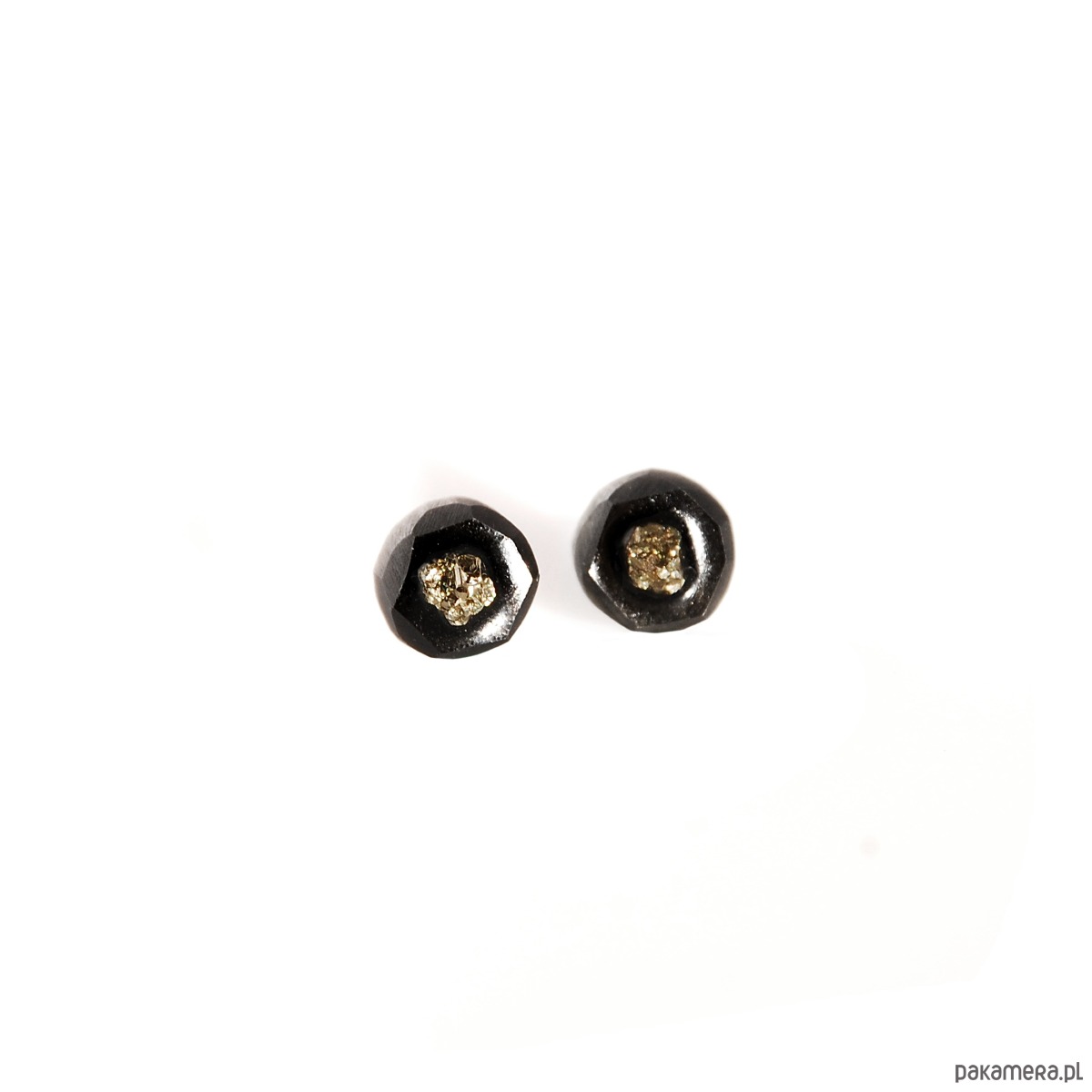 Kolczyki sztyfty wykonane z bryłki naturalnego pirytu i czarnej żywicy jubilerskiej. Średnica około 10mm, wysokość 8mm. Sztyft i zatyczki ze stali chirurgicznej (antyalergiczne).