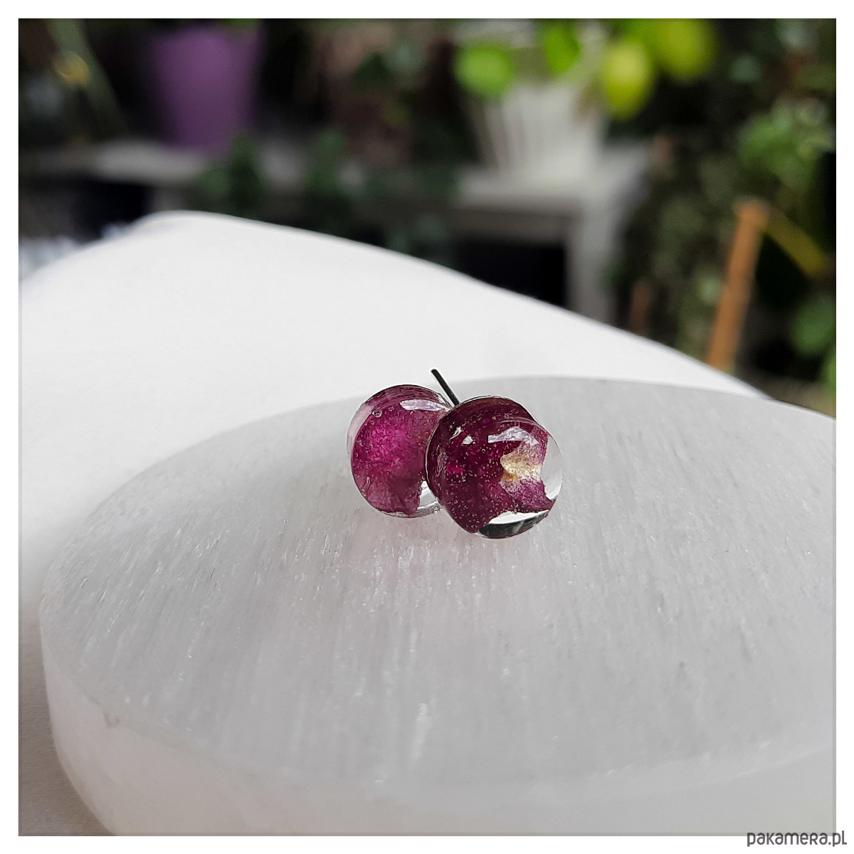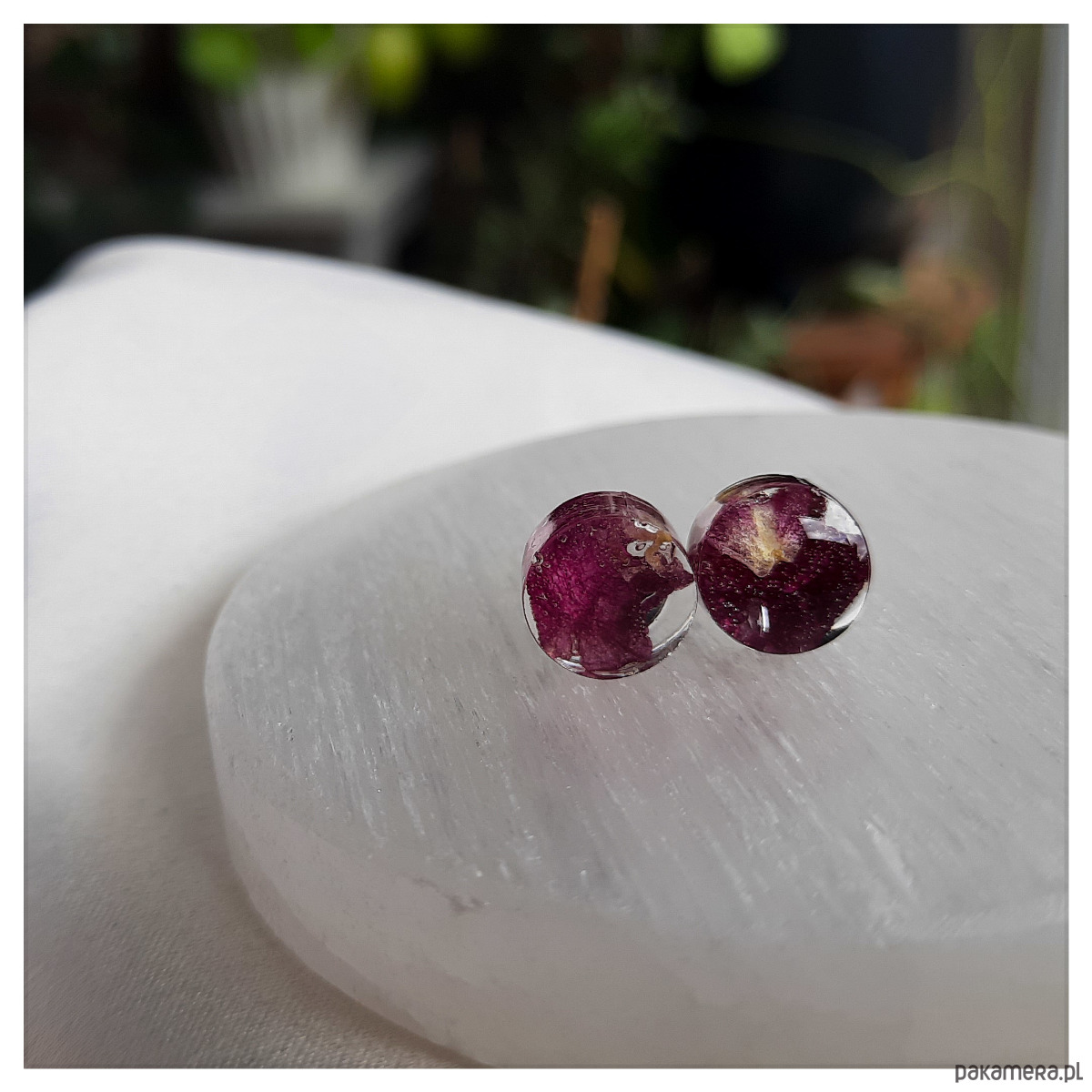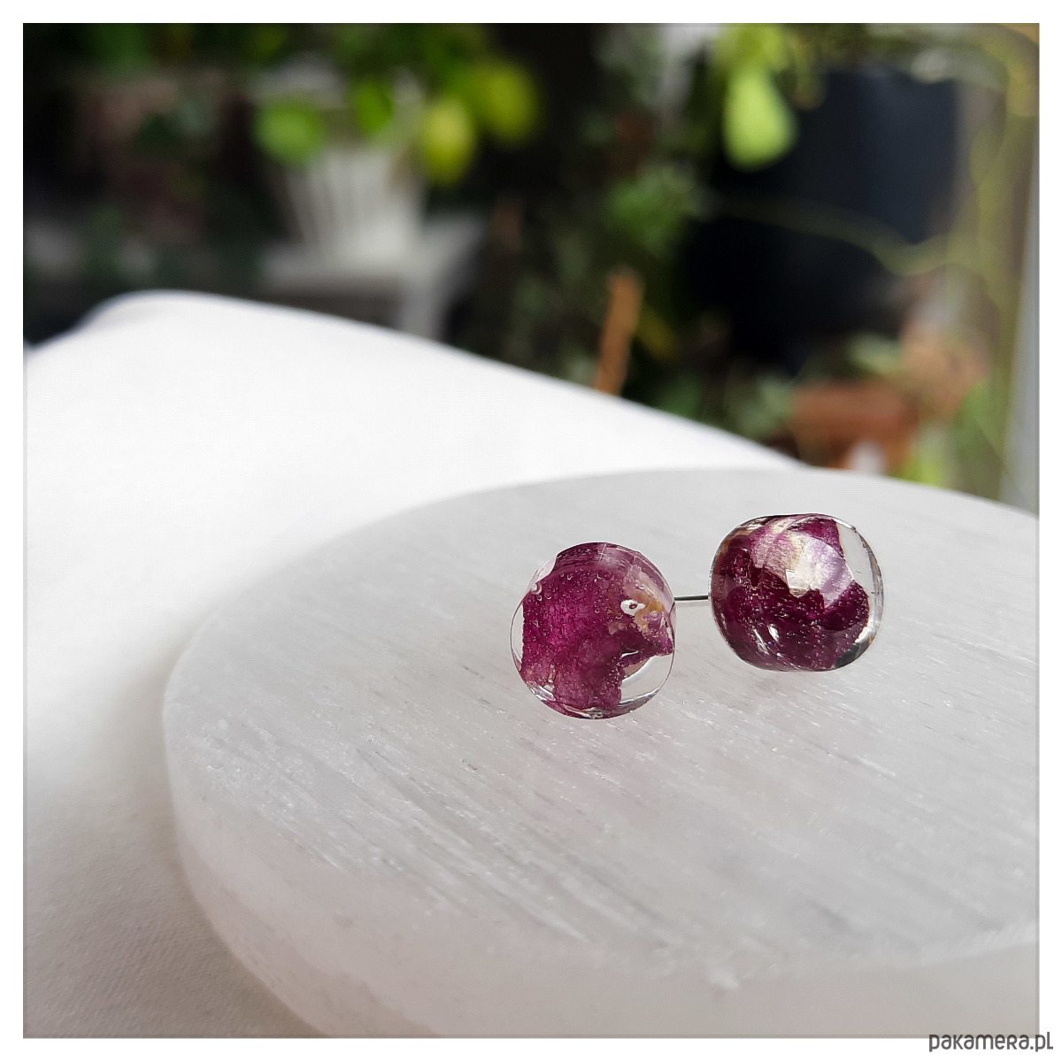 Kolczyki sztyfty z żywicy epoksydowej z zatopionymi płatkami jasno czerwonej róży.
