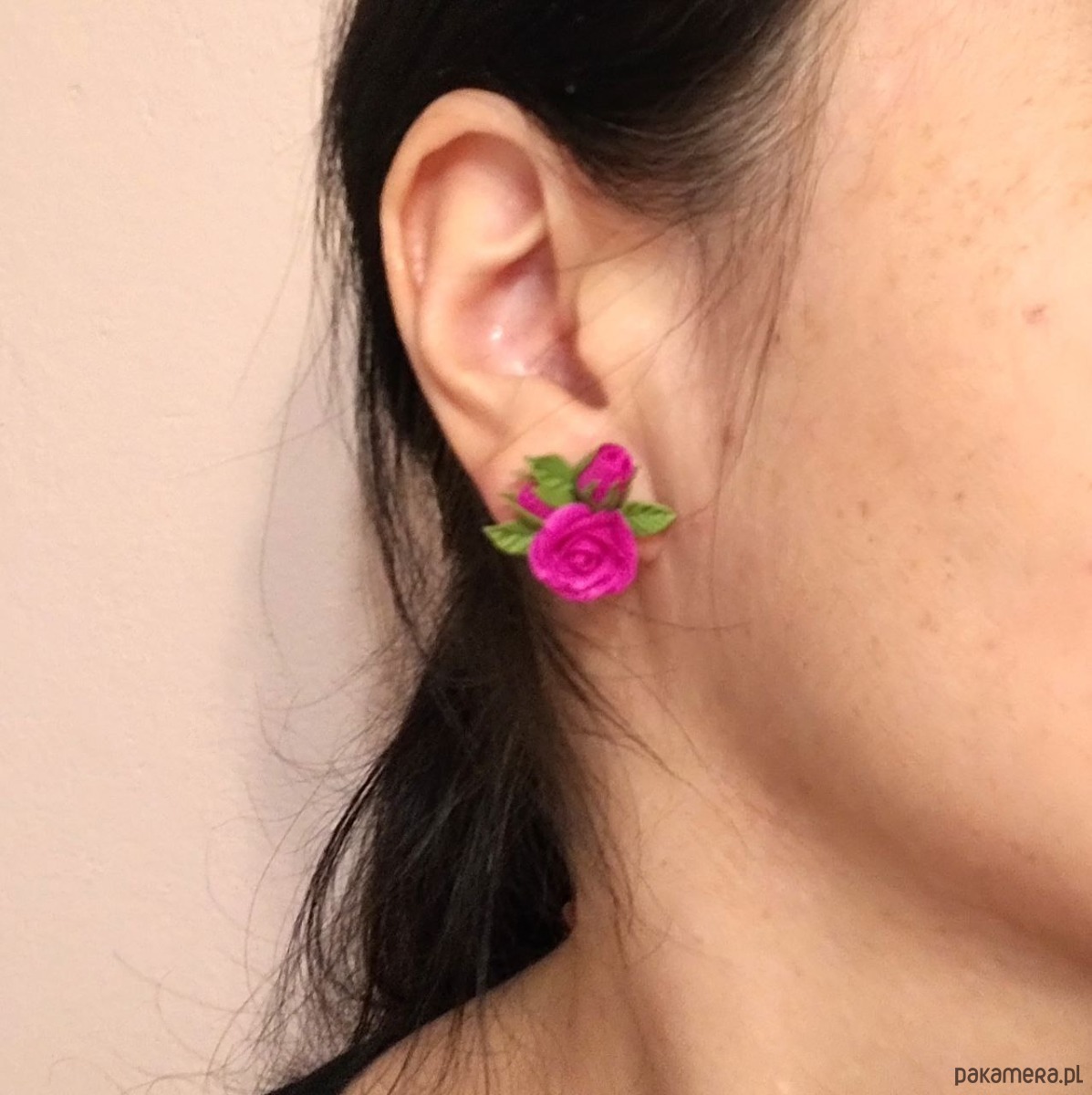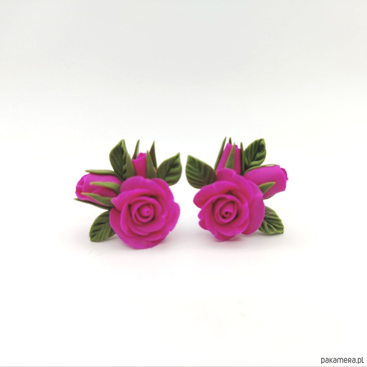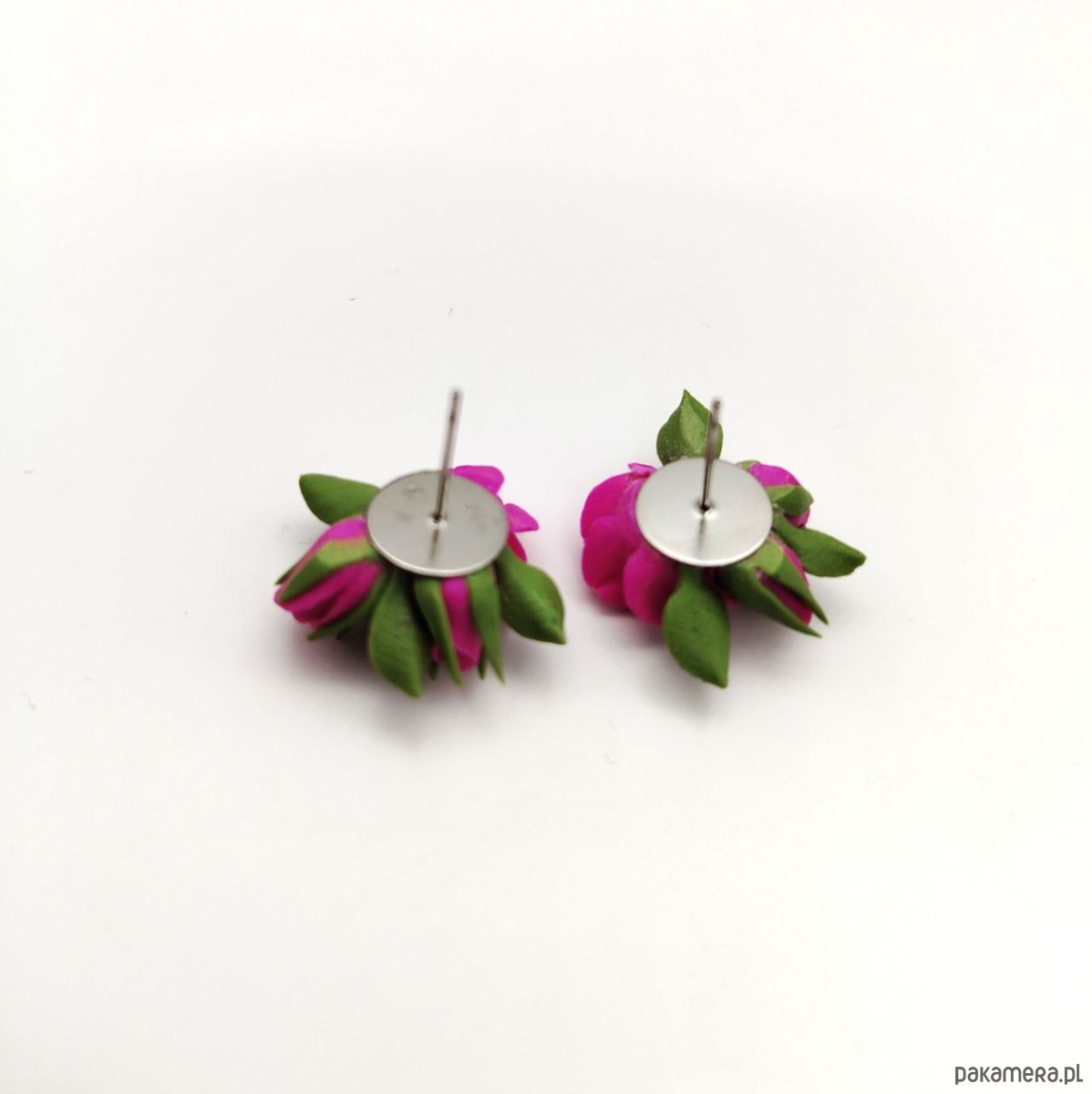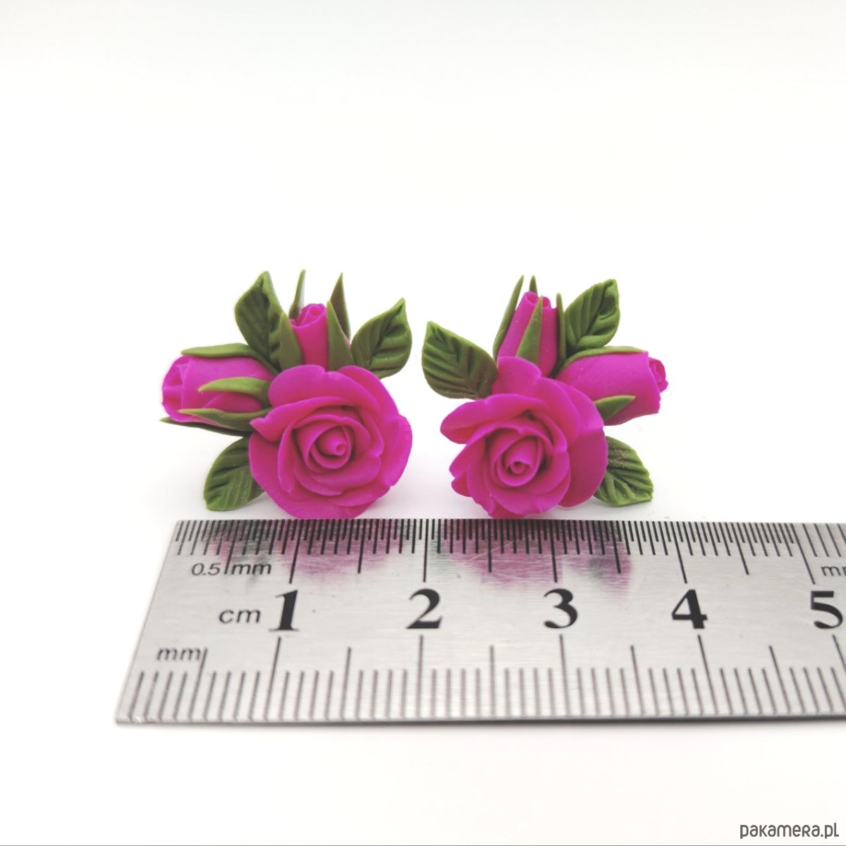 Kolczyki sztyfty z różowymi różami, pączkami i listkami, ręcznie robione