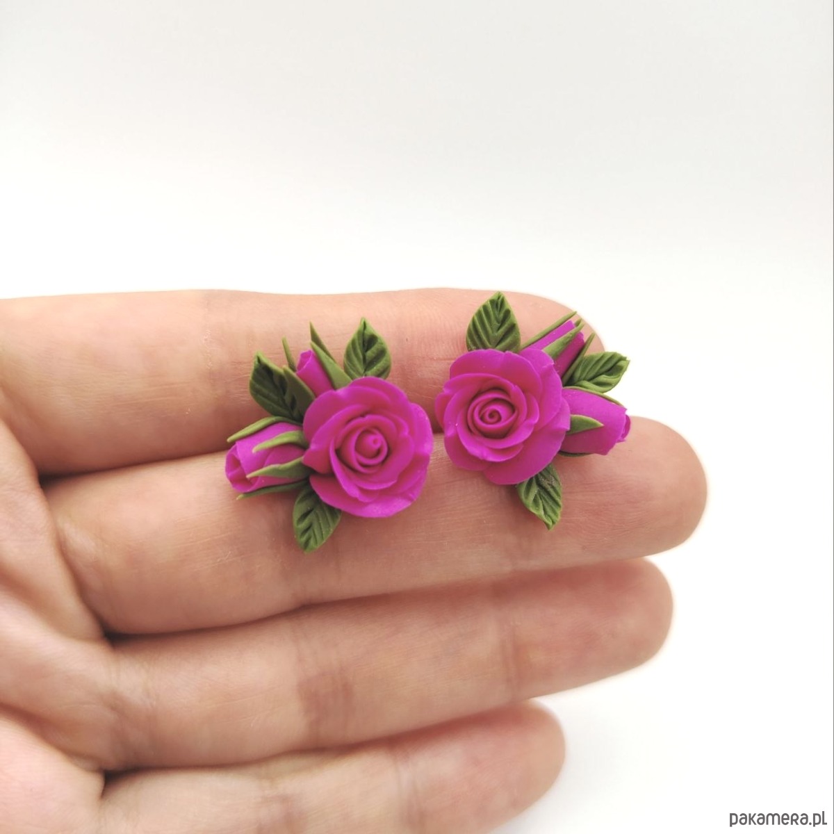 Delikatne kolczyki-sztyfty z różowymi różyczkami, maleńkimi pączkami i realistycznymi listkami, wykonane w całości ręcznie z glinki polimerowej. Każdy element jest starannie wymodelowany, dzięki czemu biżuteria wygląda naturalnie i subtelnie.