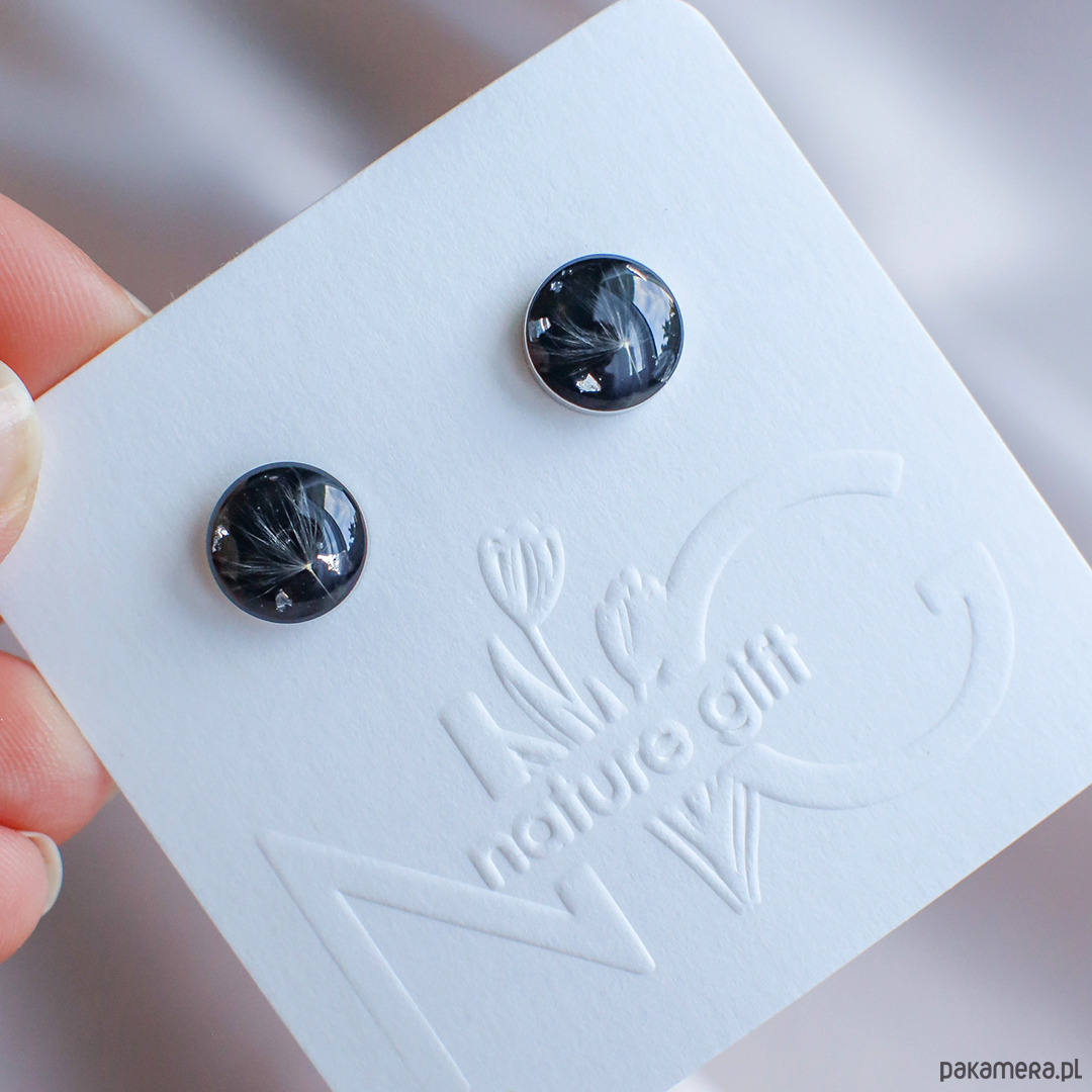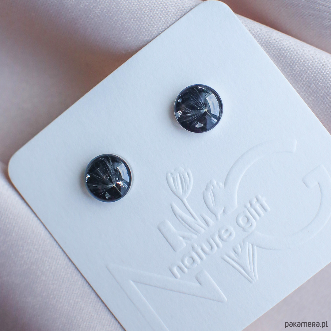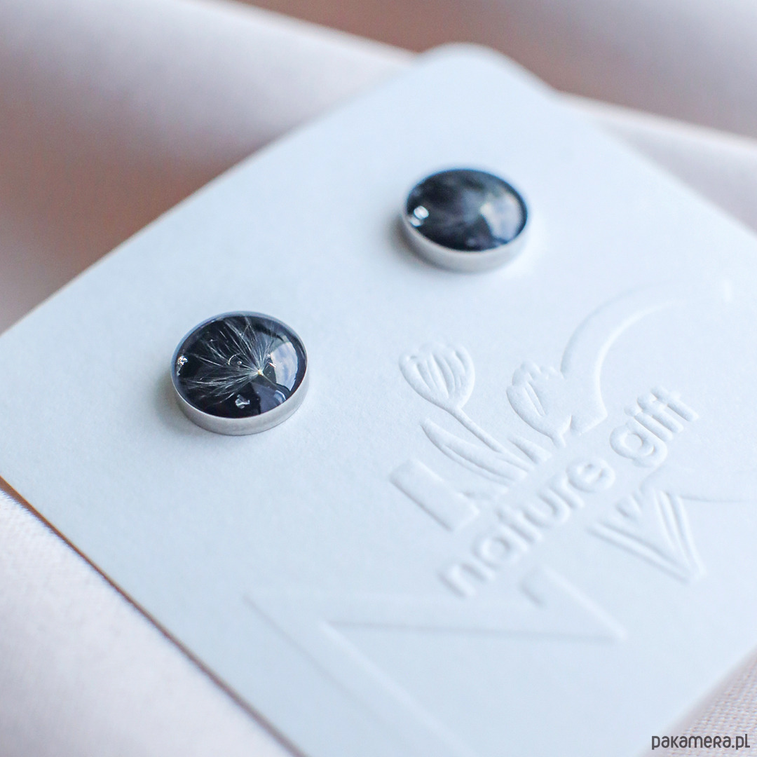 Kolczyki wykonany jest z żywicy epoksydowej z wykorzystaniem suszonych kwiatów. Metalowe elementy to stal.
