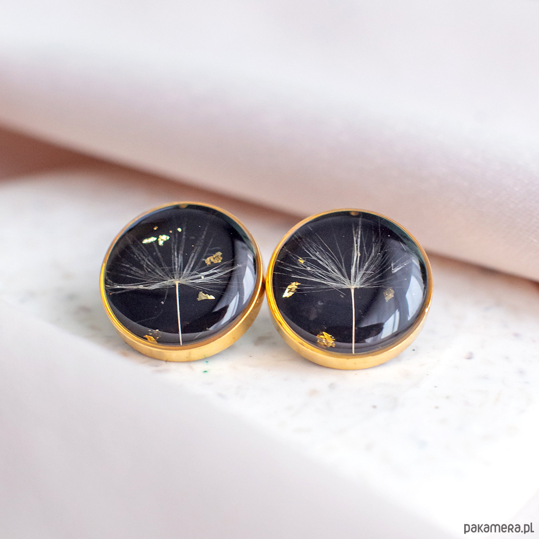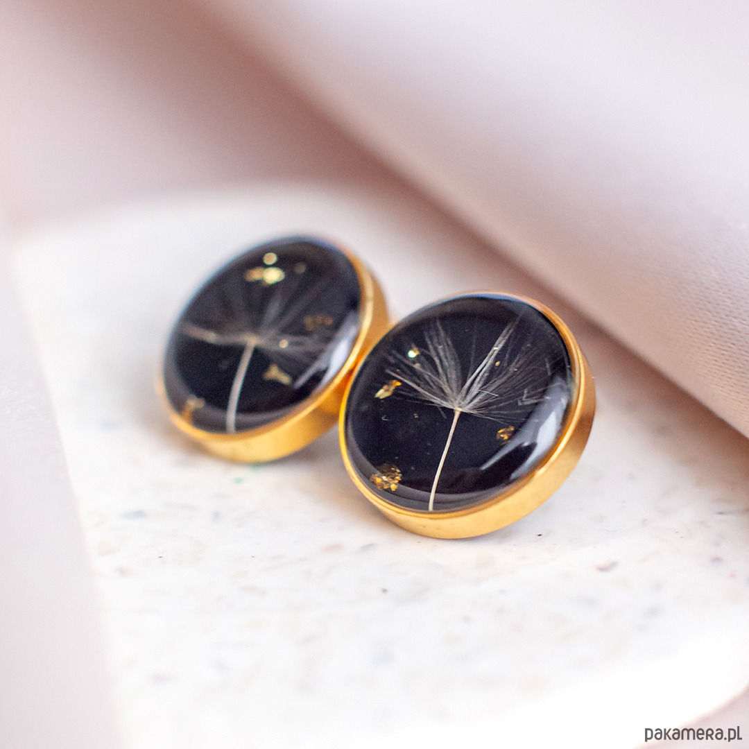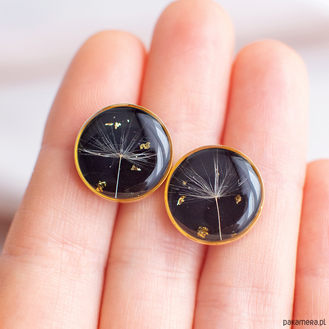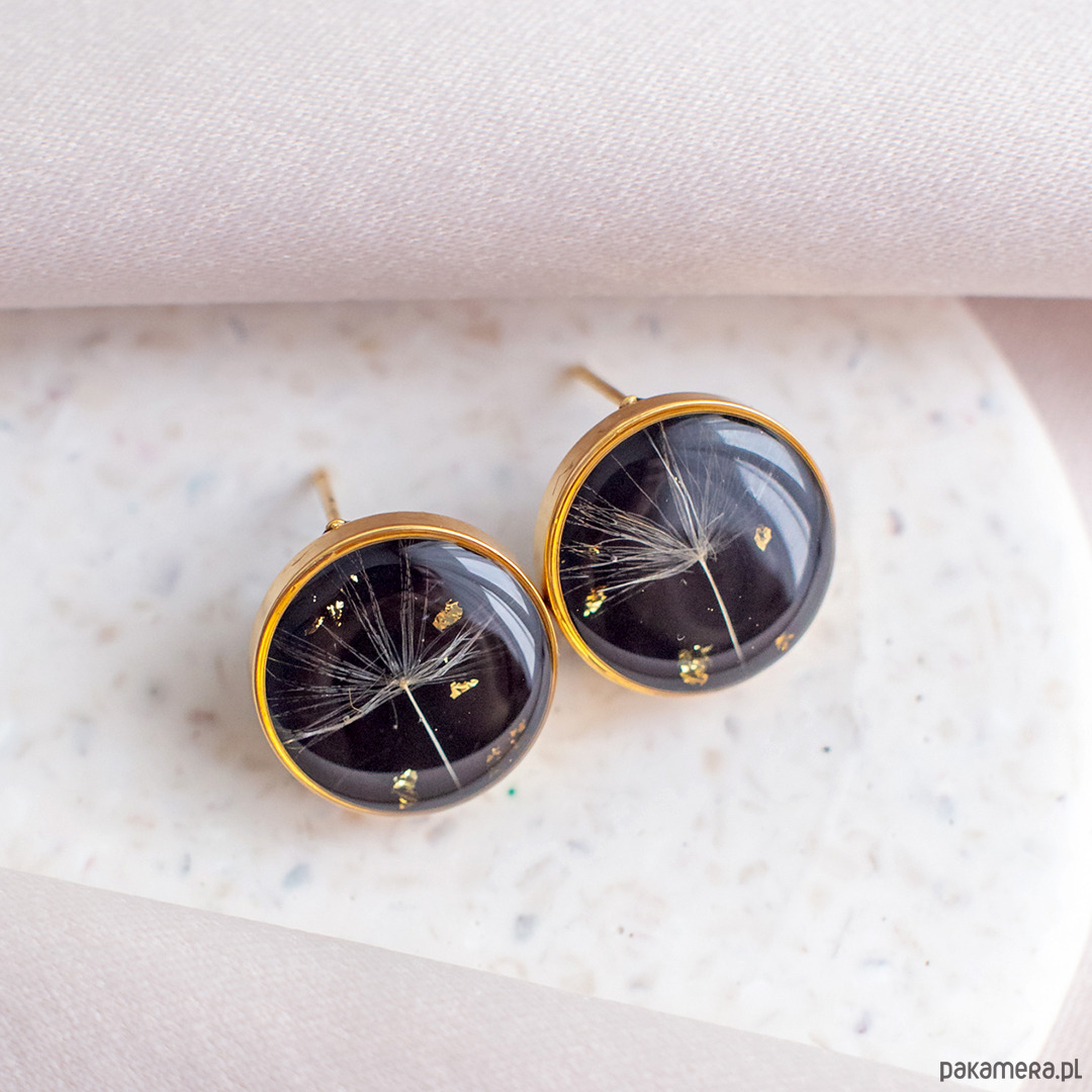 Kolczyki wykonany jest z żywicy epoksydowej z wykorzystaniem suszonych kwiatów. Metalowe elementy to stal.