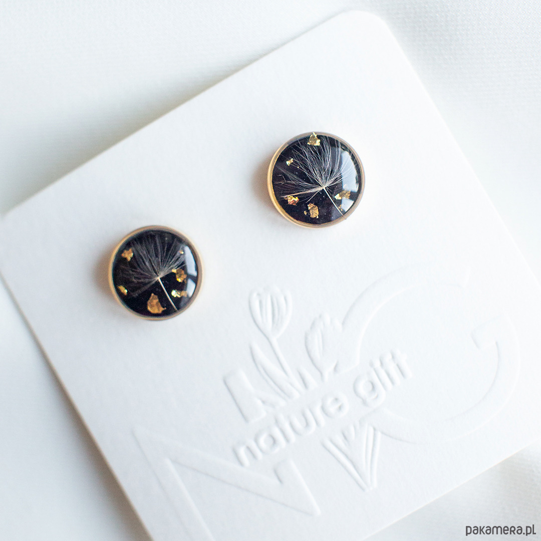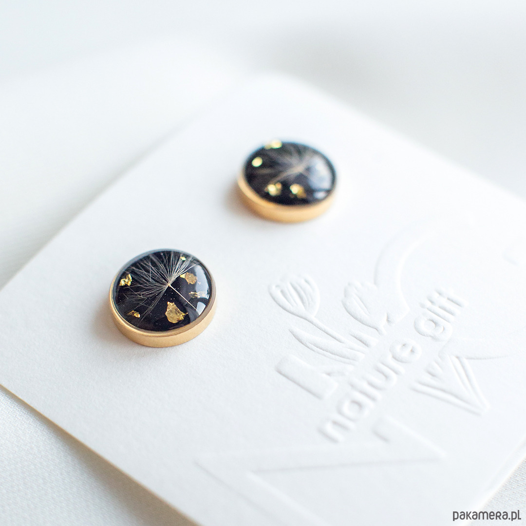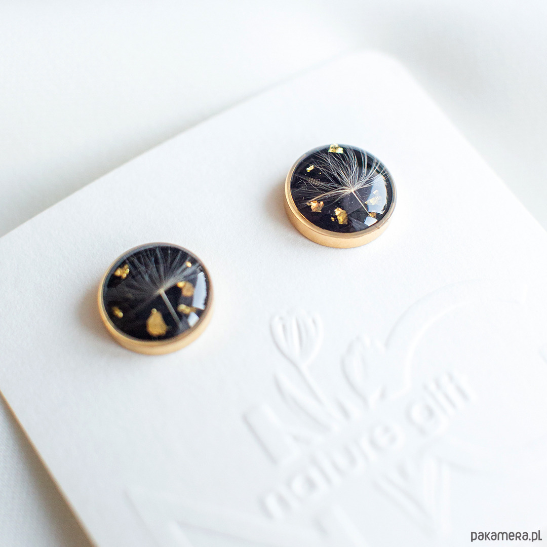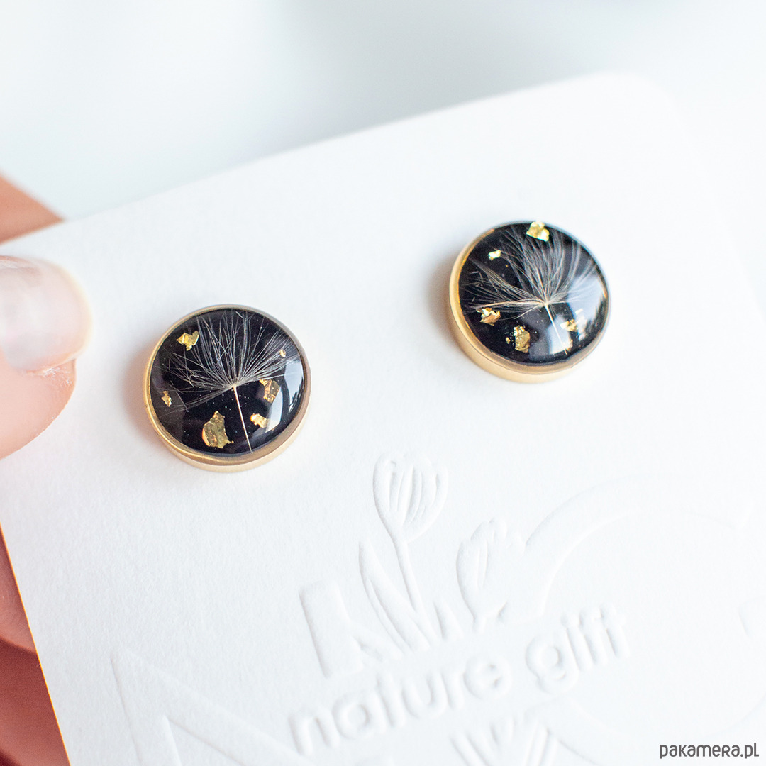 Kolczyki wykonany jest z żywicy epoksydowej z wykorzystaniem suszonych kwiatów. Metalowe elementy to stal.