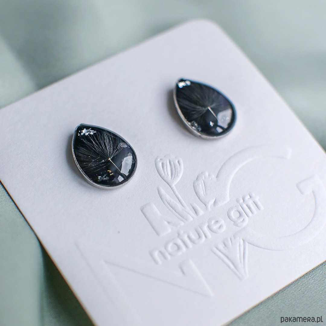 Kolczyki wykonany jest z żywicy epoksydowej z wykorzystaniem suszonych kwiatów. Metalowe elementy to stal.