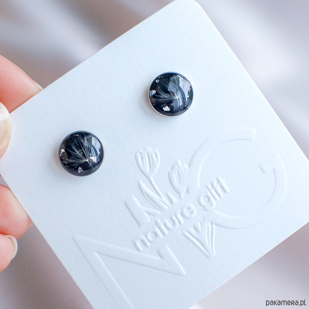 Kolczyki wykonany jest z żywicy epoksydowej z wykorzystaniem suszonych kwiatów. Metalowe elementy to stal.