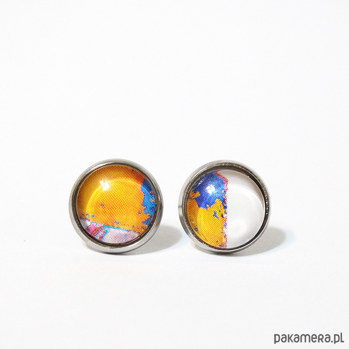 Grafika ukryta w delikatnych, małych kolczykach, pod osłoną przeźroczystego półokrągłego szkiełka.