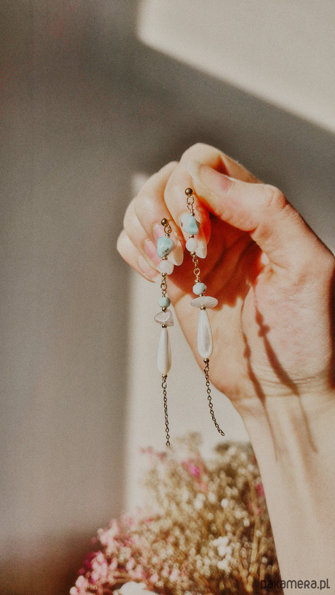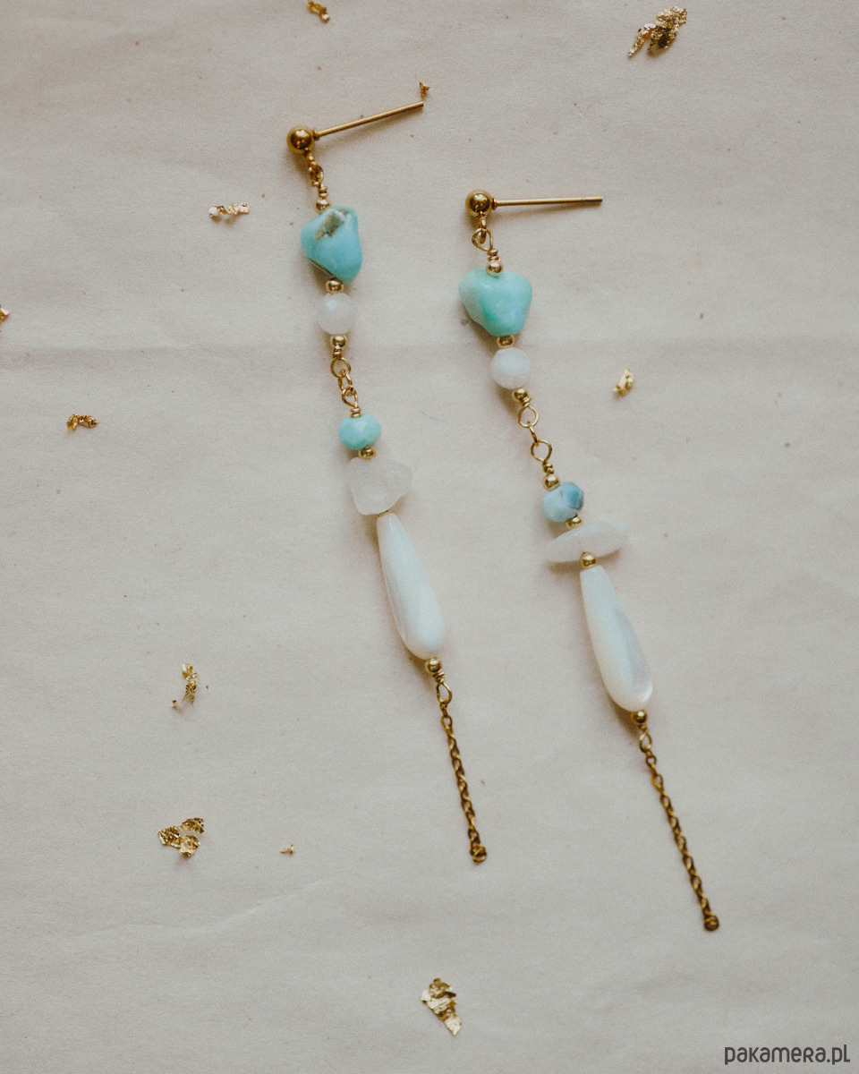 Długie wiszące kolczyki Talayla ˖᯽ ݁˖ Dla wróżek w ciele człowieka. Utkanie ze złotej stali i kryształów - białego kamienia księżycowego i morskiego larimaru.
