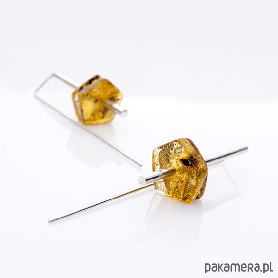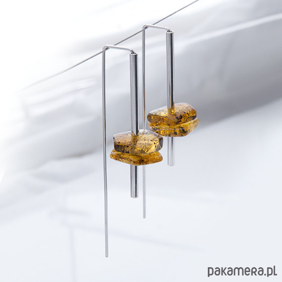 Nowoczesne, geometryczne kolczyki wykonane ze srebra 925 i bursztynów bałtyckich.