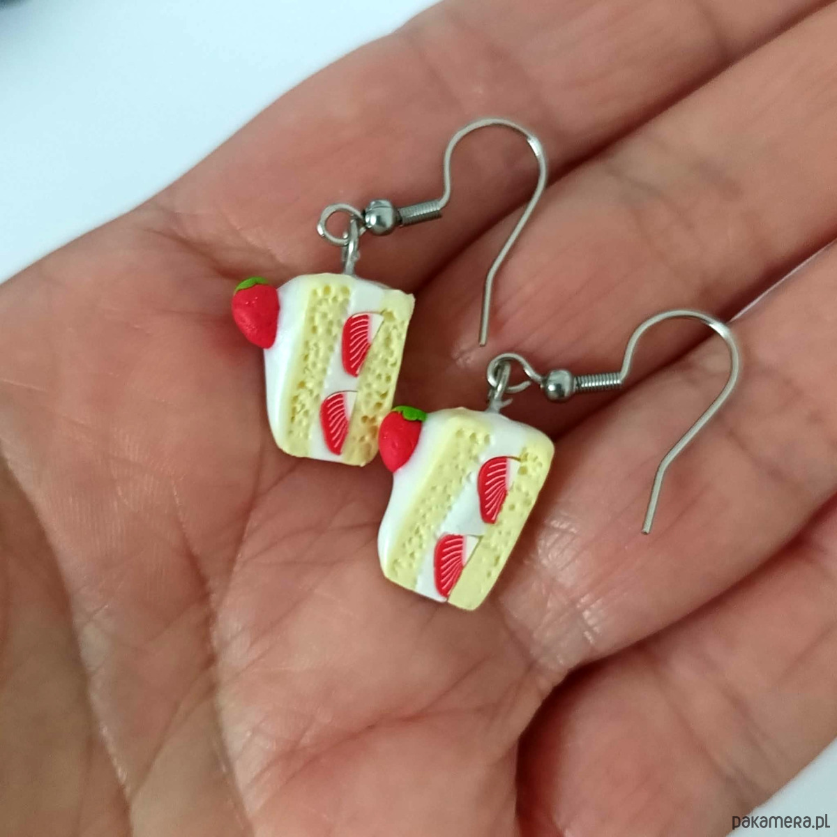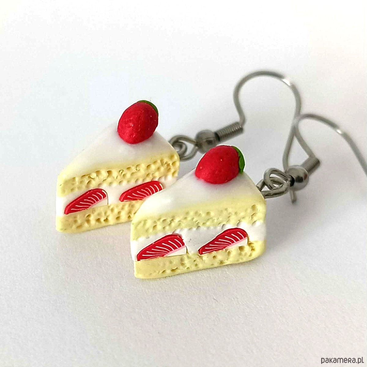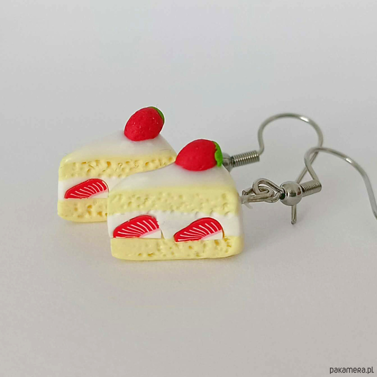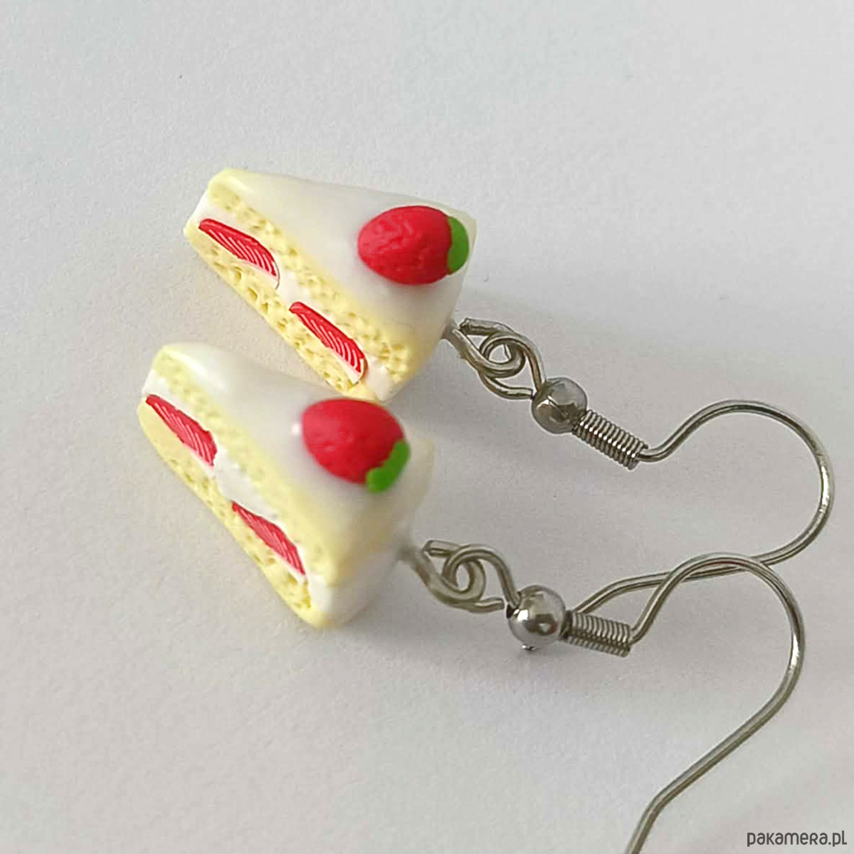 Urocze kolczyki w kształcie kawałków tortu truskawkowego (strawberry shortcake) wykonane ręcznie z dbałością o najmniejsze detale. Każdy miniaturowy kawałek ma warstwy biszkoptu, kremu i truskawek oraz owoc na wierzchu.