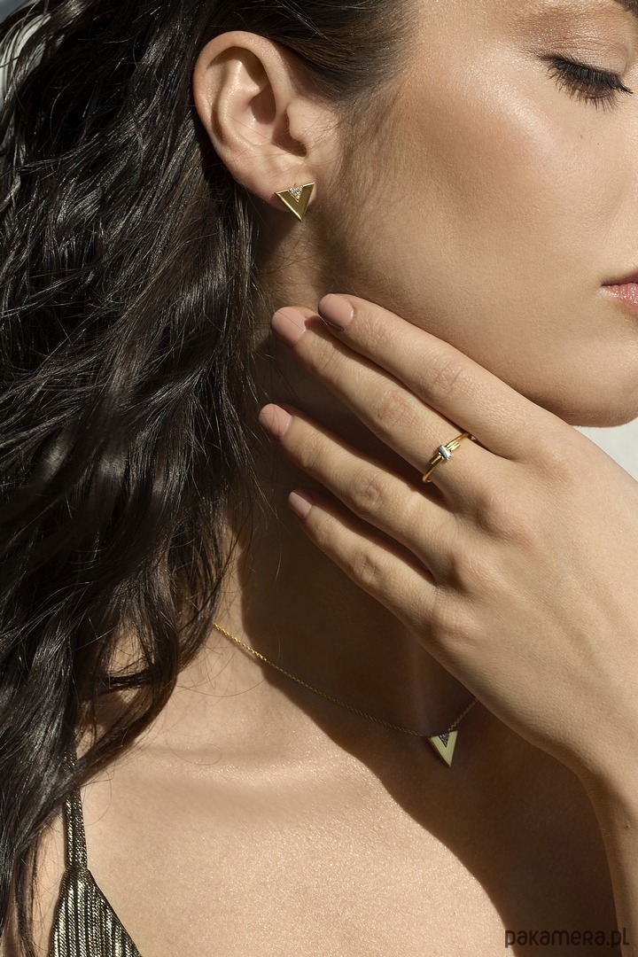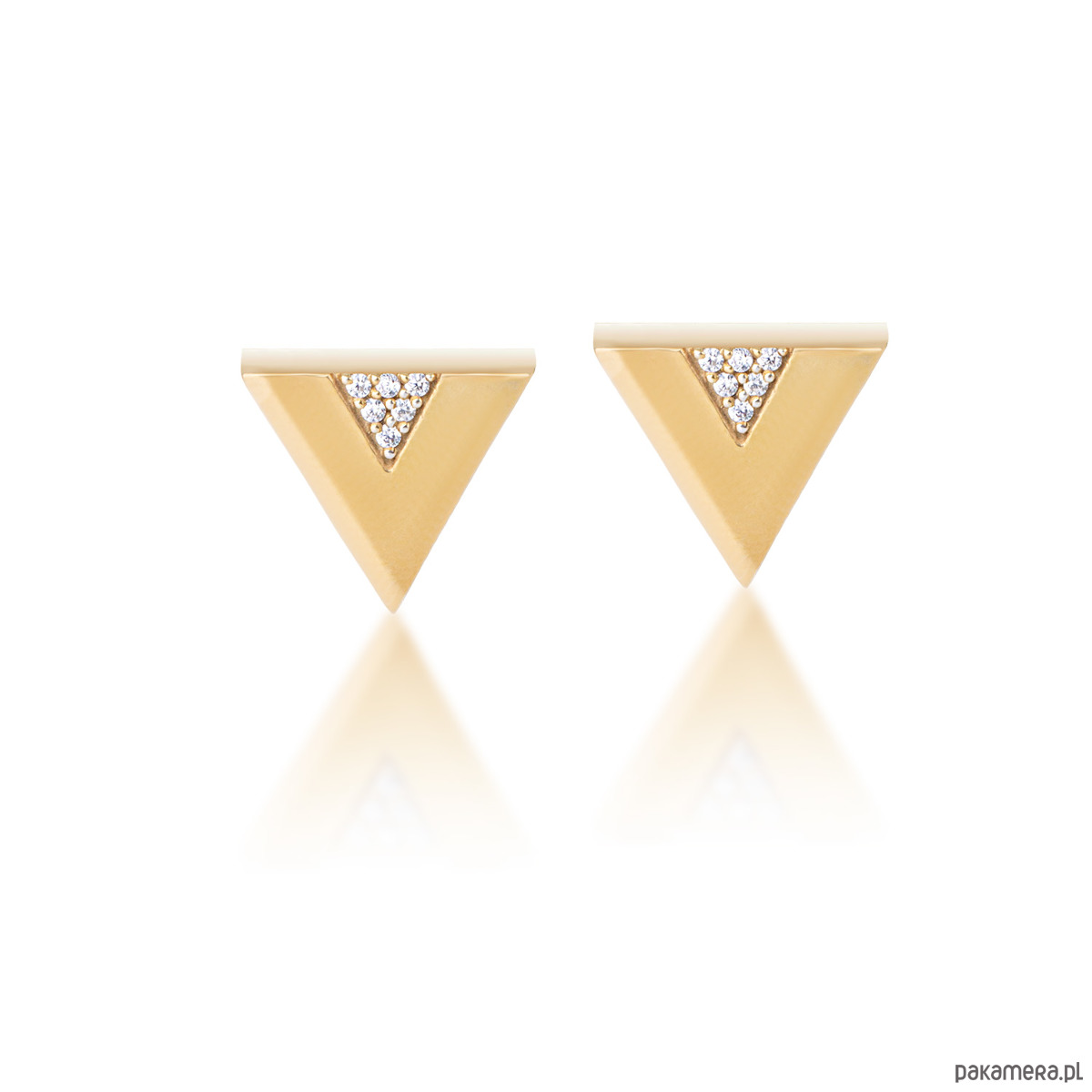 Minimalistyczne złocone kolczyki trójkąty ozdobione sześcioma białymi cyrkoniami, które tworzą literkę V. Kolczyki zapinane na sztyft. W wewnętrznej części logo marki.