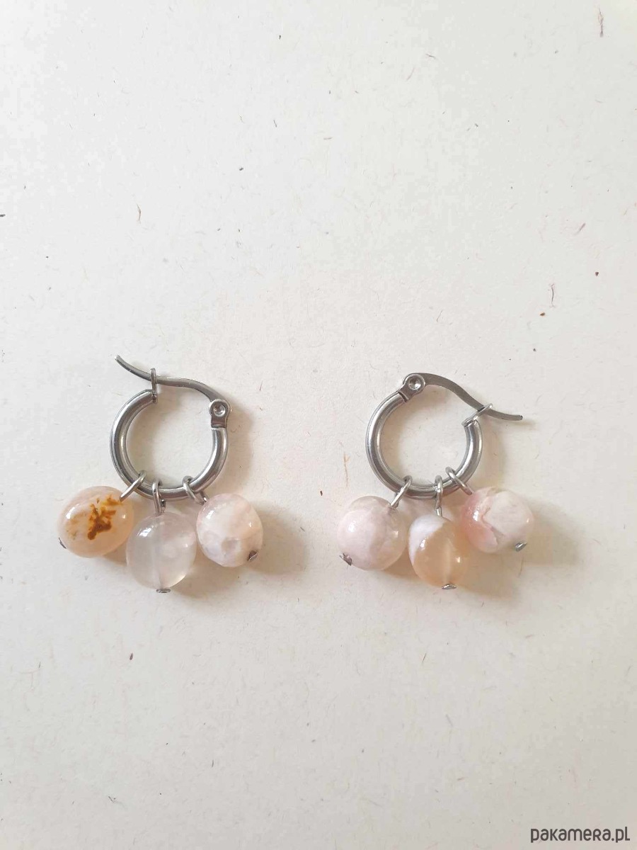 Wymiary: średnica kółka 15 mm, długość kolczyka z kamieniami ok 3 cm, wielkość kamyczków ok. 10 mm