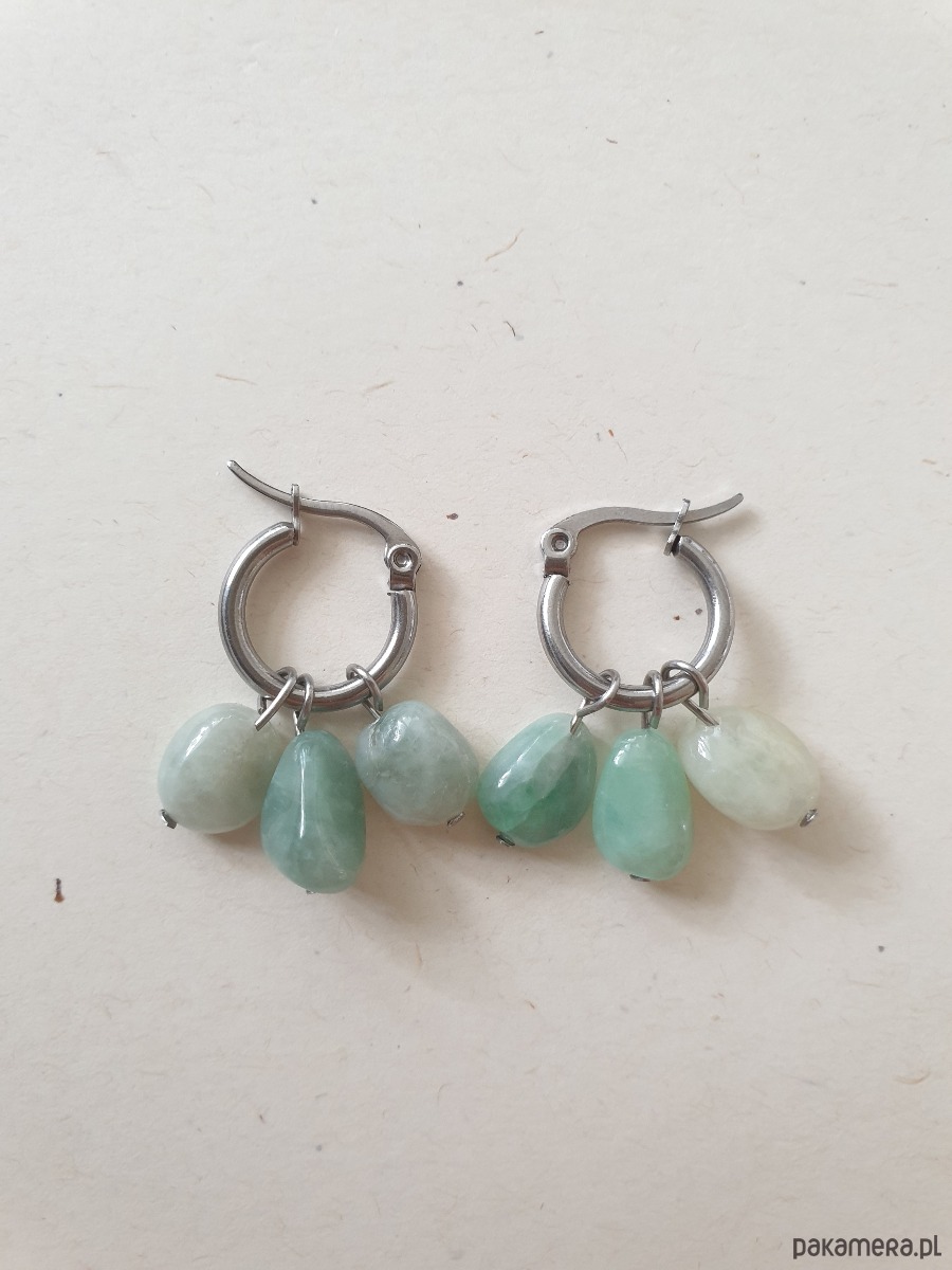 Wymiary: średnica kółka 15 mm, długość kolczyka z kamieniami ok 3 cm, wielkość kamyczków ok. 10 mm