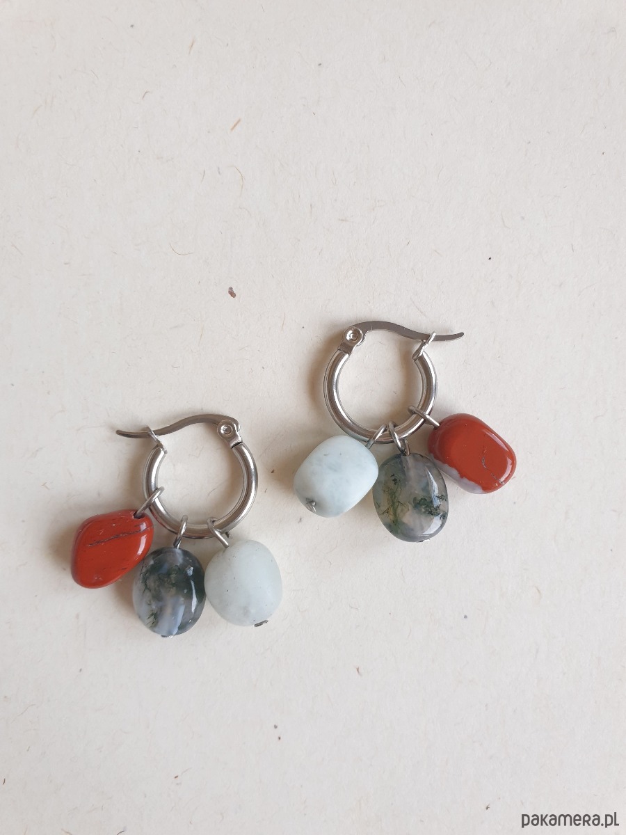 Wymiary: średnica kółka 15 mm, długość kolczyka z kamieniami ok 3 cm, wielkość kamyczków ok. 10 mm