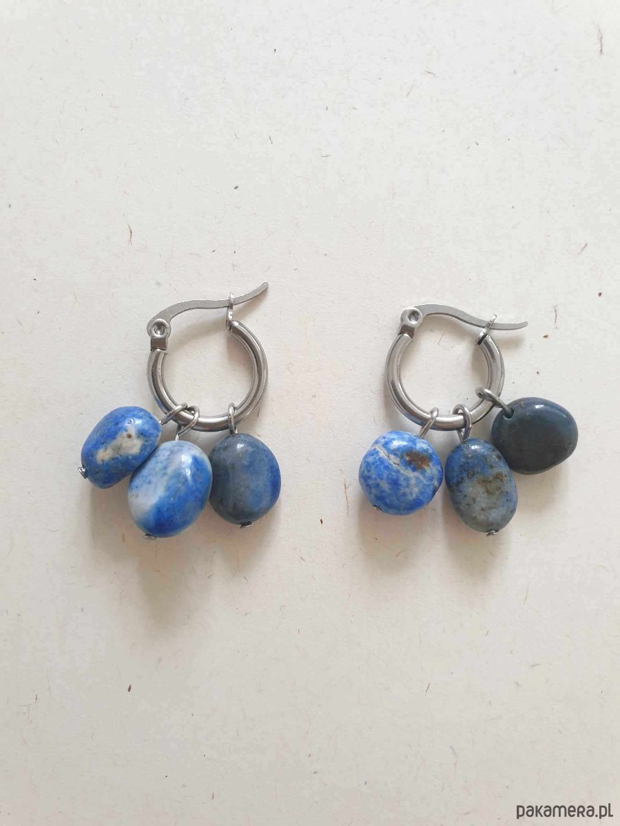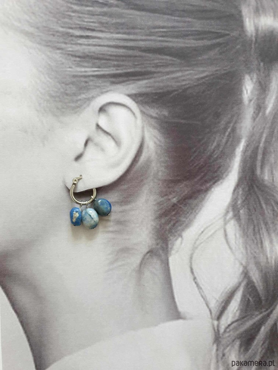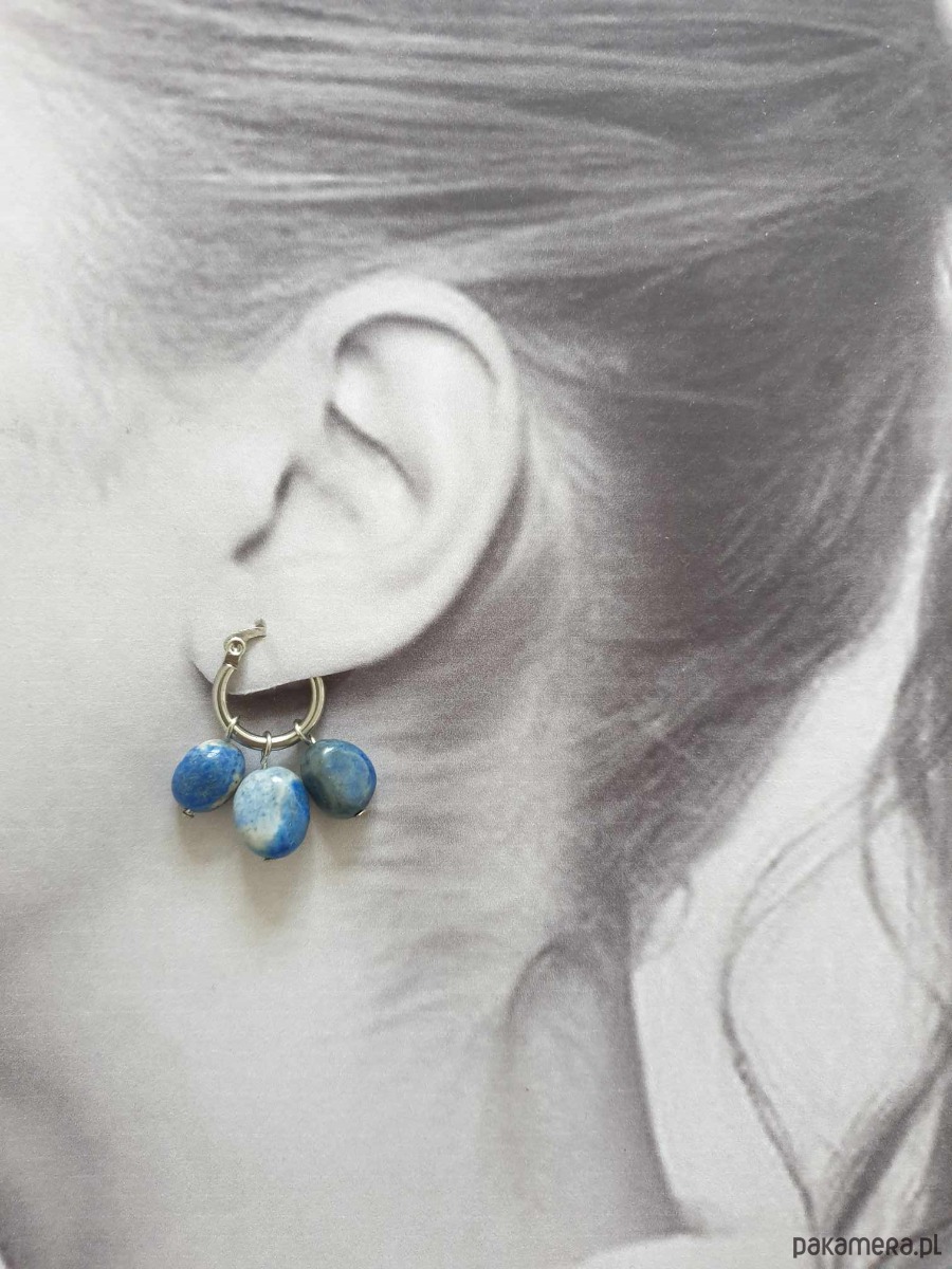 Kolczyki TRIO, idealne na wieczorne wyjście ale też na co dzień. Wykonane ze stali szlachetnej (hipoalergicznej) z kamieniami naturalnymi: lapis lazuli nieregularne pastylki. Można je nosić na wiele sposobów bo kamyczki są zdejmowane.