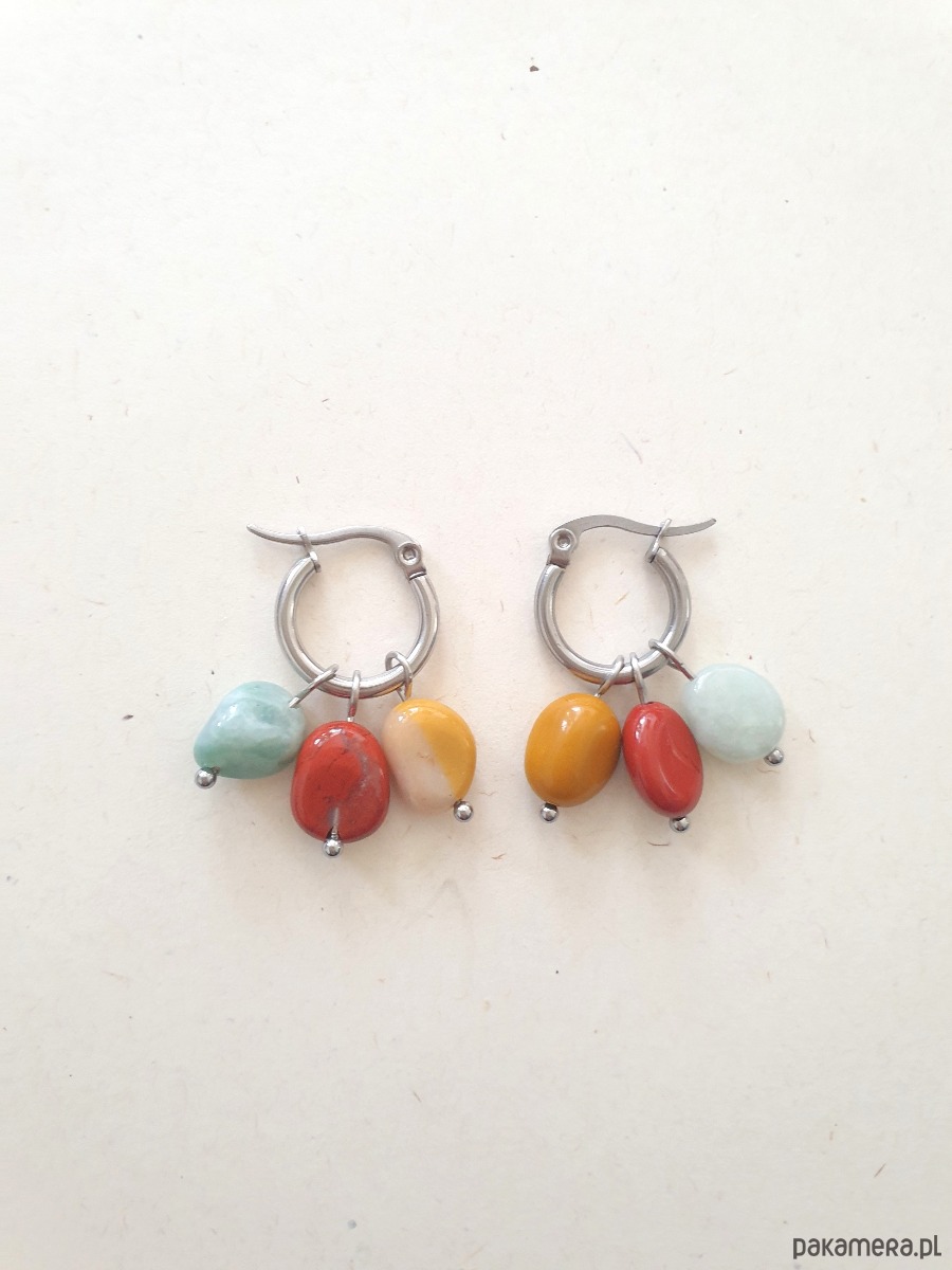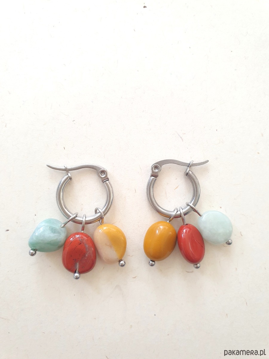 Wymiary: średnica kółka 15 mm, długość kolczyka z kamieniami ok 3 cm, wielkość kamyczków ok. 8- 10 mm