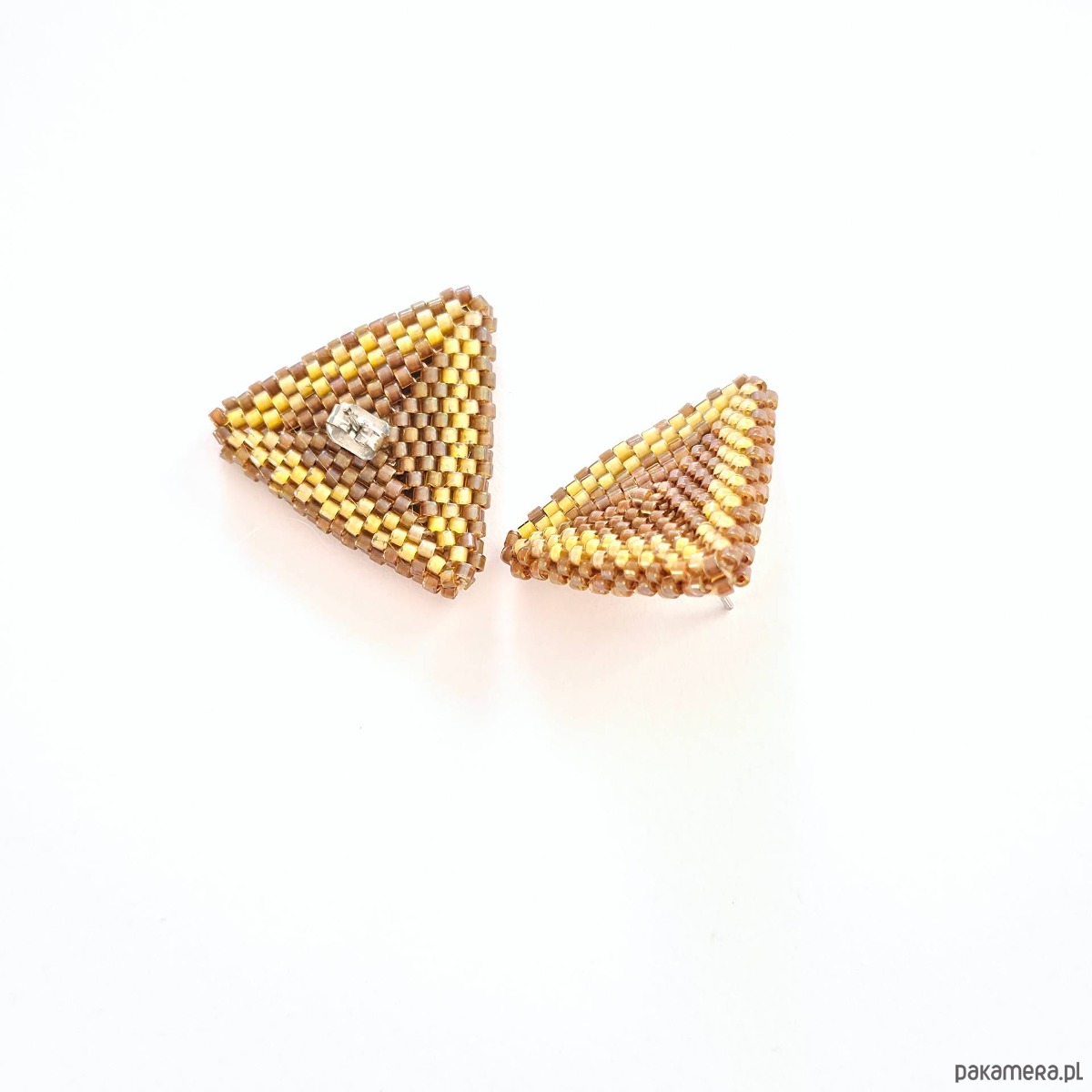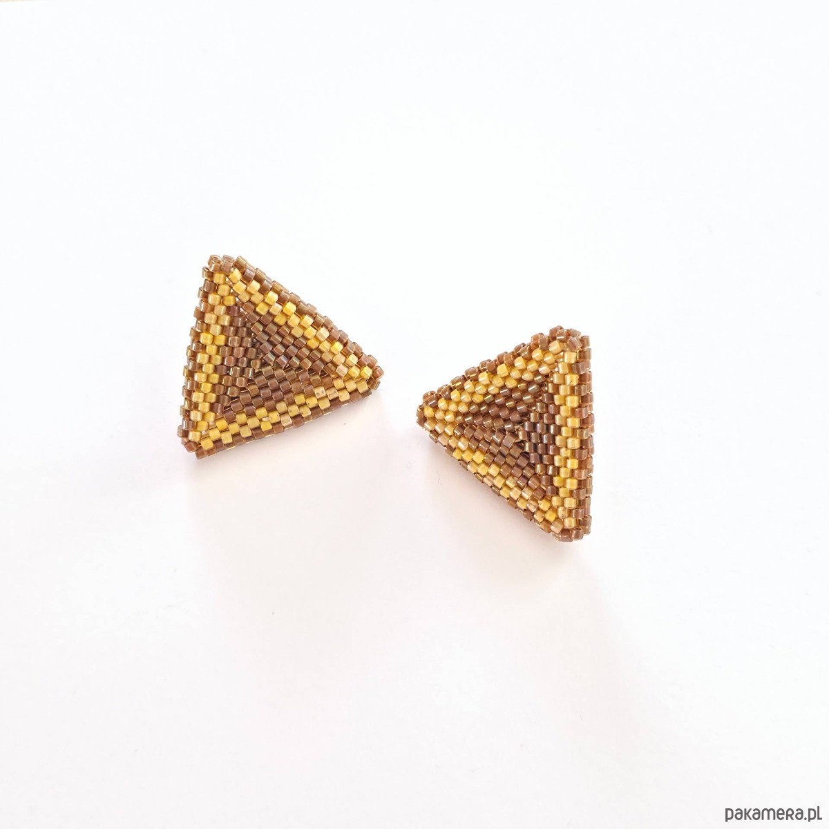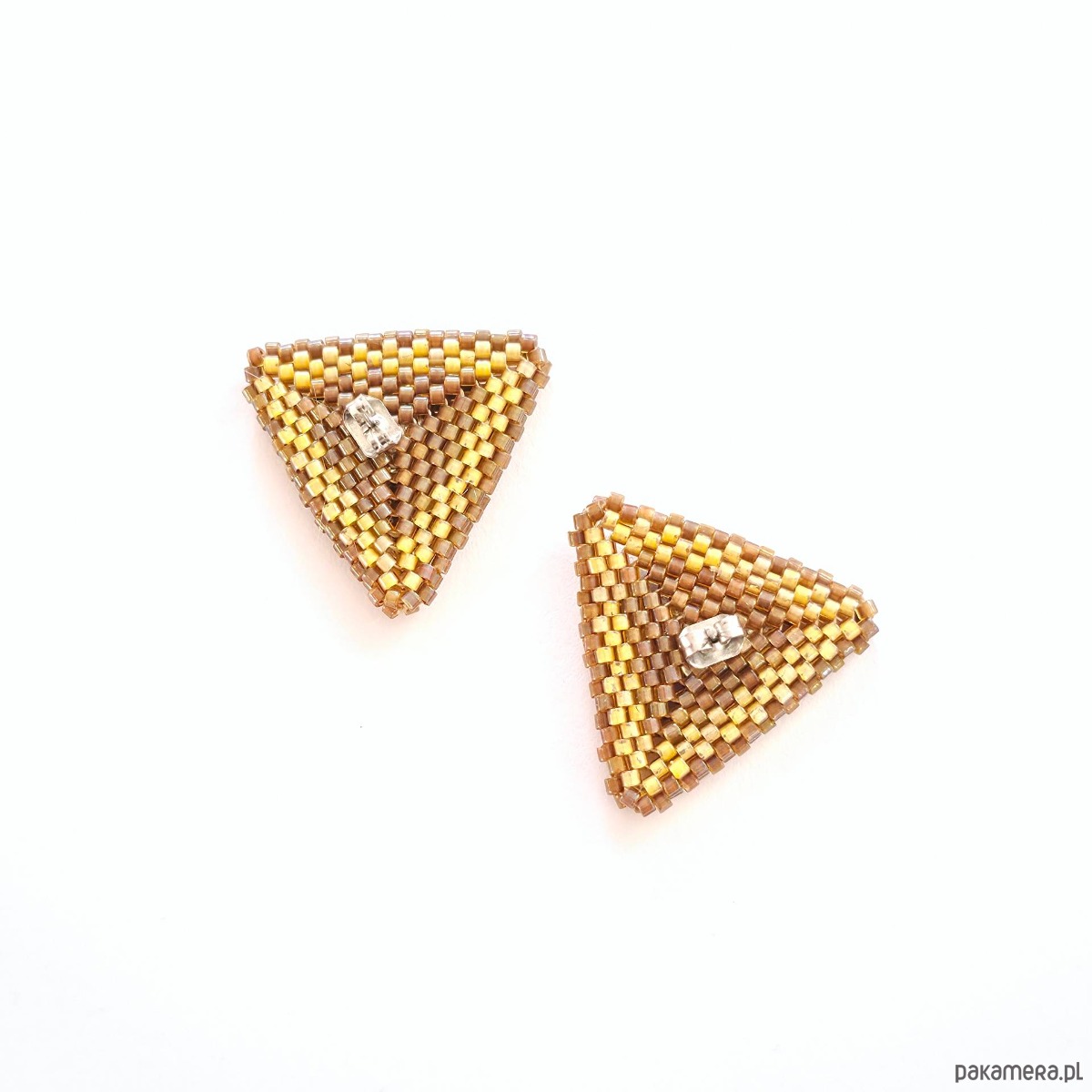 • Wielkość: bok trójkąta ok. 2,5 cm x 2,5 cm • Materiały: Koraliki Miyuki Delica (Luminous Almond, Topaz Inside Dyed Cinnamon AB), stal chirurgiczna (stop 316), stal szlachetna (stop 304), nić nylonowa S-Lon D.• Typ zapięcia: Sztyft z płytką 6 mm ze stali chirurgicznej.