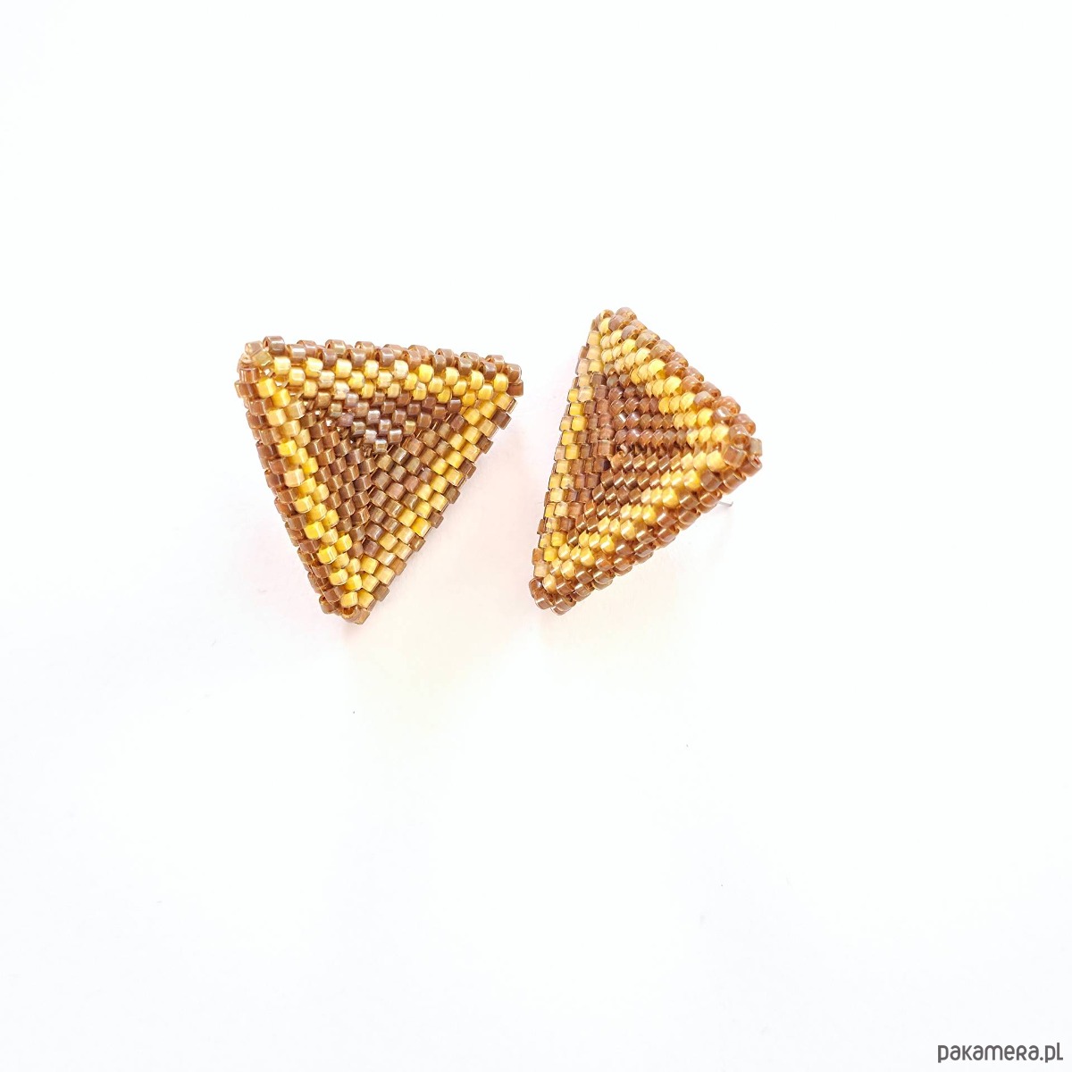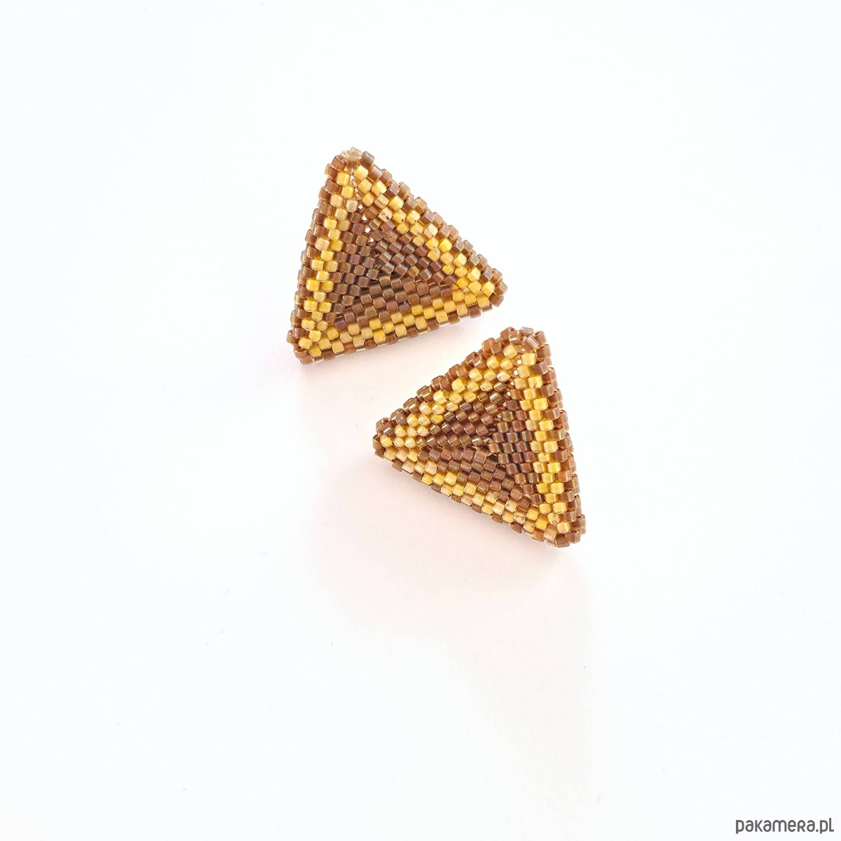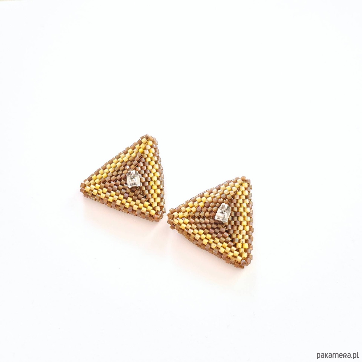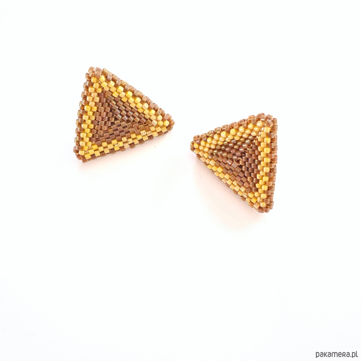 • Wielkość: bok trójkąta ok. 2,5 cm x 2,5 cm • Materiały: Koraliki Miyuki Delica (Luminous Almond, Topaz Inside Dyed Cinnamon AB), stal chirurgiczna (stop 316), stal szlachetna (stop 304), nić nylonowa S-Lon D.• Typ zapięcia: Sztyft z płytką 6 mm ze stali chirurgicznej.