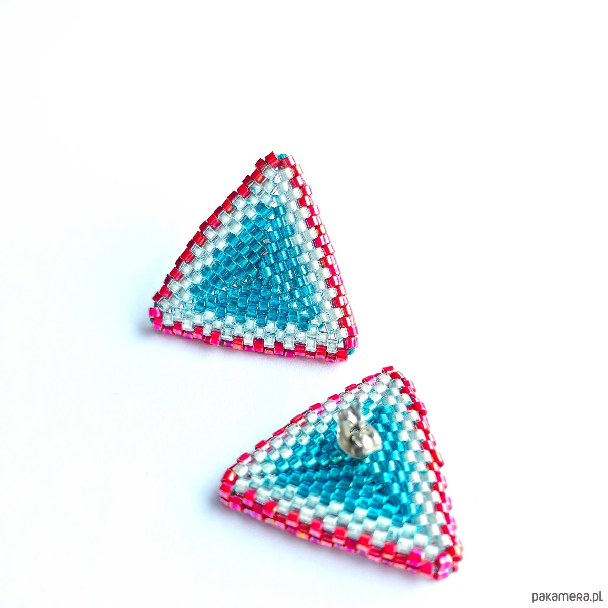 • Nr produktu: KOLLAGU-001-20230302 • Wielkość: bok trójkąta ok. 2,5 cm x 2,5 cm • Materiały: Koraliki Miyuki Delica (Opaque Red AB, Fancy Lined Teal Green, Pearl Lined Transp. Pale Beige AB), stal chirurgiczna (stop 316), stal szlachetna (stop 304), nić nylonowa S-Lon D. • Typ zapięcia: Sztyft z płytką 4 mm ze stali chirurgicznej.