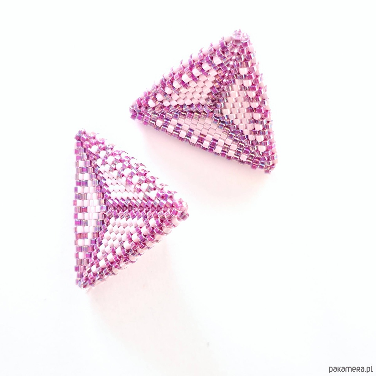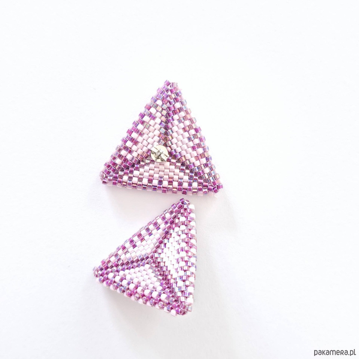 • Nr produktu: MALCHMU-001-20230125 • Wielkość: bok trójkąta ok. 3,0 cm x 3,0 cm • Materiały: Koraliki Miyuki Delica (Inside Dyed Magenta AB, Opaque Pale Rose AB), stal chirurgiczna (stop 316), stal szlachetna (stop 304), nić nylonowa S-Lon D. • Typ zapięcia: Sztyft z płytką 8 mm ze stali chirurgicznej.