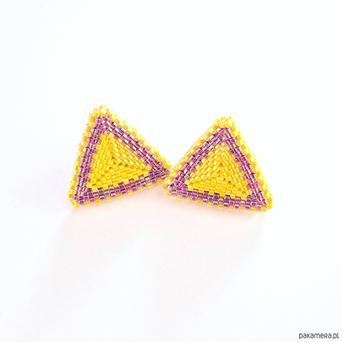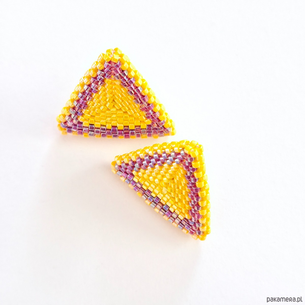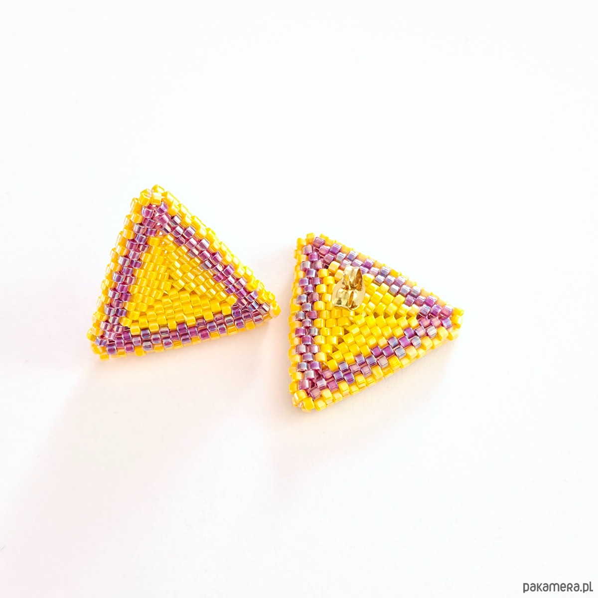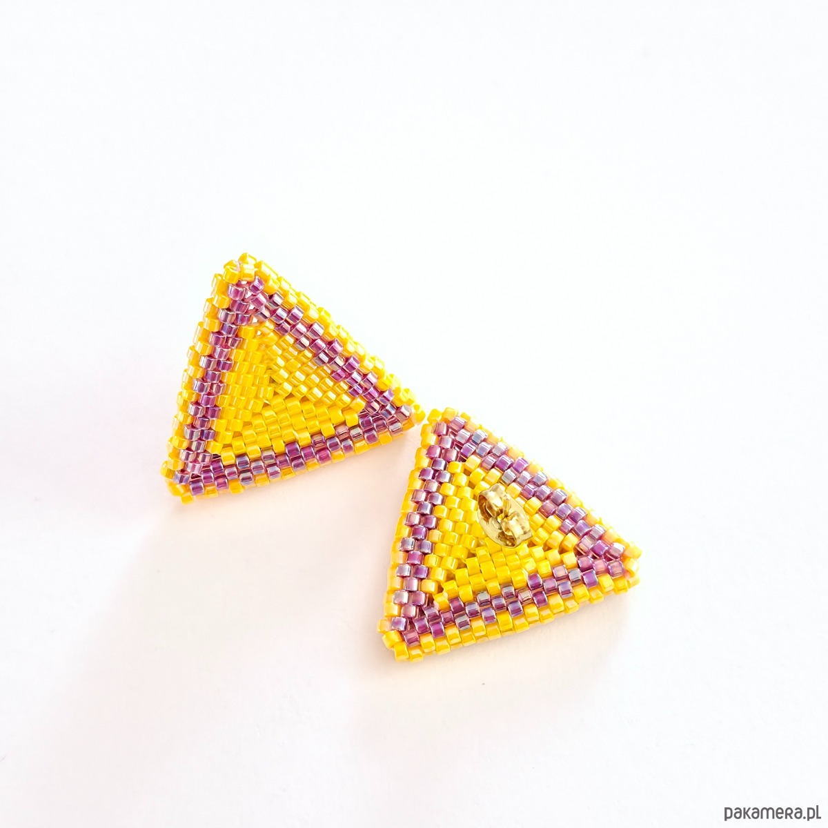 • Nr produktu: SLOMAG-001-20230310 • Wielkość:ok. 2,5 cm x 2,5 cm • Materiały: Koraliki Miyuki Delica (Opaque Dk. Yellow AB, Inside Dyed Magenta AB), stal szlachetna (stop 304) pozłacana 24K złotem, nić nylonowa S-Lon D. • Typ zapięcia: Sztyft z płytką 6 mm ze stali szlachetnej pozłacanej 24K złotem.