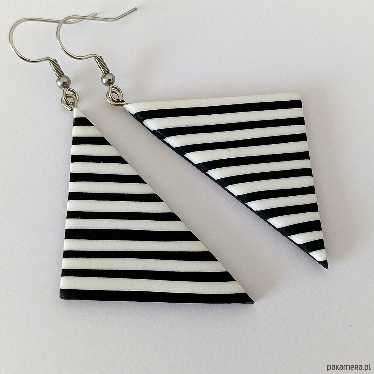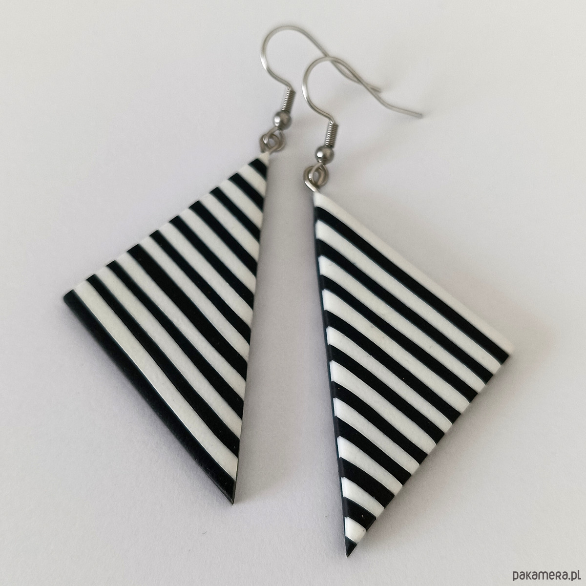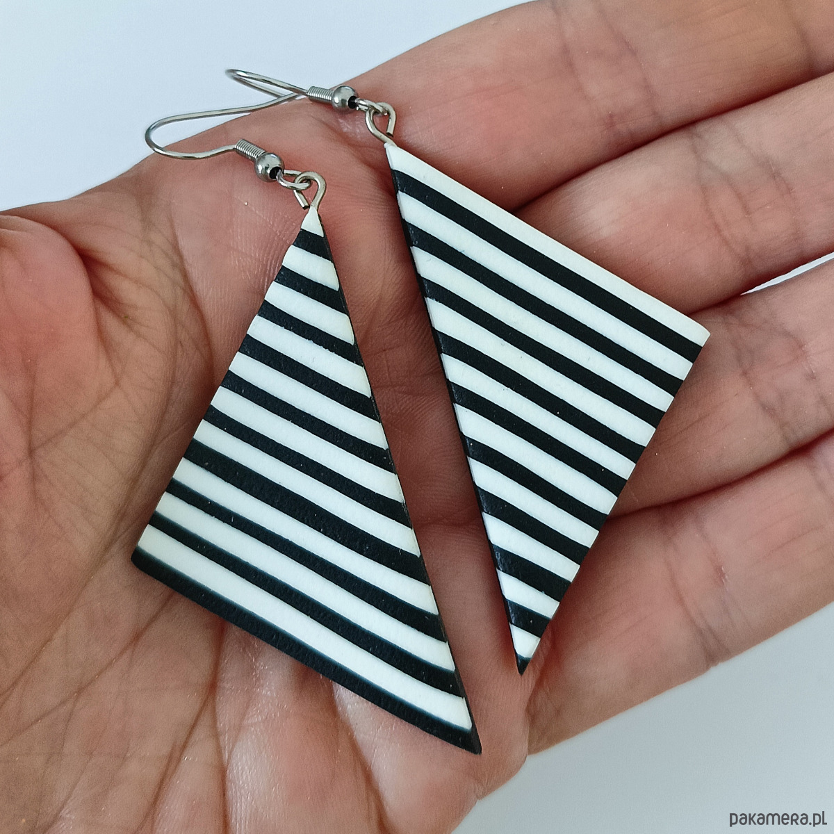 Nowoczesne kolczyki w kształcie trójkątów, wykonane ręcznie z lekkiej masy polimerowej. Biało-czarne paski nadają im graficzny, odważny charakter. Idealne dla kobiet, które lubią wyraziste dodatki i unikatową biżuterię.
