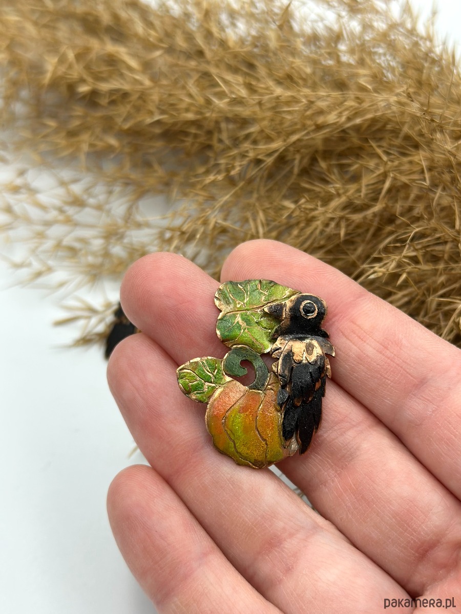 Elementy wykonane są ręcznie z miedzi, która idealnie współgra z ciepłym kolorem dyni. Powierzchnia została ręcznie pomalowana farbami akrylowymi, dzięki czemu dynia zyskuje głębię koloru, a kruk subtelne detale. Całość zabezpieczona jest warstwą werniksu, który chroni malaturę i nadaje delikatne wykończenie.