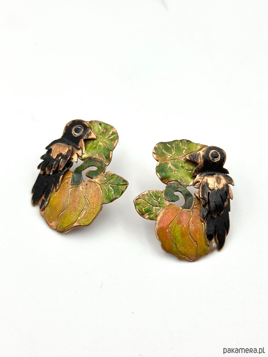 Kolczyki mają w sobie odrobinę tajemnicy i lekko baśniowy charakter. Na niewielkiej dyni przysiadł kruk — spokojny obserwator, który sprawia, że całość wygląda jak mała scena wyjęta z opowieści o jesieni, zmierzchu i cichym ogrodzie. Motyw jest nieco mroczny, ale jednocześnie pełen uroku i humoru.