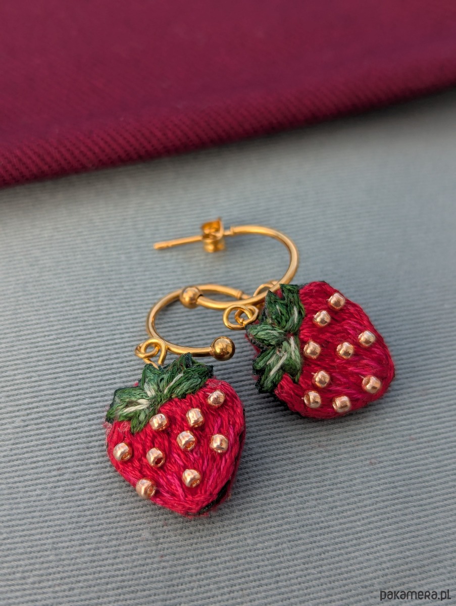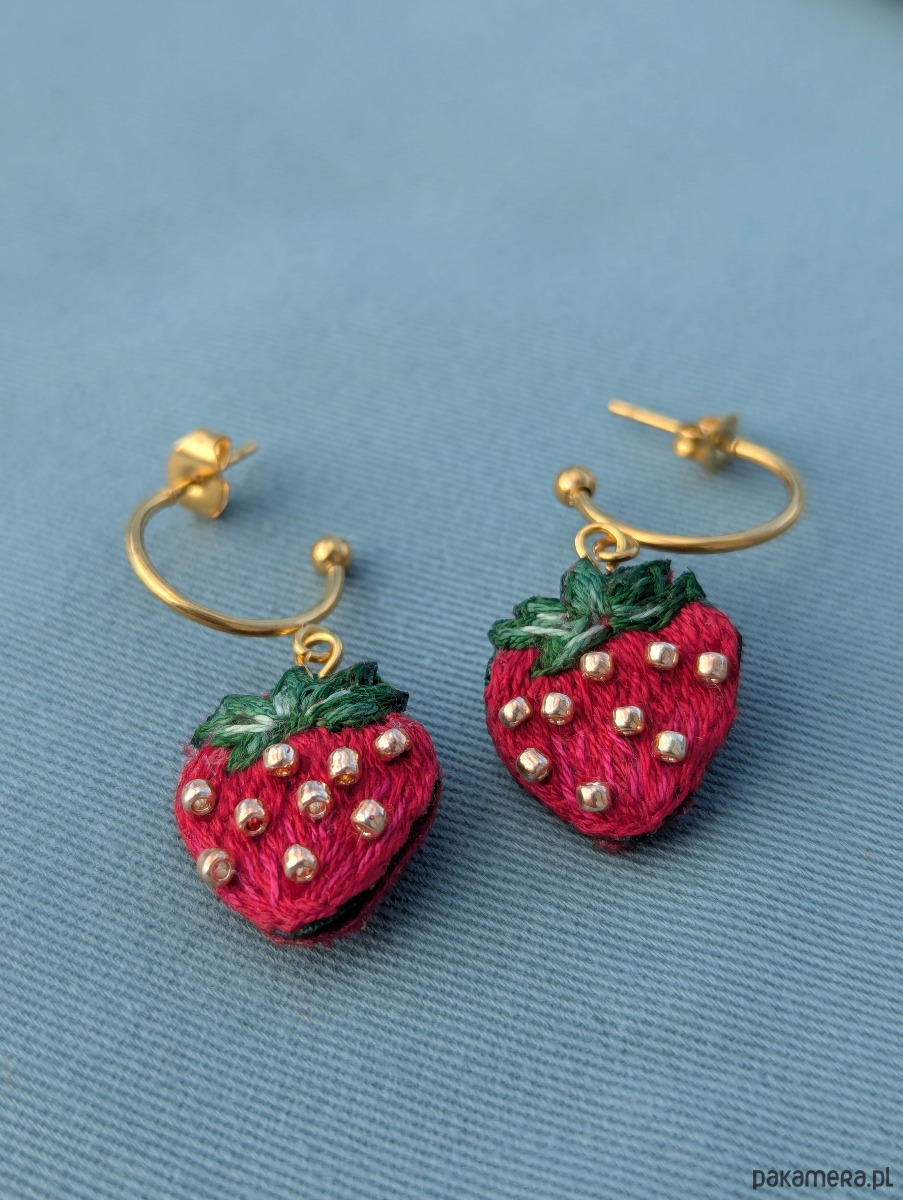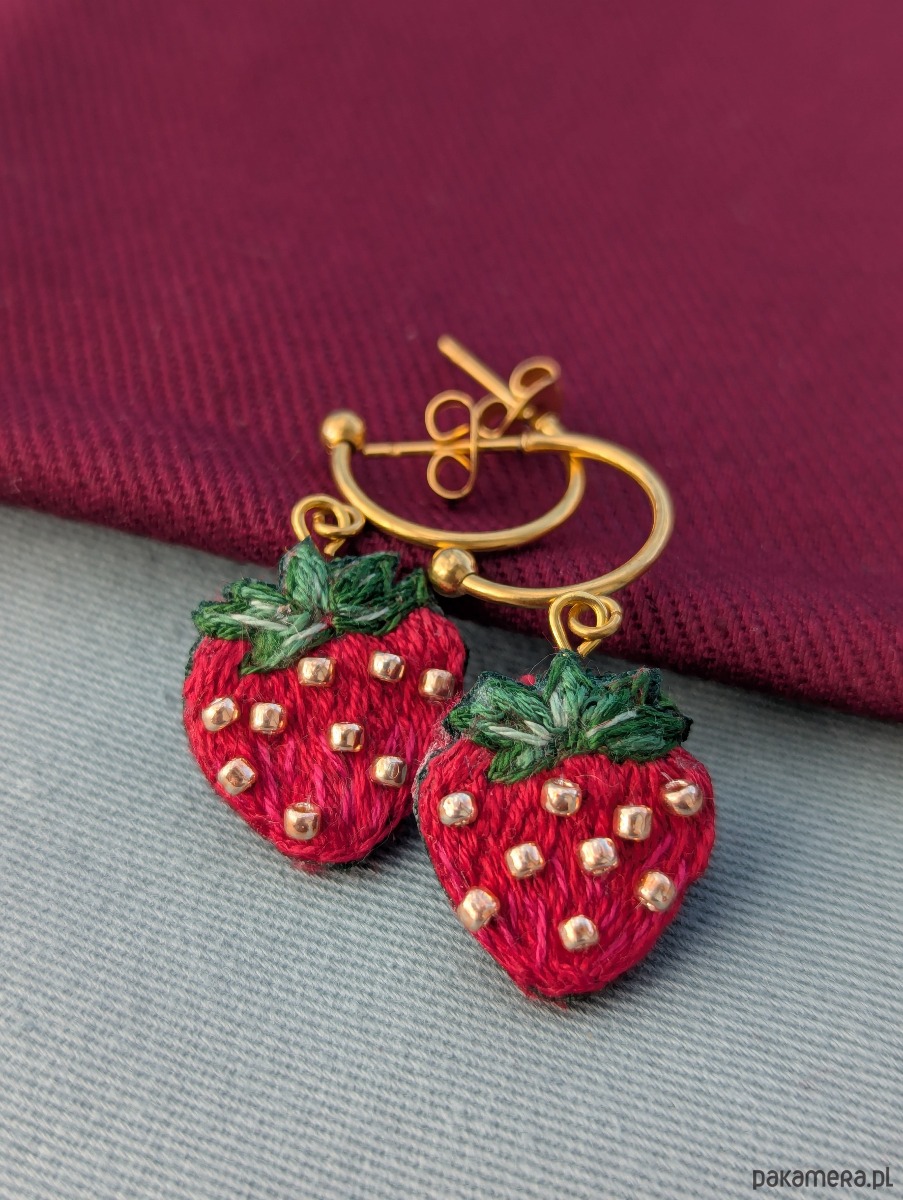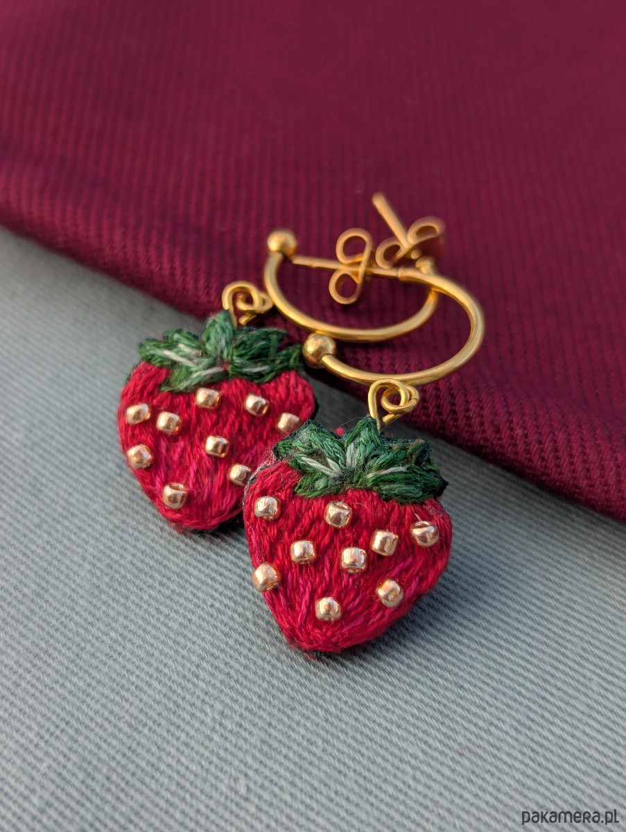Kolczyki truskawki – pełne koloru, słodyczy i letniego blasku. Wykonane metodą haftu ręcznego z z dodatkiem metalicznych koralików imitujących pestki. Te drobne błyszczące detale odbijają światło przy każdym ruchu, dodając kolczykom wyjątkowego uroku, wypukłości i ciekawej tekstury :)