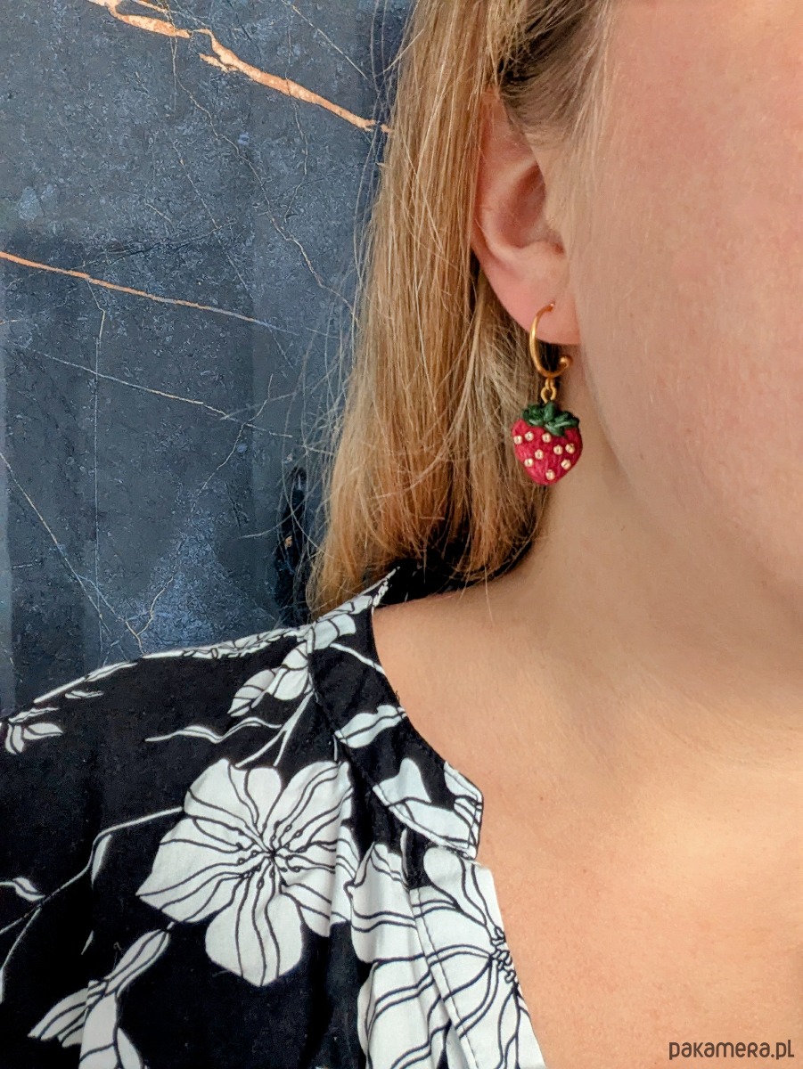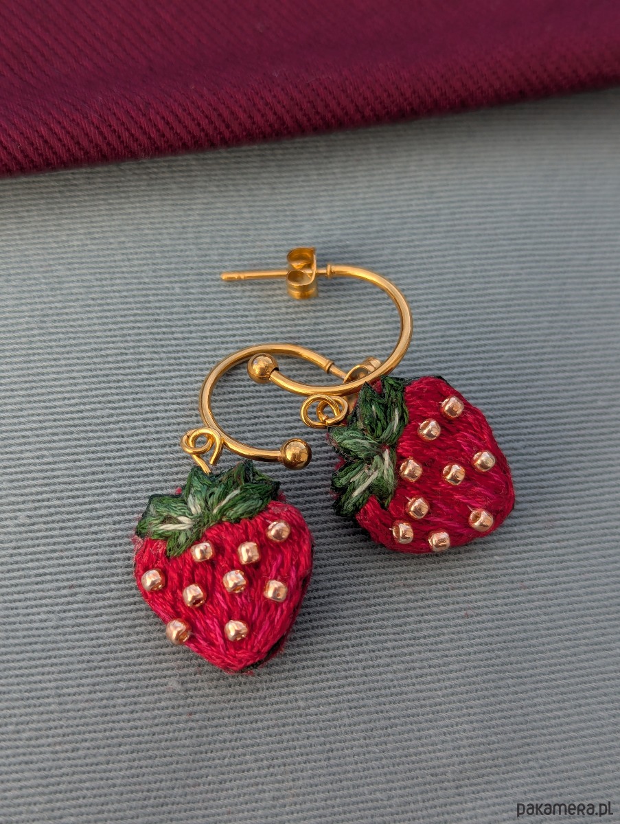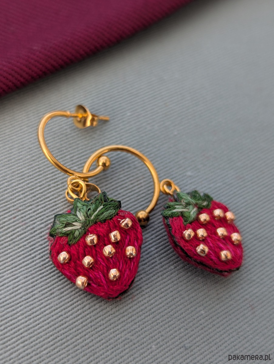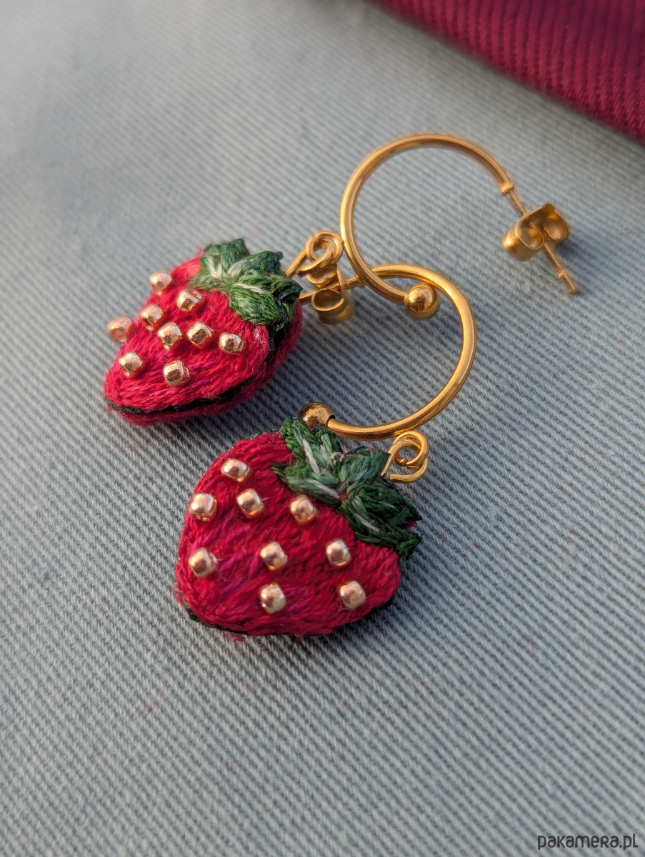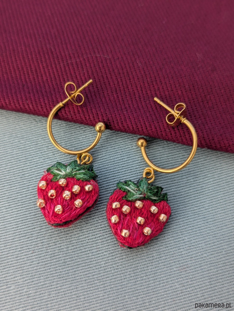 Kolczyki truskawki – pełne koloru, słodyczy i letniego blasku. Wykonane metodą haftu ręcznego z z dodatkiem metalicznych koralików imitujących pestki. Te drobne błyszczące detale odbijają światło przy każdym ruchu, dodając kolczykom wyjątkowego uroku, wypukłości i ciekawej tekstury :)