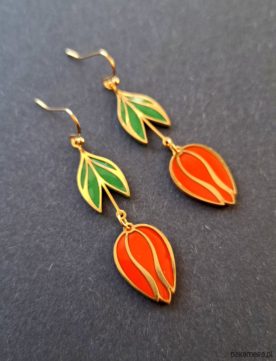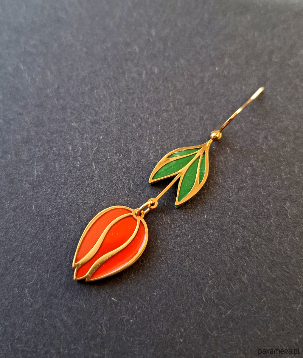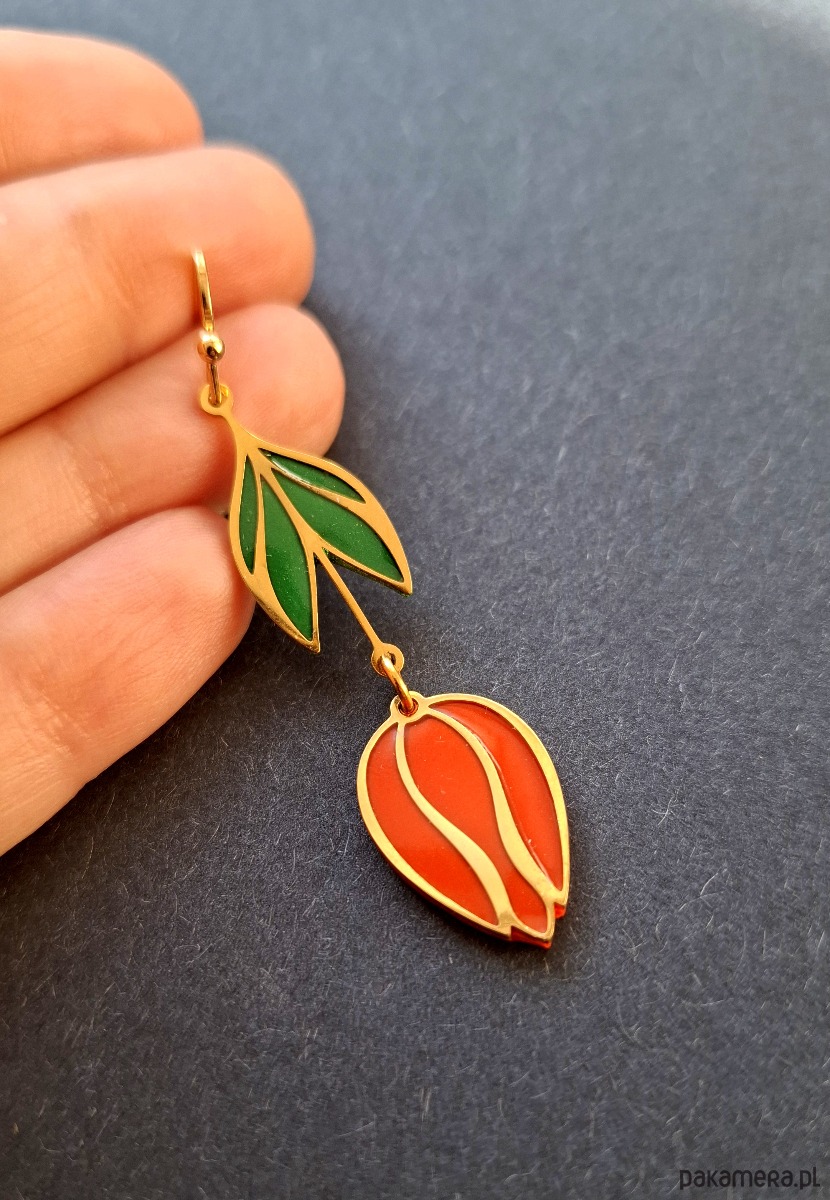 Wiosenne kolczyki wiszące wykonane z wysokiej jakości glinki polimerowej z dodatkiem ozdobnych elementów metalowych. Jednostronne z biglami prostymi, pozłacanymi i nieuczulającymi. Wymiary kolczyków: długość całkowita: 5,8 cm, szerokość maksymalna 1,5 cm. Wykonane w jedynym egzemplarzu.