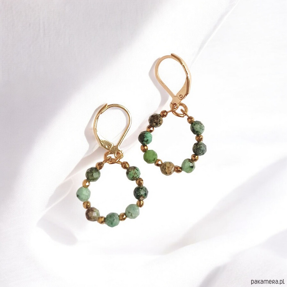 Kolczyki zostały wykonane z fasetowanych kuleczek wielobarwnego turkusu afrykańskiego 4mm i drobniutkich kuleczek złotego hematytu.