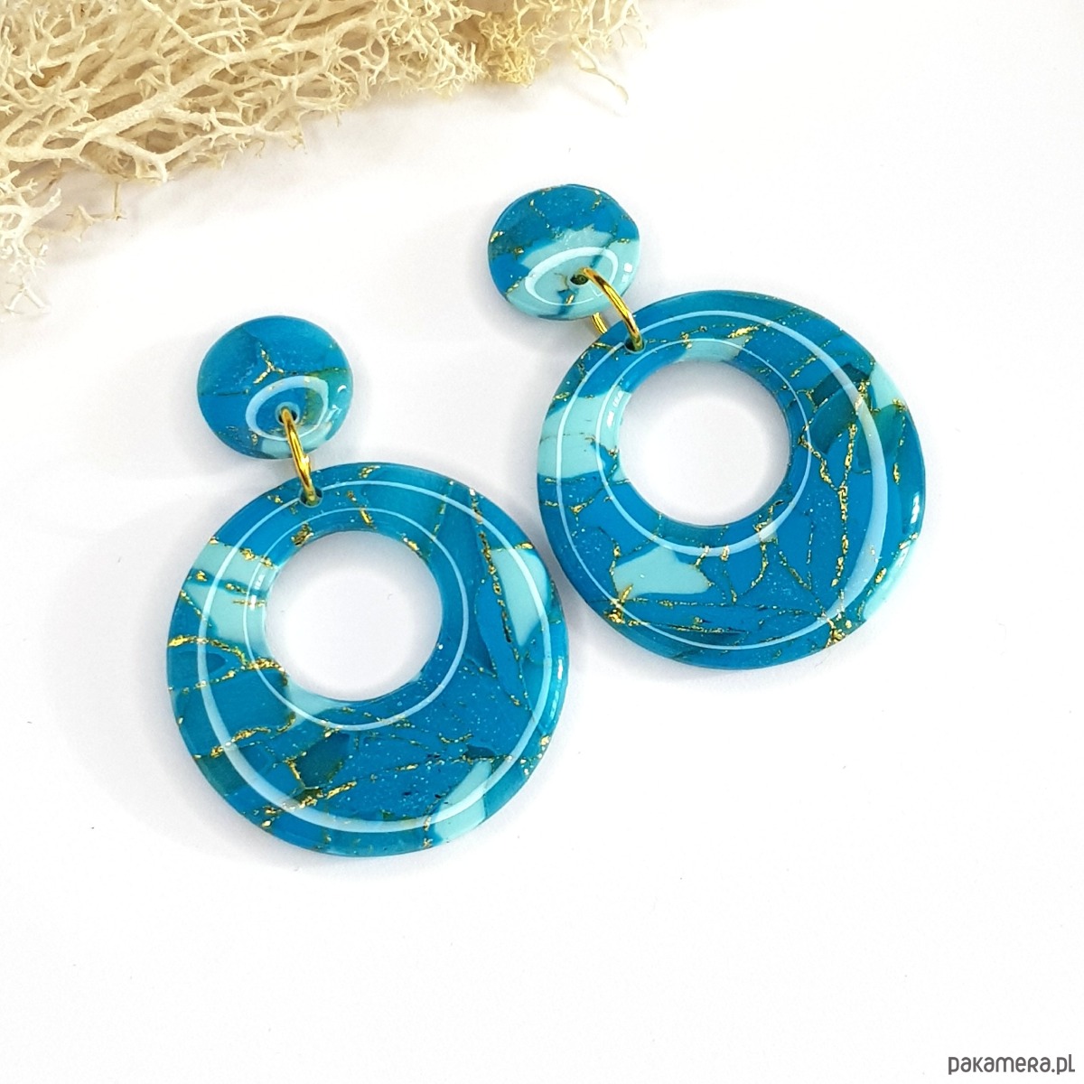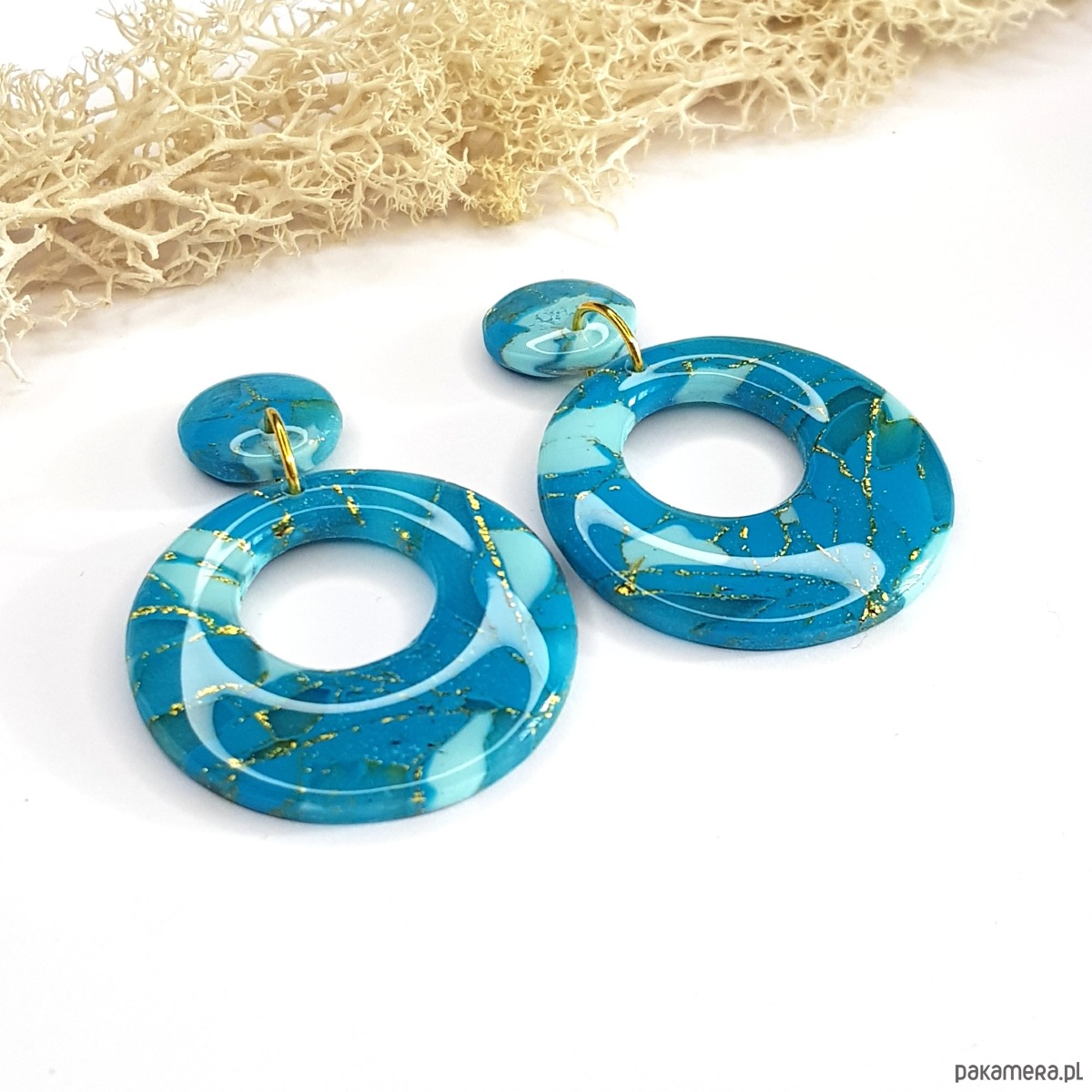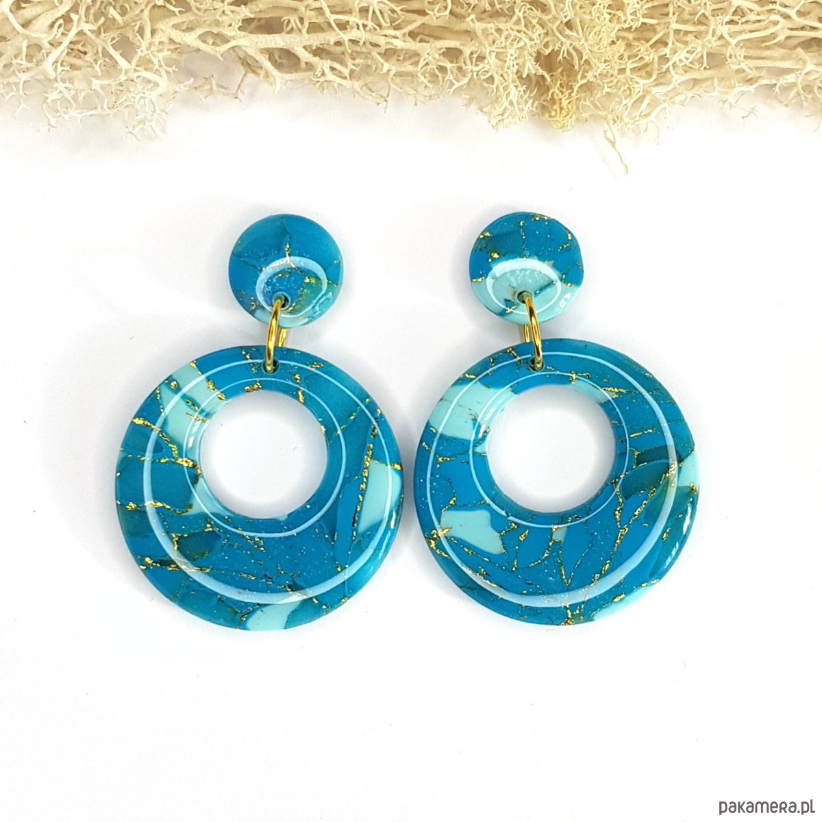 Kolczyki z gliny polimerowej to prawdziwe dzieła sztuki. Ich intensywny turkusowy kolor w połączeniu z delikatnymi złotymi żyłkami tworzy elegancką i wyrazistą kompozycję. Mają długość 5,5 cm, co nadaje im efektownego charakteru, a jednocześnie są lekkie i wygodne w noszeniu. Okrągła, warstwowa forma przywodzi na myśl fale oceanu, które odbijają promienie słońca. Całość została pokryta połyskującą żywicą, dzięki czemu kolczyki są trwałe i zyskują wyjątkowy blask. To idealny dodatek zarówno na co dzień, jak i na wyjątkowe okazje, który przyciągnie spojrzenia i podkreśli unikalny styl. Każda para odrobinę się od siebie różni. Czas dostawy od 3 do 5 dni roboczych.