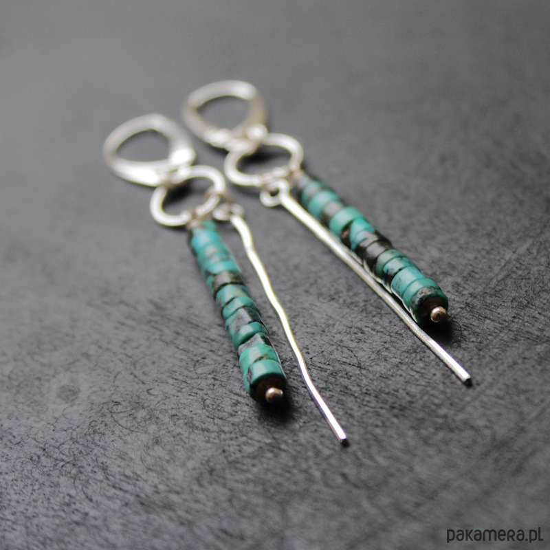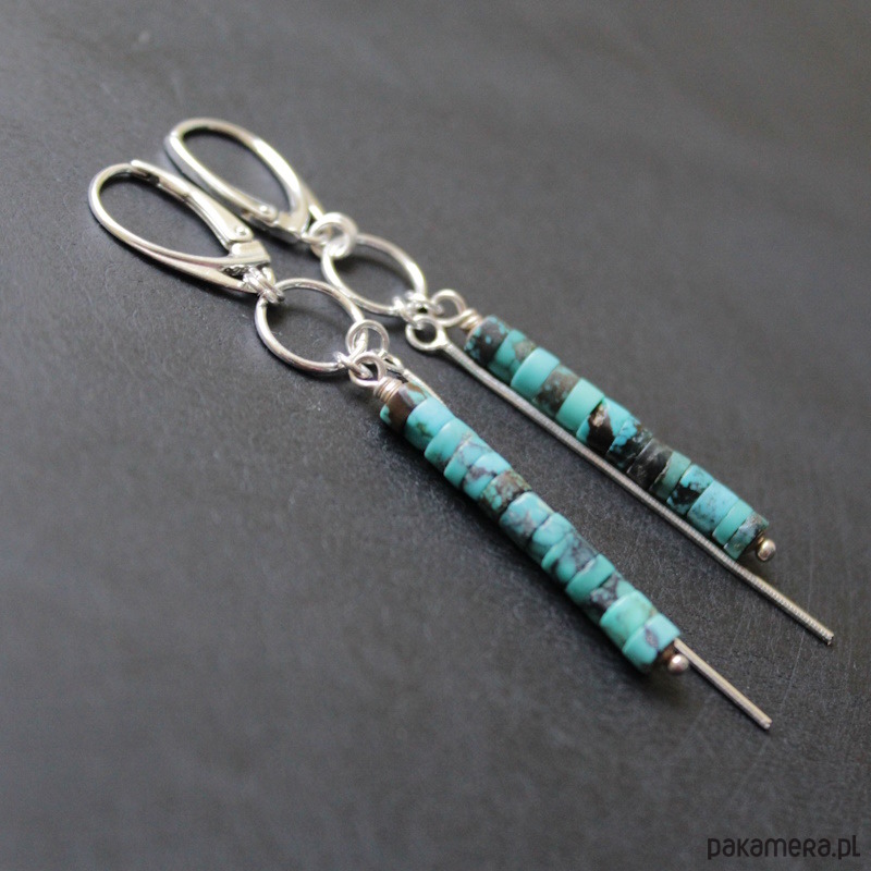 Długie kolczyki wykonane zostały ze srebra próby 925 oraz plasterków turkusów wielkości 0,35 cm.