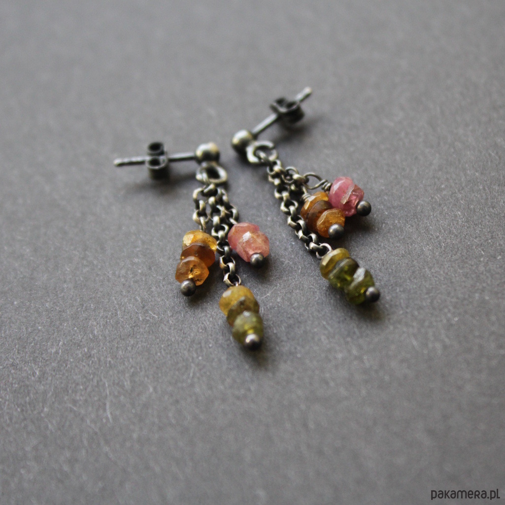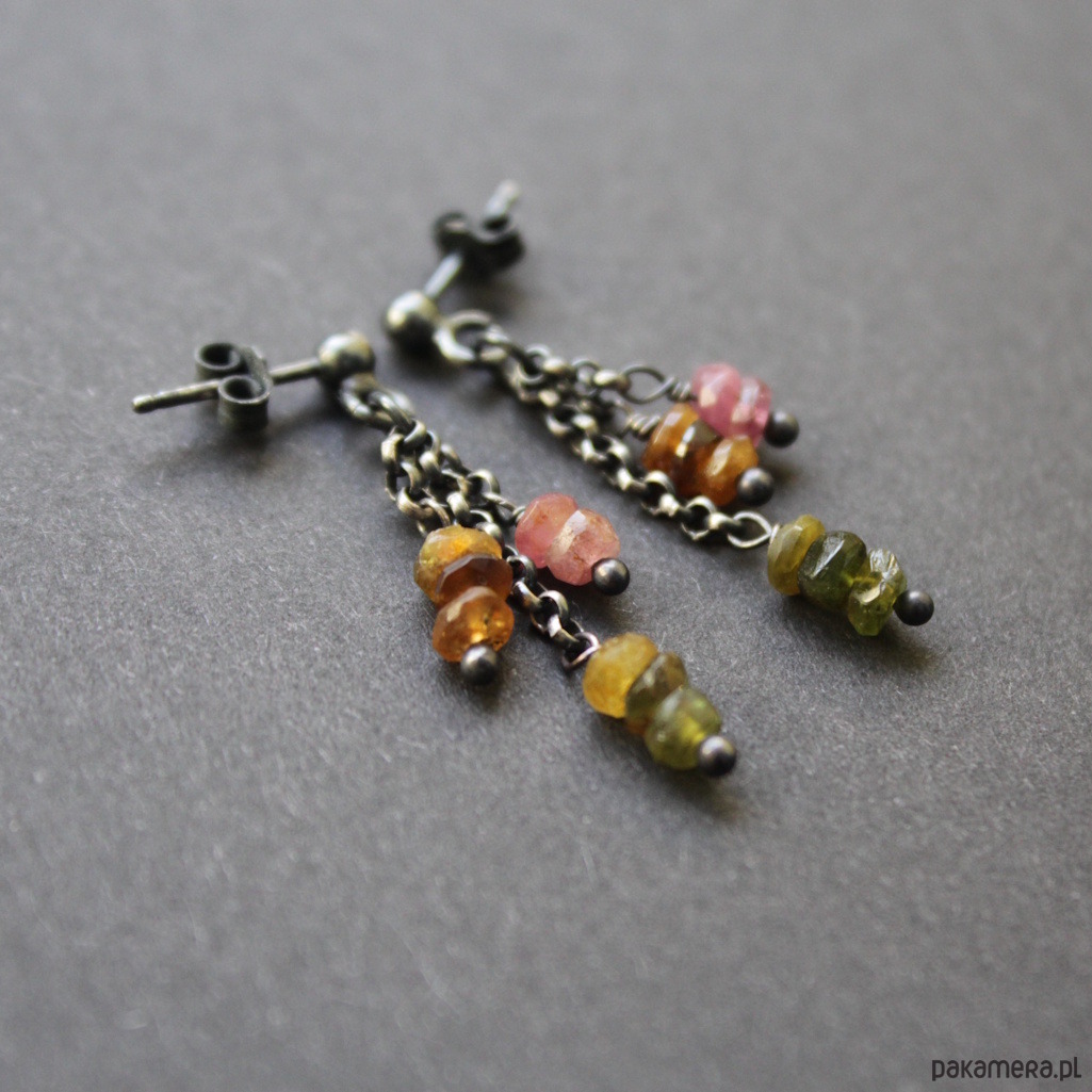 Kolczyki wykonane zostały z oksydowanego srebra próby 925 oraz plasterków kolorowych turmalinów wielkości 0,35 cm.