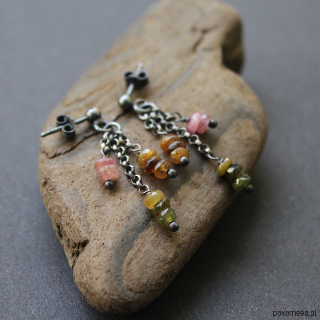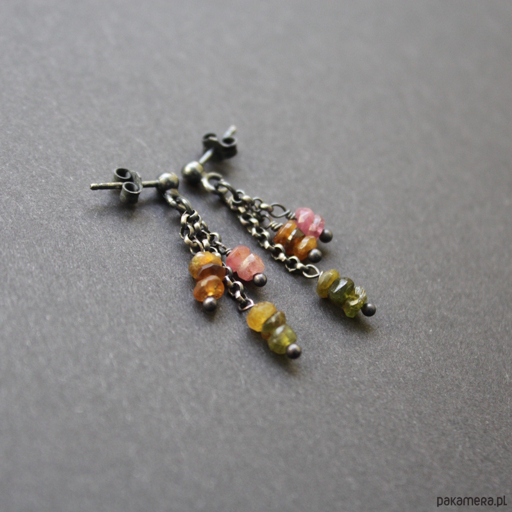 Kolczyki wykonane zostały z oksydowanego srebra próby 925 oraz plasterków kolorowych turmalinów wielkości 0,35 cm.