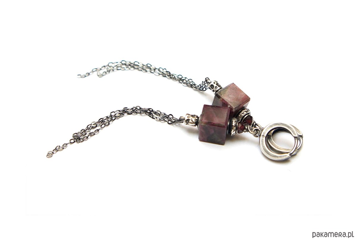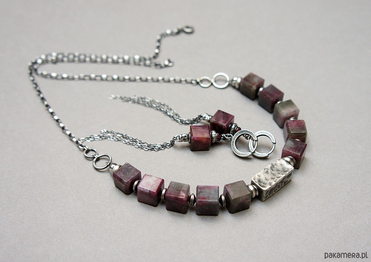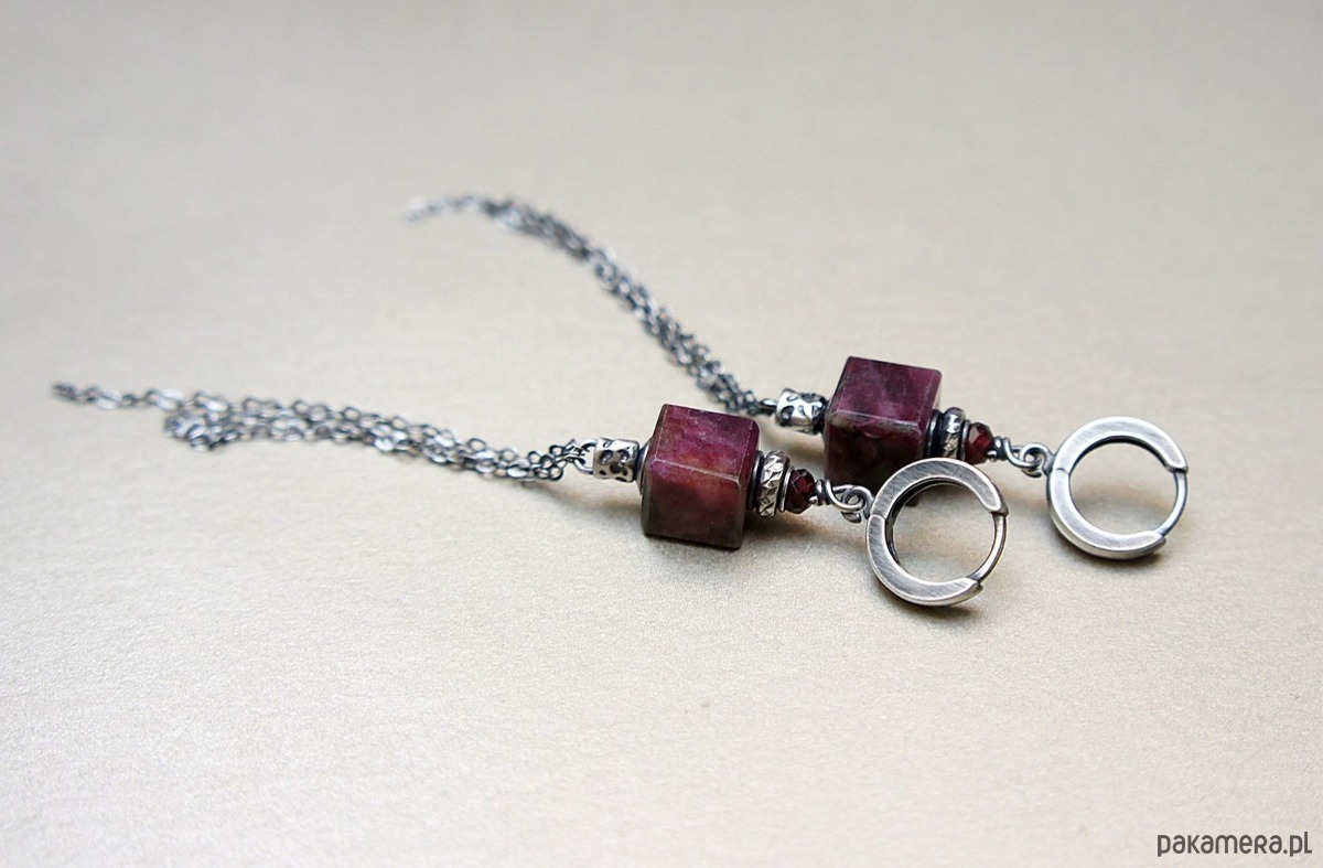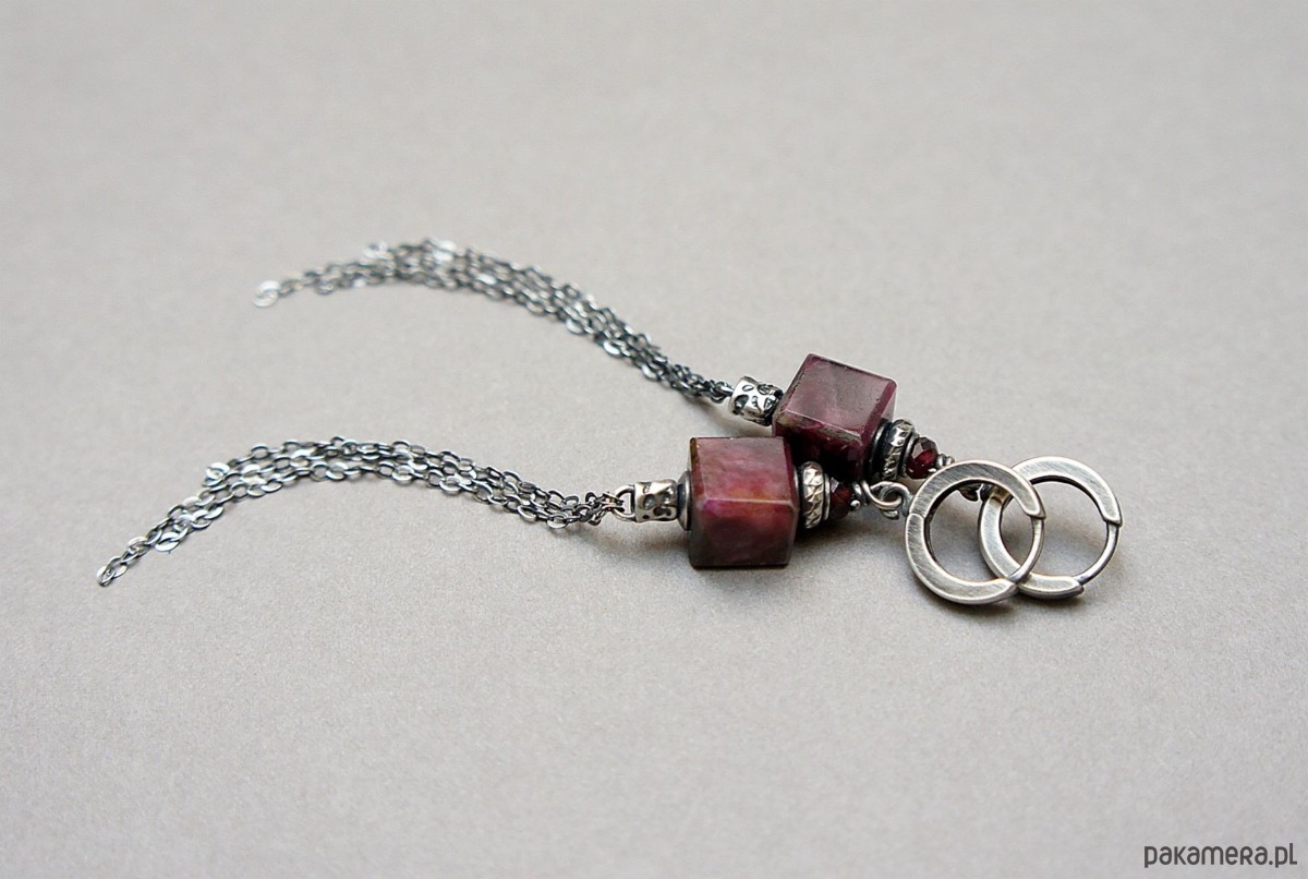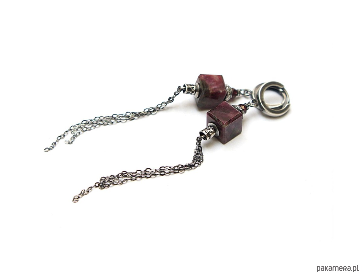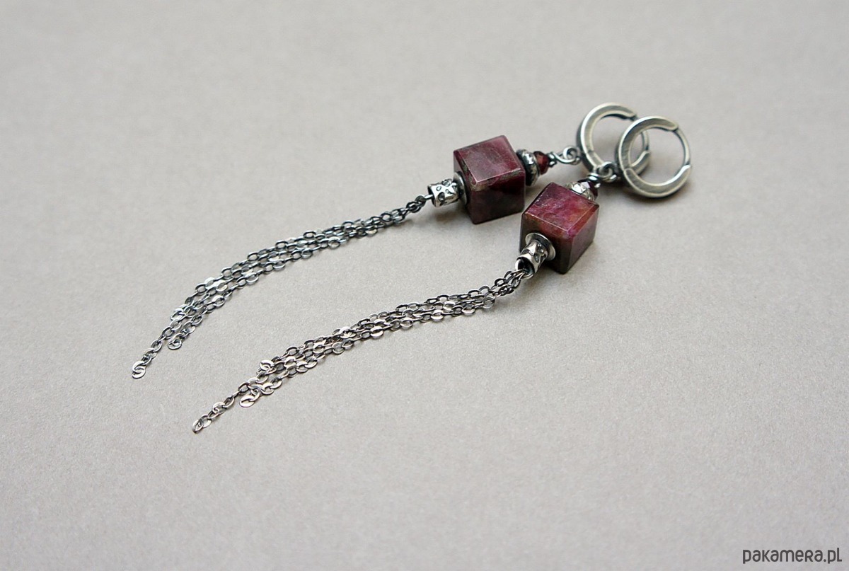 Kolczyki wykonane ze srebra [pr. 925] w połączeniu z kostkami bordowych turmalinów [9mm x 9mm], fasetowanymi kuleczkami granatów [4mm] oraz łańcuszkami. Całość oksydowana i przetarta. Całkowita długość kolczyków 9,3cm. Biżuteria ozdobnie zapakowana.