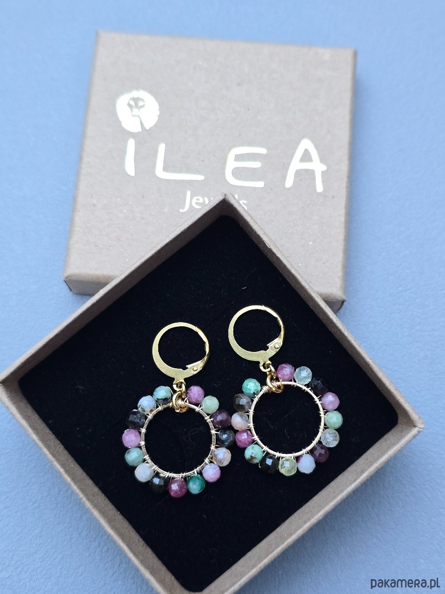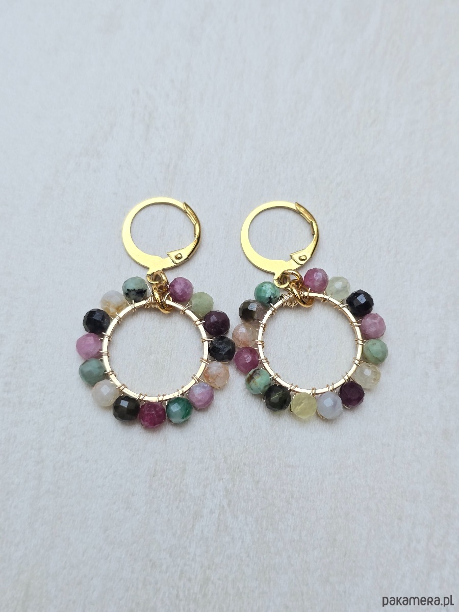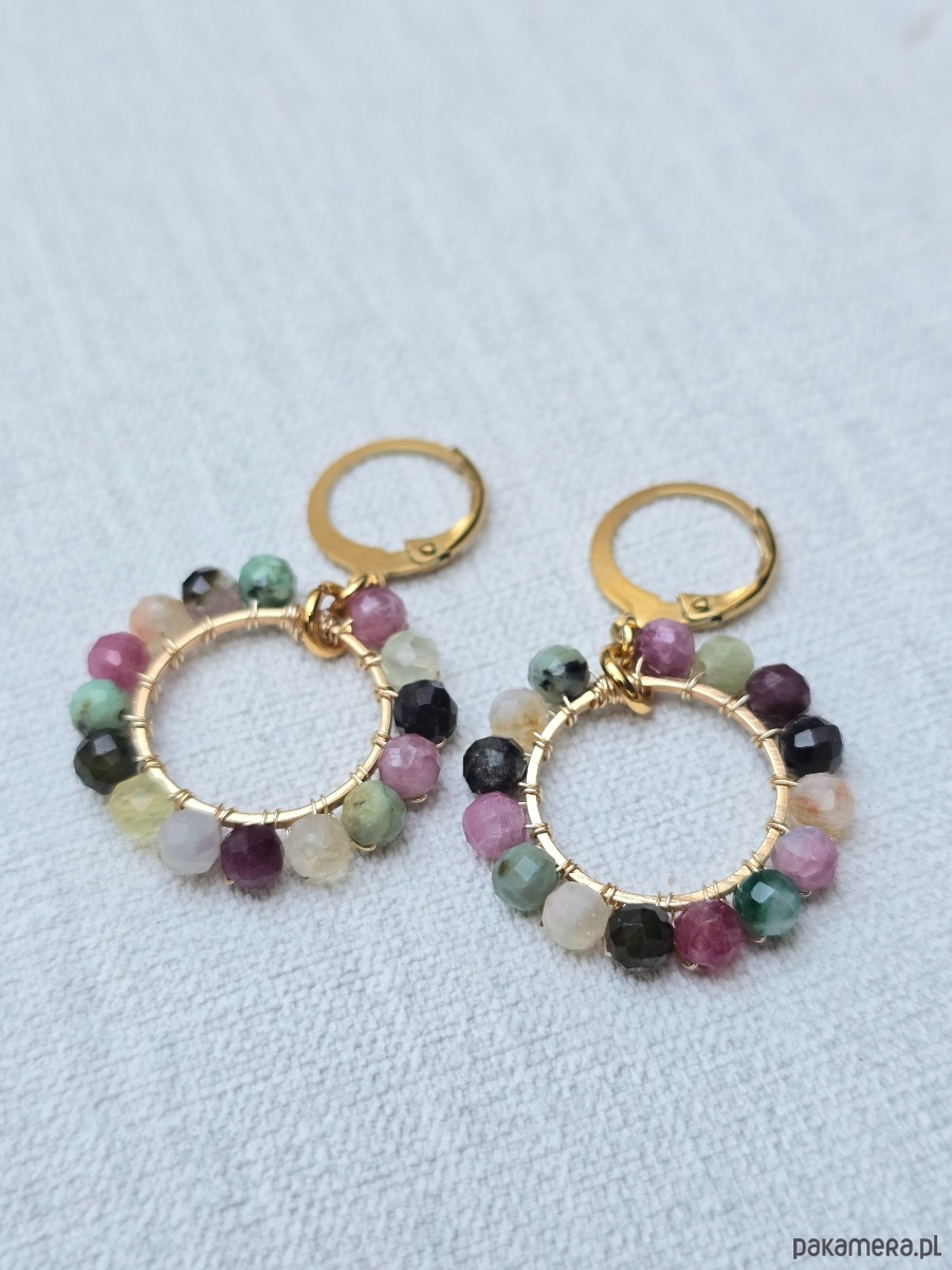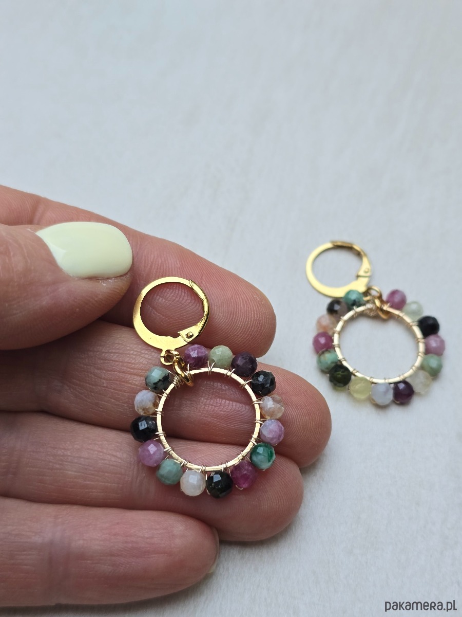 Wyjątkowe, plecione kolczyki. Wykonane z fasetowanych kolorowych turmalinów ok 3,5 mm.