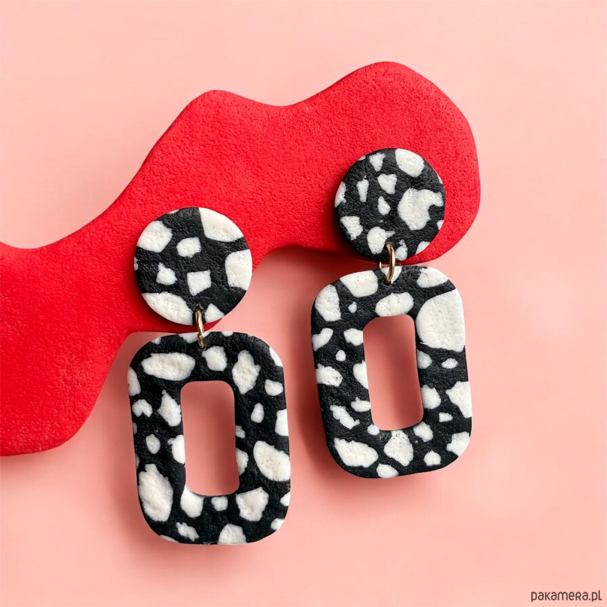 Oryginalne kolczyki wykonane ręcznie z dbałością o szczegóły z profesjonalnej glinki polimerowej, wypalane w piecu i szlifowane w domowej pracowni. Każda para kolczyków jest niepowtarzalna i wyjątkowa. Kolczyki są bardzo lekkie i wygodne, nie obciążają płatka ucha i przyciągają spojrzenia. Zapinane na sztyft ze stali chirurgicznej.