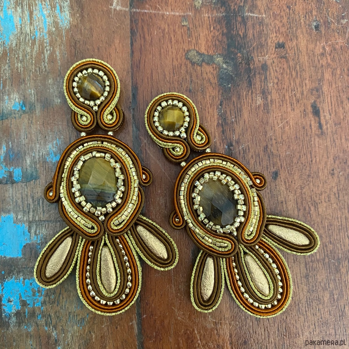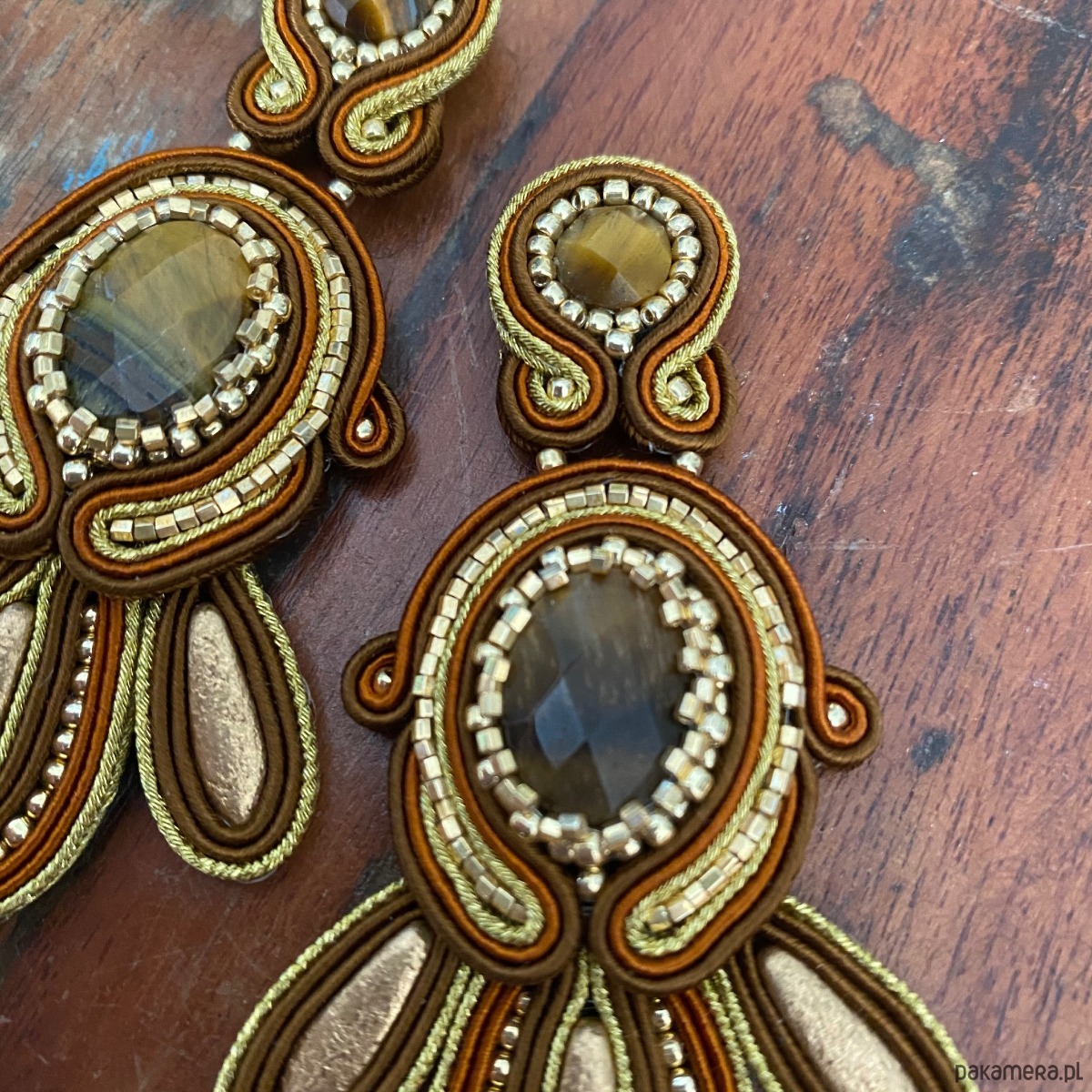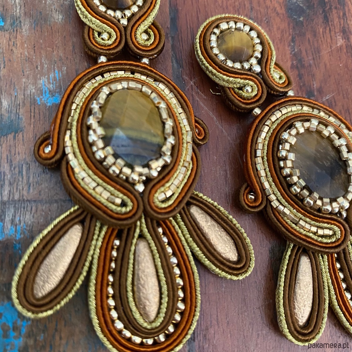 Kolczyki wykonane pracochłonną techniką haftu sutasz. Fasetowane kamienie tygrysiego oka otoczone są sznurkami sutasz i drobnymi koralikami toho. Kolczyki podklejone są naturalną skórą.rozmiar kolczyków :