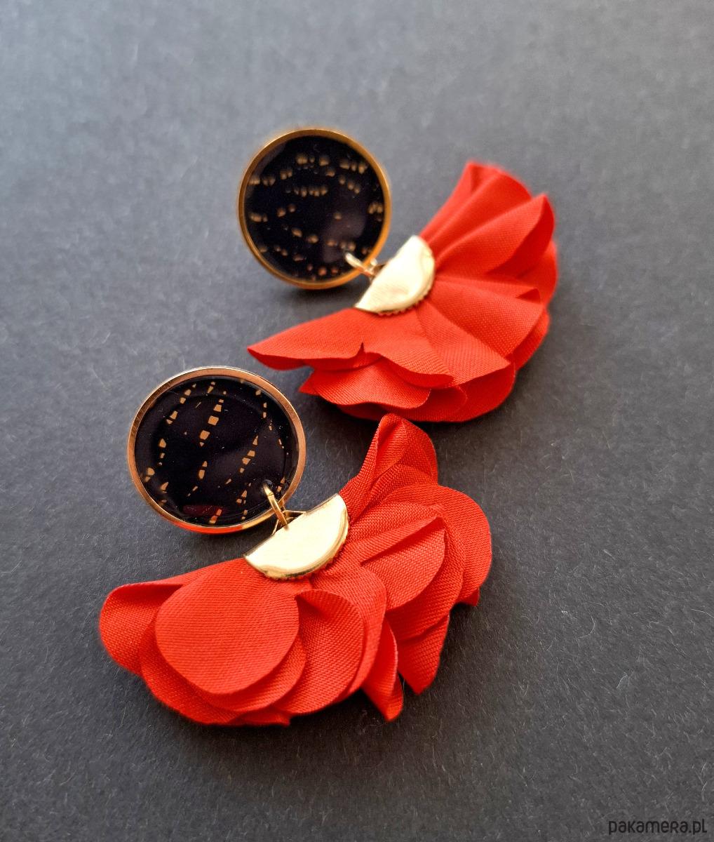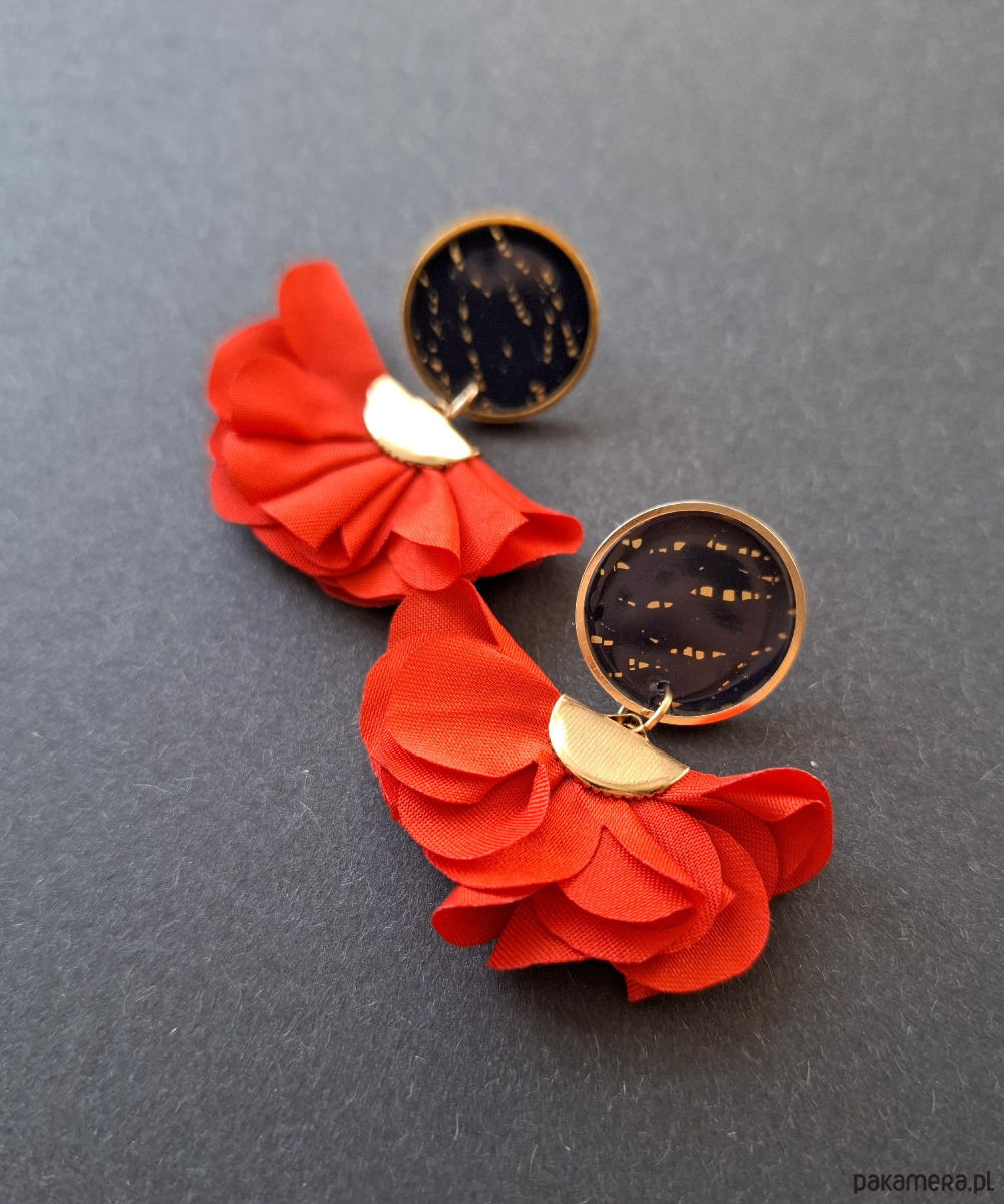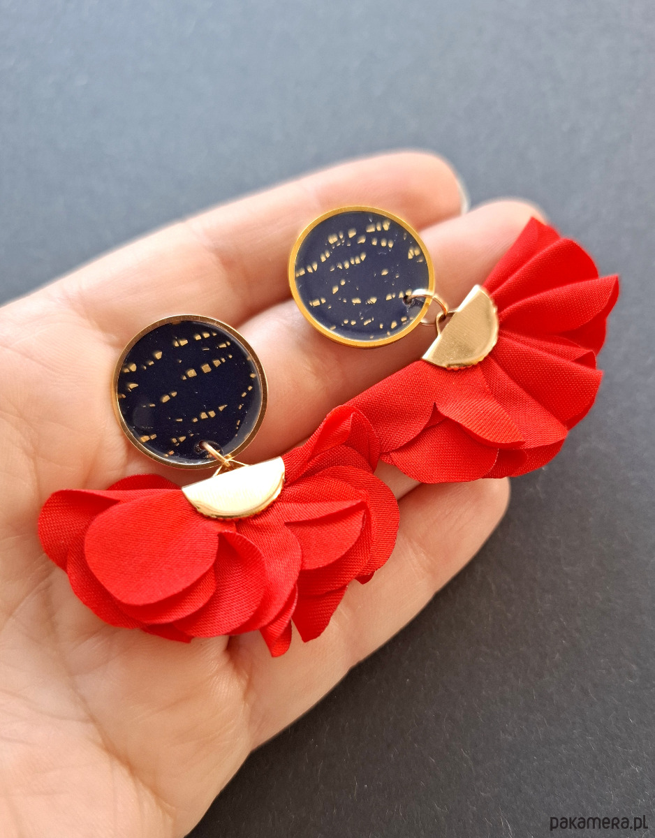 Ręcznie wykonane kolczyki na sztyfty, wykonane z wysokiej jakości glinki polimerowej w kolorze granatu z drobinkami złota, z podwieszonymi kwiatowymi ozdobami w kolorze czerwonym. Sztyfty pozłacane i nieuczulające, z zapięciem na klasyczne, metalowe baranki. Wymiary kolczyków: długość wraz z zapięciem: 4,7 cm, szerokość max. 4 cm. Wykonane w jedynym egzemplarzu.