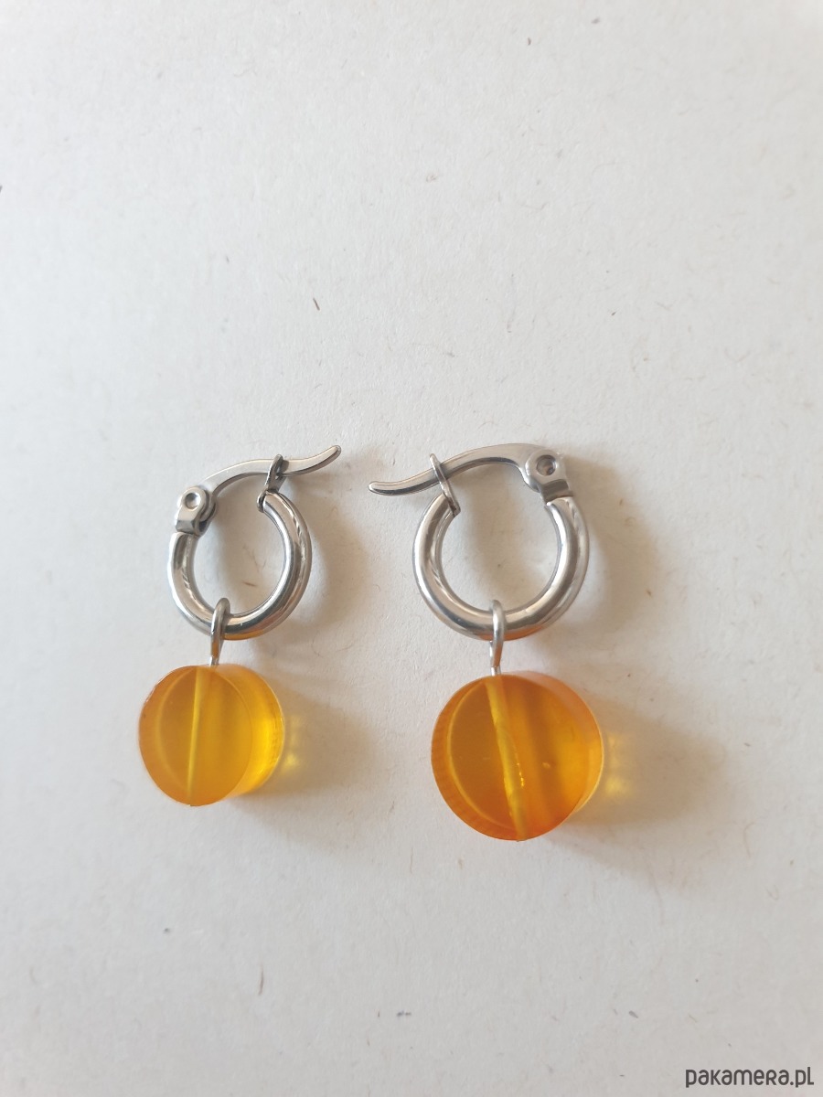 Wymiary: średnica kółka 1,2 cm, długość kolczyka z kamieniami ok 2,5 cm, średnica bursztynu ok. 1 cm,grubość 0,5 cm