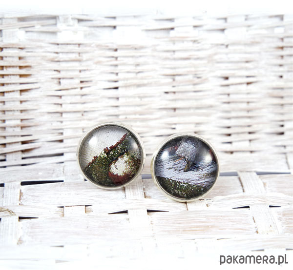 Ciekawa grafika ukryta w prostych, eterycznych kolczykach, pod osłoną przeźroczystego półokrągłego szkiełka.