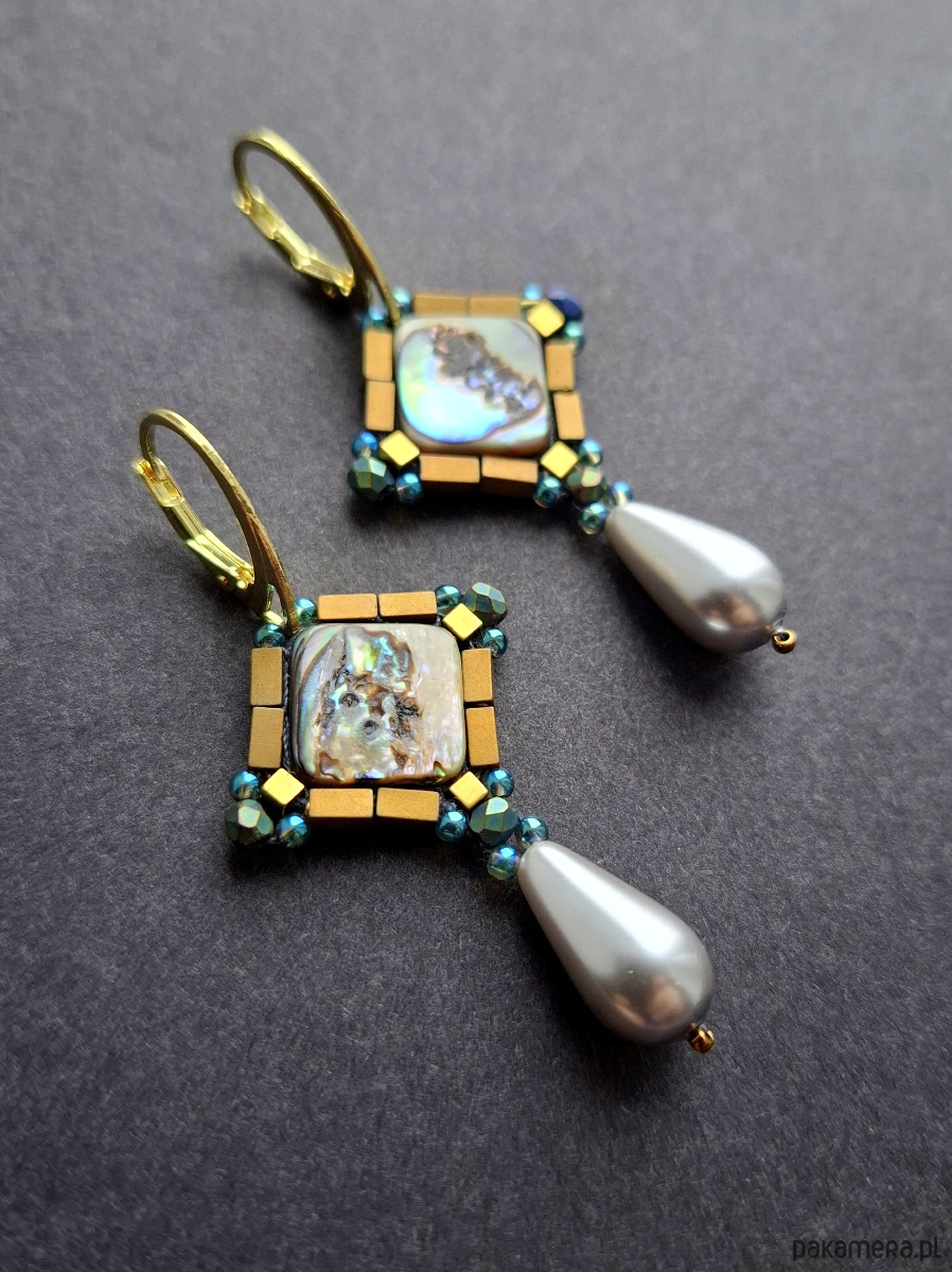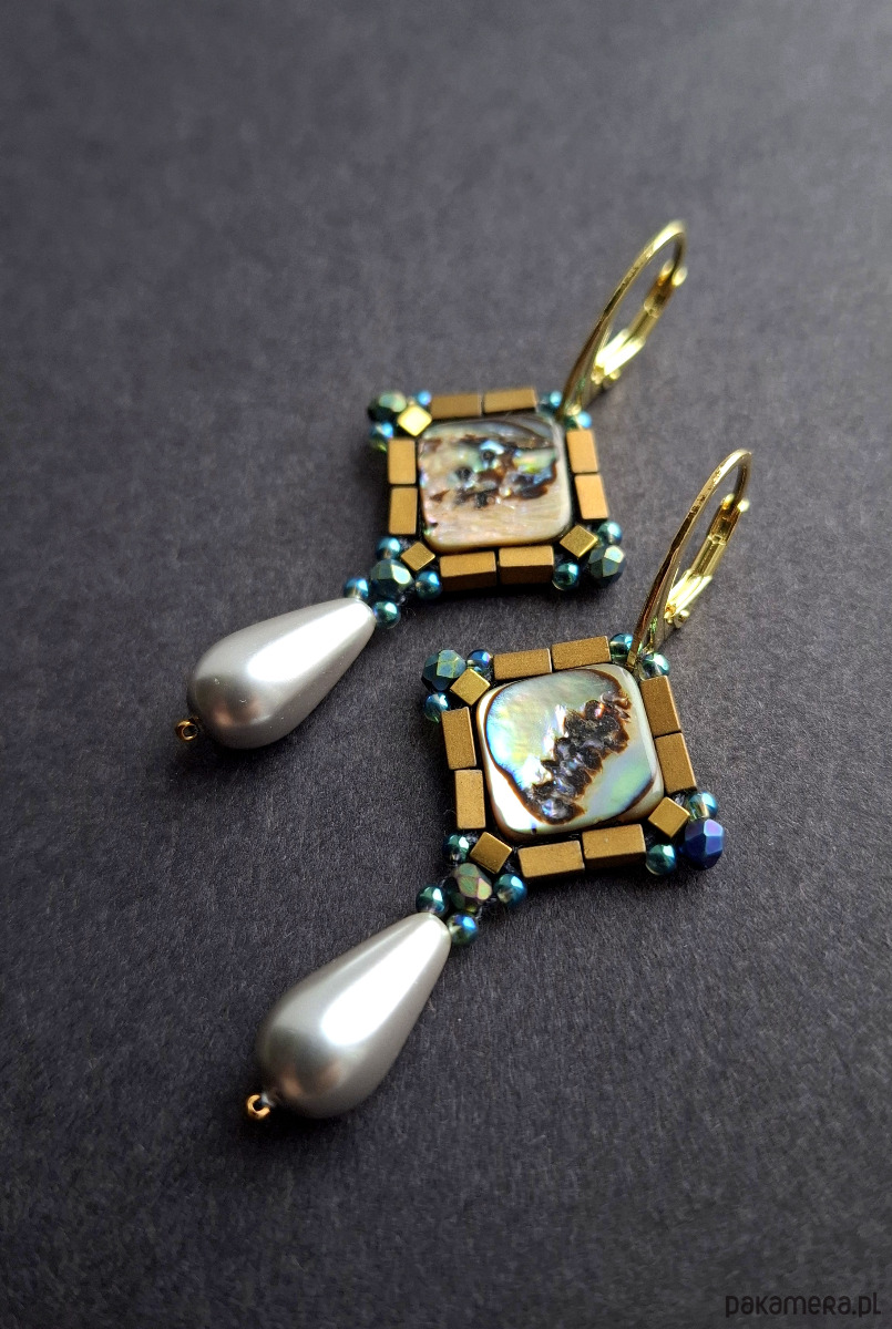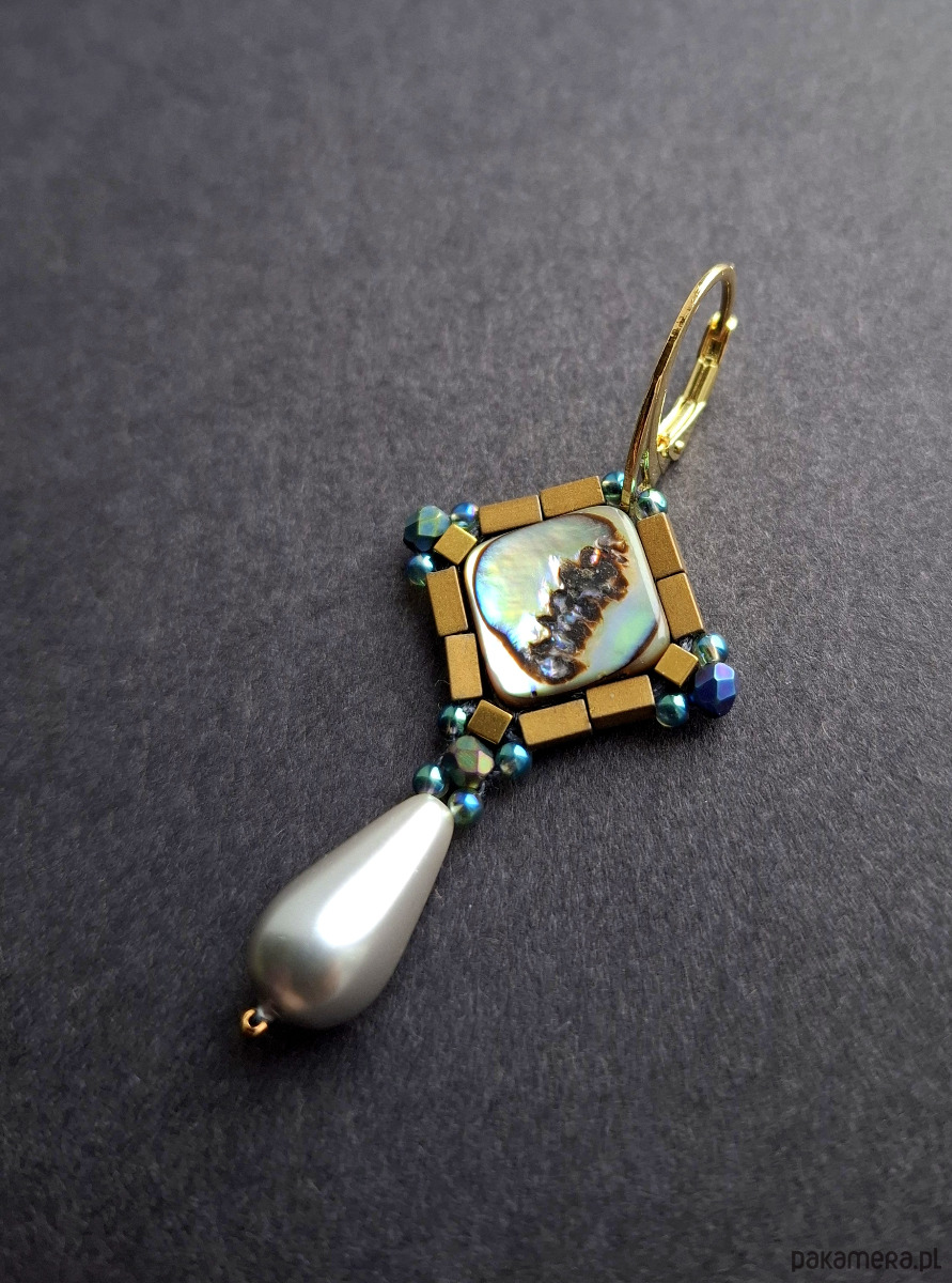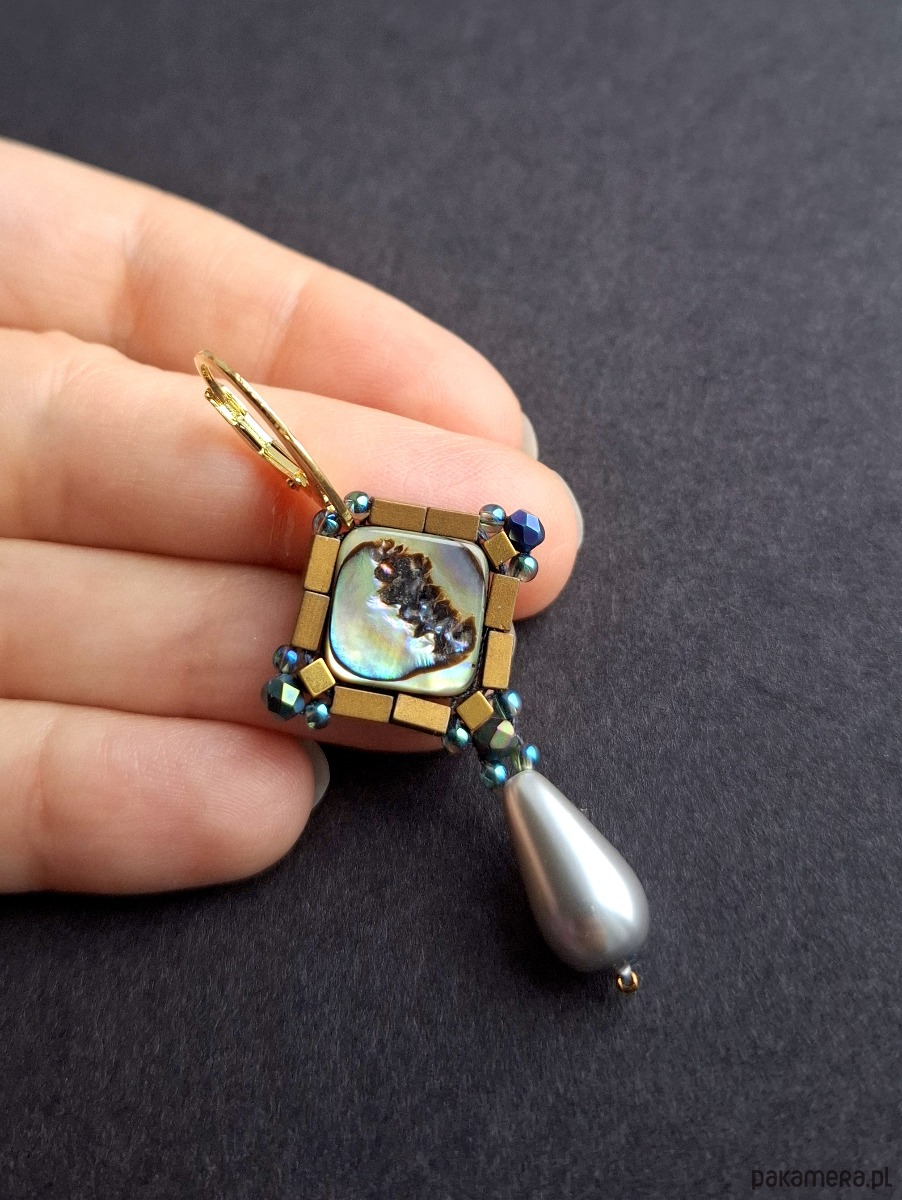 Kolczyki wiszące wykonane techniką swoistego haftu drobnymi, szklanymi koralikami w połączeniu z muszlą paua, hematytami platerowanymi oraz szklanymi kroplami pereł. Kolczyki dwustronne, podwieszone na pozłacanych i nieuczulających typu angielskiego. Wymiary kolczyków: długość wraz z zapięciem: 5,7 cm; szerokość max. 2,5 cm.
