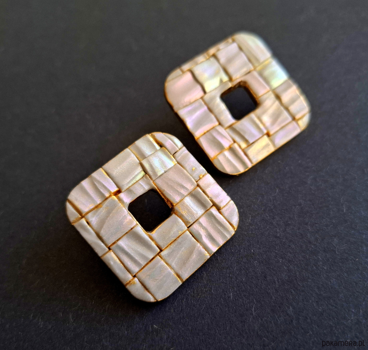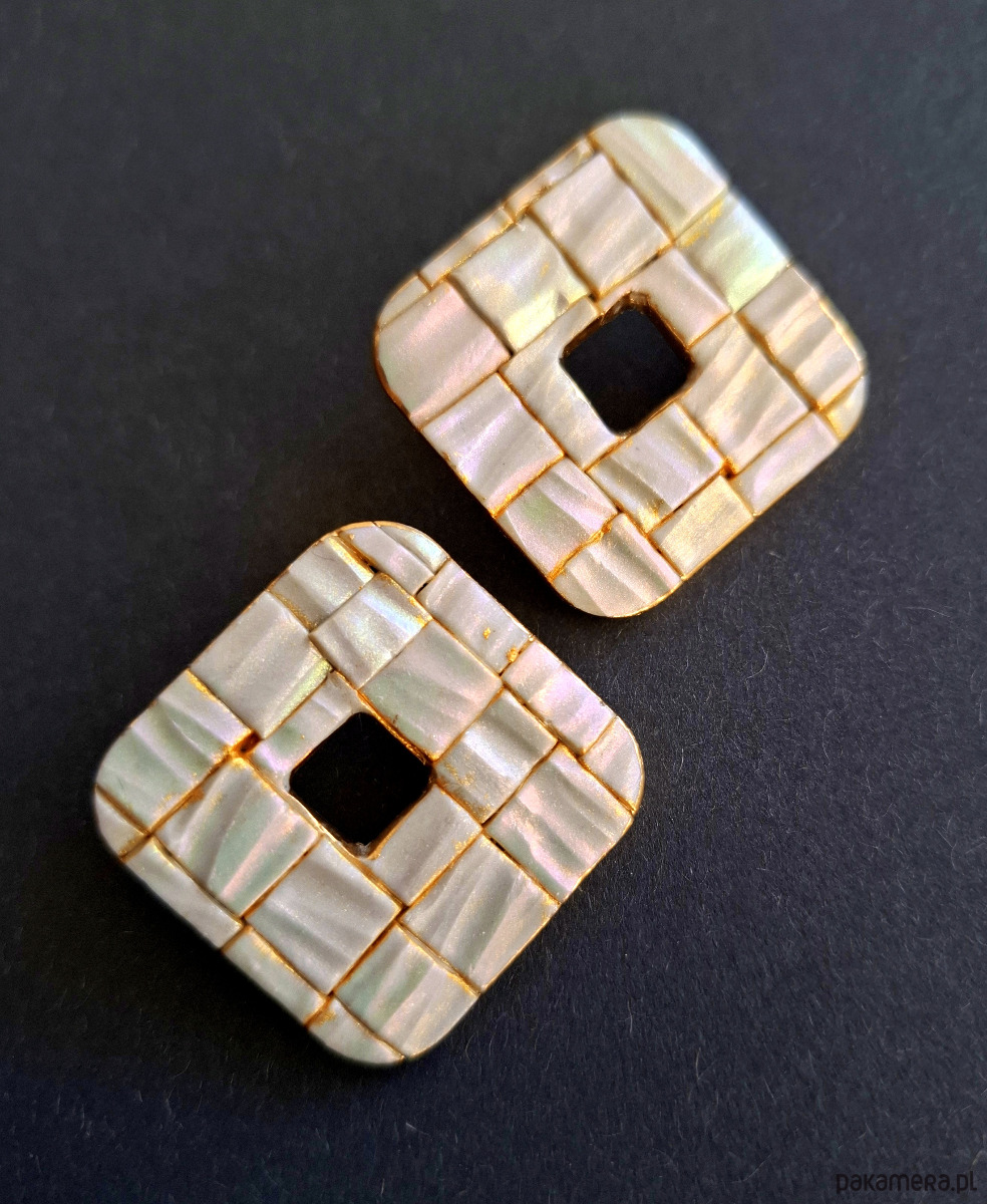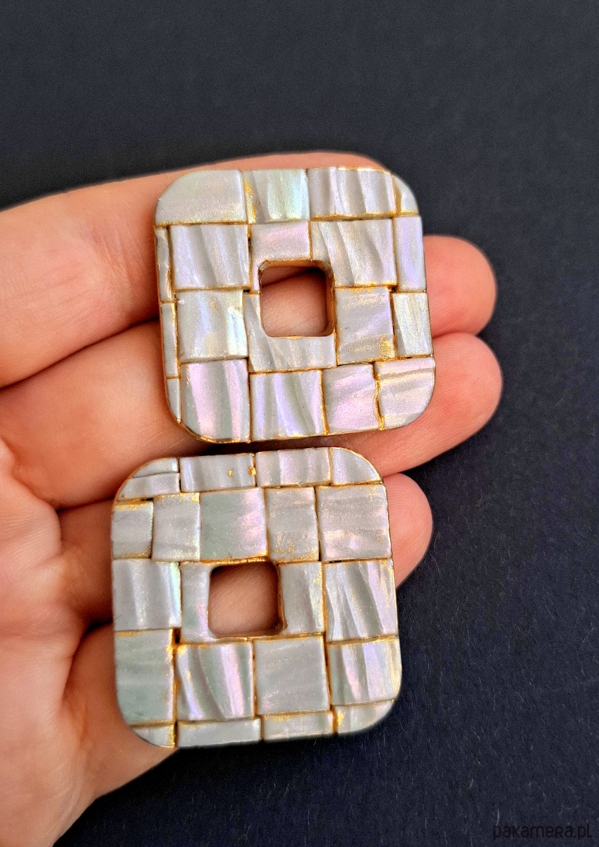Eleganckie kolczyki na sztyfty wykonane z wysokiej jakości glinki polimerowej w efekcie mieniące się różnymi barwami w zależności od kąta padania światła niczym mozaika z masy perłowej. Jednostronne z pozłacanymi, nieuczulającymi sztyftami. Wymiary: długość wraz z zapięciem: 3,1 cm; szerokość max. 3,1 cm.